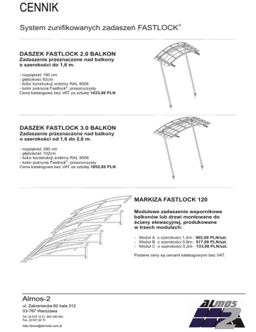 CENNIK System zunifikowanych zadaszeñ FASTLOCK ® DASZEK FASTLOCK 2.0 BALKON Zadaszenie przeznaczone nad balkony o szerokoúci do 1,6 m. 124 0 - rozpiætoúã 190 cm PLN - gùæbokoúã 82cm - kolor konstrukcji srebrny RAL 9006 - kolor pokrycia Fastlock®: przezroczysty Cena katalogowa bez VAT za sztukæ 1433,00 PLN DASZEK FASTLOCK 3.0 BALKON Zadaszenie przeznaczone nad balkony o szerokoúci od 1,6 do 2,6 m. - rozpiætoúã 290 cm - gùæbokoúã 102cm - kolor konstrukcji srebrny RAL 9006 - kolor pokrycia Fastlock®: przezroczysty Cena katalogowa bez VAT za sztukæ 1855,00 PLN LN P 15 1 LN P 48 4 MARKIZA FASTLOCK 120 Moduùowe zadaszenie wspornikowe balkonów lub drzwi montowane do úciany elewacyjnej, produkowane w trzech moduùach: - Moduù A o szerokoœci 1,4m - 902,00 PLN/szt. - Moduù B o szerokoœci 0,8m- 517,00 PLN/szt. - Moduù C o szerokoœci 0,2m- 133,00 PLN/szt. Podane ceny sà cenami katalogowymi bez VAT. Almos-2 ul. Zabraniecka 82 hala 312 03-787 Warszawa Tel. 22 678 12 01, 604 246 025 Fax. 22 651 02 70 http://[email protected] CENNIK 76 315 528 PLN PLN MARKIZA FASTLOCK 60 LOGGIA Moduùowe zadaszenie wspornikowe balkonów montowane do spodniej powierzchni pùyty balkonu lub loggi, produkowane w trzech moduùach: - Moduù A o szerokoœci 1,4m - 610,00 PLN/szt. - Moduù B o szerokoœci 0,8m- 365,00 PLN/szt. - Moduù C o szerokoœci 0,2m- 89,00 PLN/szt. Podane ceny sà cenami katalogowymi bez VAT. PLN Tabela doboru elementów ABC zadaszeñ typu: Markiza Fastlock 60 Loggia, Markiza Fastlock 120 Iloœæ szt. poszczególnych elementów D³ugoœæ potrzebnego zadaszenia [m] Element A Element B 1,4 m 0,8 m Element C 0,2 m 1,4 1 - - 1,8 1 - 2 2,2 1 1 - 2,6 1 1 2 3,0 1 2 - 3,4 1 2 2 3,8 1 3 - 4,2 1 3 2 4,6 1 4 - 5,0 1 4 2 5,4 1 5 - 5,8 1 5 2 6,2 1 6 - 6,6 1 6 2 7,0 1 7 - 7,4 1 7 2 7,8 1 8 - 8,2 1 8 2 8,6 1 9 - 9,0 1 9 2 9,4 1 10 - 9,8 1 10 2 Aby zbudowaæ zadaszenie o szerokoœci x mb nale¿y po³¹czyæ ze sob¹: element A + wielokrotnoœæ elementu B + wielokrotnoœæ elementu C. Odpowiednie iloœci elementów mo¿na okreœliæ z tabeli. W sk³ad zadaszenia wchodzi zawsze Element A oraz odpowiednie przed³u¿enia czyli Elementy B i C Almos-2 ul. Zabraniecka 82 hala 312 03-787 Warszawa Tel. 22 678 12 01, 604 246 025 Fax. 22 651 02 70 http://[email protected]