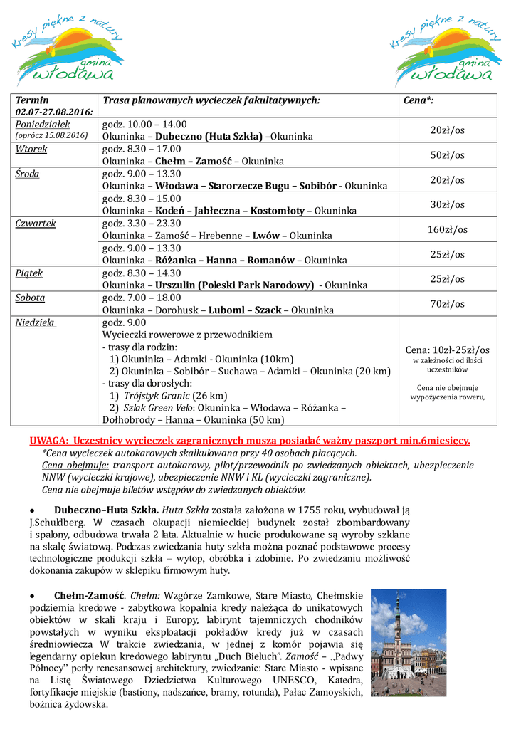 Termin Trasa planowanych wycieczek fakultatywnych: Poniedziałek godz. 10.00 – 14.00 Okuninka – Dubeczno (Huta Szkła) –Okuninka godz. 8.30 – 17.00 Okuninka – Chełm – Zamość – Okuninka godz. 9.00 – 13.30 Okuninka – Włodawa – Starorzecze Bugu – Sobibór - Okuninka godz. 8.30 – 15.00 Okuninka – Kodeń – Jabłeczna – Kostomłoty – Okuninka godz. 3.30 – 23.30 Okuninka – Zamość – Hrebenne – Lwów – Okuninka godz. 9.00 – 13.30 Okuninka – Różanka – Hanna – Romanów – Okuninka godz. 8.30 – 14.30 Okuninka – Urszulin (Poleski Park Narodowy) - Okuninka godz. 7.00 – 18.00 Okuninka – Dorohusk – Luboml – Szack – Okuninka godz. 9.00 Wycieczki rowerowe z przewodnikiem - trasy dla rodzin: 1) Okuninka – Adamki - Okuninka (10km) 2) Okuninka – Sobibór – Suchawa – Adamki – Okuninka (20 km) - trasy dla dorosłych: 1) Trójstyk Granic (26 km) 2) Szlak Green Velo: Okuninka – Włodawa – Różanka – Dołhobrody – Hanna – Okuninka (50 km) 02.07-27.08.2016: (oprócz 15.08.2016) Wtorek Środa Czwartek Piątek Sobota Niedziela Cena*: 20zł/os 50zł/os 20zł/os 30zł/os 160zł/os 25zł/os 25zł/os 70zł/os Cena: 10zł-25zł/os w zależności od ilości uczestników Cena nie obejmuje wypożyczenia roweru, UWAGA: Uczestnicy wycieczek zagranicznych muszą posiadać ważny paszport min.6miesięcy. *Cena wycieczek autokarowych skalkulowana przy 40 osobach płacących. Cena obejmuje: transport autokarowy, pilot/przewodnik po zwiedzanych obiektach, ubezpieczenie NNW (wycieczki krajowe), ubezpieczenie NNW i KL (wycieczki zagraniczne). Cena nie obejmuje biletów wstępów do zwiedzanych obiektów. Dubeczno–Huta Szkła. Huta Szkła została założona w 1755 roku, wybudował ją J.Schuldberg. W czasach okupacji niemieckiej budynek został zbombardowany i spalony, odbudowa trwała 2 lata. Aktualnie w hucie produkowane są wyroby szklane na skalę światową. Podczas zwiedzania huty szkła można poznać podstawowe procesy technologiczne produkcji szkła – wytop, obróbka i zdobinie. Po zwiedzaniu możliwość dokonania zakupów w sklepiku firmowym huty. Chełm-Zamość. Chełm: Wzgórze Zamkowe, Stare Miasto, Chełmskie podziemia kredowe - zabytkowa kopalnia kredy należąca do unikatowych obiektów w skali kraju i Europy, labirynt tajemniczych chodników powstałych w wyniku eksploatacji pokładów kredy już w czasach średniowiecza W trakcie zwiedzania, w jednej z komór pojawia się legendarny opiekun kredowego labiryntu „Duch Bieluch”. Zamość – „Padwy Północy” perły renesansowej architektury, zwiedzanie: Stare Miasto - wpisane na Listę Światowego Dziedzictwa Kulturowego UNESCO, Katedra, fortyfikacje miejskie (bastiony, nadszańce, bramy, rotunda), Pałac Zamoyskich, bożnica żydowska. Włodawa – Starorzecze Bugu (Orchówek) – Sobibór. Włodawa zwiedzanie tzw. „czworoboku”, synagogi barokowej (jeden z najcenniejszych zabytków sakralnej architektury żydowskiej w Polsce), cerkwi prawosławna p.w. Narodzenia NMP (zbudowana na planie krzyża greckiego), klasztoru O.O. Paulinów (z 6 monumentalnymi rzeźbami Ojców Kościoła), punktu pomiaru wody na Bugu, Orchówek – spacer wzdłuż zakola Bugu, Sobibór – wizyta w obozie zagłady. Kodeń-Jabłeczna-Kostomłoty „Szlak Przenikania Kultur”. Kodeń- sanktuarium Maryjne, które zasłynęło z obrazu Madonny wykradzionego z kaplicy papieskiej w Rzymie przez Mikołaja Sapiehę; zwiedzanie Bazyliki p. w. św. Anny, Cerkwi gotyckiej p.w. św. Ducha; Jabłeczna -męski monastyr prawosławny; zwiedzanie cerkwi (XIX w.) p. w. św. Onufrego; Kostomłoty -nadbużańska wieś z drewnianą cerkwią prawosławną (XVII/XVIII w.). Lwów „Florencja Wschodu”- zwiedzanie Starówki Lwowskiej wpisanej na Listę Światowego Dziedzictwa UNESCO, kościół dominikanów, kamieniczki w Rynku, Ratusz, Kaplicy Boimów, Hotel George, pomnik Adama Mickiewicza, Katedry Ormiańskiej, Katedry Unickiej, Opery Lwowskiej, Cmentarza Łyczakowskiego, Cmentarza Orląt Lwowskich. Różanka-Hanna-Romanów. Różanka wspaniałe pozostałości rezydencji Zamoyskich, malownicze zakole Bugu, na obszarze 12 ha parku rośnie 600 drzew, w tym wiele egzotycznych. Hanna – cenny zespół cerkiewny obecnie kościół rzymsko-katolicki p.w. Piotra i Pawła. Ściany kościoła zdobiła polihromia, malowana na płótnie naklejonym na deskach z poł. XVIIIw. Romanów – piękny zespół dworki i muzeum Józefa Kraszewskiego, który spędził w rodzinnym majątku dzieciństwo. Urszulin - Poleski Park Narodowy. Park położony jest na rozległych przestrzeniach bagien torfowisk Polesia. Teren Parku to namiastka tundry bądź lasotundry, wysunięta najdalej na południowy zachód Europy. Punktem wyjściowym pracy edukacyjnej w PPN jest Muzeum w Zaułczu Starym, zaś kolejnym narzędziem edukacji są ścieżki przyrodnicze dające możliwość realizacji różnorodnych zajęć tematycznych. Spacer ścieżka przyrodniczo-dydaktyczną „Spławy” bądź „Perehod”. Luboml-Szack „Szackich Jezior Błękit”. Pojezierze Szackie składa się z 30 jezior i zlokalizowane jest w międzyrzeczu Bugu oraz Prypieci. Największym jeziorem tego pojezierza jest Jezioro Świteź o powierzchni około 27 km², które jest drugim co do wielkości naturalnym akwenem Ukrainy. Zakupy w strefie przygranicznej. Zwiedzanie przygranicznego miasta Lubomli.