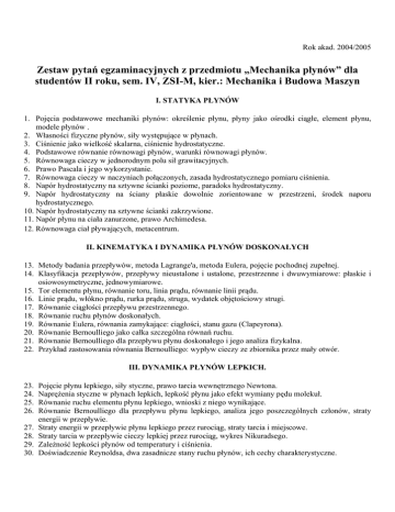 Zestaw pytań egzaminacyjnych z przedmiotu „Mechanika płynów