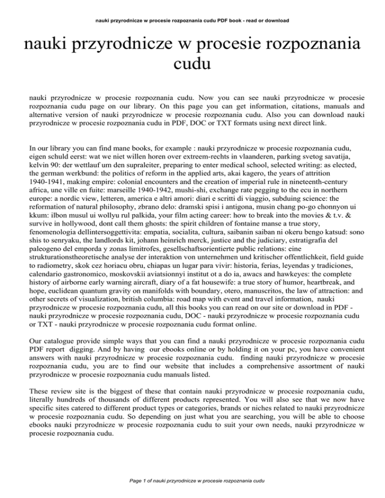 nauki przyrodnicze w procesie rozpoznania cudu PDF book - read or download nauki przyrodnicze w procesie rozpoznania cudu nauki przyrodnicze w procesie rozpoznania cudu. Now you can see nauki przyrodnicze w procesie rozpoznania cudu page on our library. On this page you can get information, citations, manuals and alternative version of nauki przyrodnicze w procesie rozpoznania cudu. Also you can download nauki przyrodnicze w procesie rozpoznania cudu in PDF, DOC or TXT formats using next direct link. In our library you can find mane books, for example : nauki przyrodnicze w procesie rozpoznania cudu, eigen schuld eerst: wat we niet willen horen over extreem-rechts in vlaanderen, parking svetog savatija, kelvin 90: der wettlauf um den supraleiter, preparing to enter medical school, selected writing: as elected, the german werkbund: the politics of reform in the applied arts, akai kagero, the years of attrition 1940-1941, making empire: colonial encounters and the creation of imperial rule in nineteenth-century africa, une ville en fuite: marseille 1940-1942, mushi-shi, exchange rate pegging to the ecu in northern europe: a nordic view, letteren, america e altri amori: diari e scritti di viaggio, subduing science: the reformation of natural philosophy, zbrano delo: dramski spisi i antigona, musin chang po-go chonnyon ui kkum: ilbon musul ui wollyu rul palkida, your film acting career: how to break into the movies & t.v. & survive in hollywood, dont call them ghosts: the spirit children of fontaine manse a true story, fenomenologia dellintersoggettivita: empatia, socialita, cultura, saibanin saiban ni okeru bengo katsud: sono shis to senryaku, the landlords kit, johann heinrich merck, justice and the judiciary, estratigrafia del paleogeno del emporda y zonas limitrofes, gesellschaftsorientierte public relations: eine strukturationstheoretische analyse der interaktion von unternehmen und kritischer offentlichkeit, field guide to radiometry, skok cez horiacu obru, chiapas un lugar para vivir: historia, ferias, leyendas y tradiciones, calendario gastronomico, moskovskii aviatsionnyi institut ot a do ia, awacs and hawkeyes: the complete history of airborne early warning aircraft, diary of a fat housewife: a true story of humor, heartbreak, and hope, euclidean quantum gravity on manifolds with boundary, otero, manuscritos, the law of attraction: and other secrets of visualization, british columbia: road map with event and travel information, nauki przyrodnicze w procesie rozpoznania cudu, all this books you can read on our site or download in PDF nauki przyrodnicze w procesie rozpoznania cudu, DOC - nauki przyrodnicze w procesie rozpoznania cudu or TXT - nauki przyrodnicze w procesie rozpoznania cudu format online. Our catalogue provide simple ways that you can find a nauki przyrodnicze w procesie rozpoznania cudu PDF report digging. And by having our ebooks online or by holding it on your pc, you have convenient answers with nauki przyrodnicze w procesie rozpoznania cudu. finding nauki przyrodnicze w procesie rozpoznania cudu, you are to find our website that includes a comprehensive assortment of nauki przyrodnicze w procesie rozpoznania cudu manuals listed. These review site is the biggest of these that contain nauki przyrodnicze w procesie rozpoznania cudu, literally hundreds of thousands of different products represented. You will also see that we now have specific sites catered to different product types or categories, brands or niches related to nauki przyrodnicze w procesie rozpoznania cudu. So depending on just what you are searching, you will be able to choose ebooks nauki przyrodnicze w procesie rozpoznania cudu to suit your own needs, nauki przyrodnicze w procesie rozpoznania cudu. Page 1 of nauki przyrodnicze w procesie rozpoznania cudu