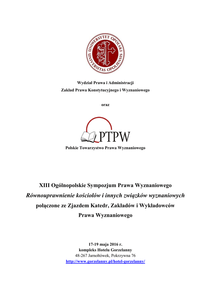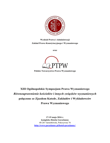 Wydział Prawa i Administracji Zakład Prawa Konstytucyjnego i Wyznaniowego oraz Polskie Towarzystwo Prawa Wyznaniowego XIII Ogólnopolskie Sympozjum Prawa Wyznaniowego Równouprawnienie kościołów i innych związków wyznaniowych połączone ze Zjazdem Katedr, Zakładów i Wykładowców Prawa Wyznaniowego 17-19 maja 2016 r. kompleks Hotelu Gorzelanny 48-267 Jarnołtówek, Pokrzywna 76 http://www.gorzelanny.pl/hotel-gorzelanny/ WTOREK 17 MAJA 2016 R. 12.00 obiad w Hotelu Gorzelanny 13.00 Uroczyste otwarcie sympozjum (sala kinowa Hotelu Gorzelanny) Wystąpienie Dziekana Wydziału Prawa i Administracji Uniwersytetu Opolskiego prof. UO dr hab. P. Steca Wystąpienie Prezesa Polskiego Towarzystwa Prawa Wyznaniowego prof. dr hab. T J. Zielińskiego SESJA I Moderacja prof. dr hab. Wacław Uruszczak (Uniwersytet Jagielloński) 13.30 prof. dr hab. Tadeusz J. Zieliński (Chrześcijańska Akademia Teologiczna w Warszawie), Dyskryminacja katolików w prawie angielskim 13.50 prof. UR dr hab. Piotr Steczkowski (Uniwersytet równouprawnienia podmiotów wyznaniowych w Federacji Rosyjskiej Rzeszowski), Problem 14.10 dr Jerzy Nikołajew (Wyższa Szkoła Stosunków Międzynarodowych i Komunikacji Społecznej w Chełmie), Równouprawnienie organizacji religijnych na Ukrainie. Deklaracja czy rzeczywistość? 14.30 dr Konrad Walczuk (Uniwersytet Przyrodniczo-Humanistyczny Równouprawnienie związków wyznaniowych w prawie słowackim w Siedlcach), 14.50 przerwa kawowa Moderacja prof. UO dr hab. Piotr Stec (Uniwersytet Opolski) 15.20 mgr Jakub Cupriak (Chrześcijańska Akademia Teologiczna w Warszawie), Równouprawnienie kościołów i innych związków wyznaniowych w orzecznictwie niemieckiego Federalnego Sądu Konstytucyjnego 15.40 dr Katarzyna Krzysztofek (Uniwersytet Jagielloński), Dopuszczalność stosowania prawa szariatu w zakresie spraw rozwodowych i spadkowych w prawodawstwie Unii Europejskiej 16.00 dr Maciej Kubala (Uniwersytet Warmińsko-Mazurski), Zasada równouprawnienia kościołów i innych związków wyznaniowych w konstytucjach państw europejskich. Studium porównawcze 16.20 dr Anna Słowik (Państwowa Wyższa Szkoła Zawodowa im. S. Pigonia w Krośnie), Równouprawnienie mniejszości wyznaniowych w wybranych państwach Afryki północno-wschodniej 16.40 dyskusja 18.30 Walne Zgromadzenie Polskiego Towarzystwa Prawa Wyznaniowego 20.00 kolacja w Hotelu Gorzelanny ŚRODA 18 MAJA 2016 R. 8.30 śniadanie w Hotelu Gorzelanny SESJA II A Moderacja dr hab. Zdzisław Zarzycki (Uniwersytet Jagielloński) 9.00 dr Michał Skwarzyński (Katolicki Uniwersytet Lubelski Jana Pawła II), Granice korzystania ze sprzeciwu sumienia w kontekście równouprawnienia 9.20 mgr Marek Strzała (Uniwersytet Jagielloński), Przestępstwo złośliwego przeszkadzania publicznemu wykonywaniu aktu religijnego a zasada równouprawnienia kościołów i innych związków wyznaniowych 9.40 dr Bartłomiej Pieron (Uniwersytet Papieski Jana Pawła II w Krakowie), Równe czy identyczne traktowanie osób duchownych w prawie polskim 10.00 dr Krystyna Ziółkowska (Uniwersytet Warmińsko-Mazurski), Zakaz dyskryminacji w zatrudnieniu przez kościoły i inne związki wyznaniowe 10.20 przerwa kawowa Moderacja prof. UO dr hab. Dariusz Walencik (Uniwersytet Opolski) 11.00 prof. dr hab. Artur Mezglewski (Uniwersytet Opolski), Cechy relewantne uzasadniające odmienne traktowanie nauczycieli religii 11.20 dr hab. Anna Tunia (Katolicki Uniwersytet Lubelski Jana Pawła II), Zwolnienie z zajęć szkolnych w celu odbycia rekolekcji wielkopostnych a poszanowanie zasady równouprawnienia kościołów i innych związków wyznaniowych 11.40 mgr Michał Ożóg (Uniwersytet Jagielloński), Prawo chorego do korzystania z posługi duszpasterskiej w świetle konstytucyjnej zasady równouprawnienia kościołów i innych związków wyznaniowych w Polsce 12.00 dyskusja 13.30 obiad w Hotelu Gorzelanny 14.00 chwila relaksu (sala fitness, basen, jacuzzi, sauna sucha, łaźnia parowa – do wyboru) ŚRODA 18 MAJA 2016 R. 8.30 śniadanie w Hotelu Gorzelanny SESJA II B Moderacja prof. KUL dr hab. Piotr Stanisz (Katolicki Uniwersytet Lubelski Jana Pawła II) 9.00 prof. UO dr hab. Józef Koredczuk (Uniwersytet Opolski), Równouprawnienie kościołów i związków religijnych według Konstytucji marcowej z 1921 r. 9.20 prof. UO dr hab. Paweł Sobczyk (Uniwersytet Opolski), Konstytucyjna zasada równouprawnienia kościołów i innych związków w interpretacji Trybunału Konstytucyjnego 9.40 mgr Marcin Olszówka (Uczelnia Łazarskiego w Warszawie), Bilateralność jako wyjątek od równouprawnienia związków religijnych 10.00 mgr Rafał Kaczmarczyk (Uniwersytet Warszawski), Status prawny i faktyczny muzułmańskich związków wyznaniowych w Polsce 10.20 przerwa kawowa Moderacja prof. dr hab. Tadeusz J. Zieliński (Chrześcijańska Akademia Teologiczna w Warszawie) 11.00 dr Justyna Krzywkowska (Uniwersytet Warmińsko-Mazurski), Nauczanie religii w szkołach publicznych w Polsce a zasada równouprawnienia kościołów i innych związków wyznaniowych 11.20 prof. UO dr hab. Andrzej Szymański (Uniwersytet Opolski), Funkcjonowanie duszpasterstw więziennych wyrazem równouprawnienia kościołów i innych związków wyznaniowych w Polsce 11.40 dr Michał Poniatowski (Uniwersytet Kardynała Stefana Wyszyńskiego w Warszawie), Zasada równouprawnienia związków wyznaniowych w kontekście ich działalności charytatywnoopiekuńczej 12.00 prof. UWM dr hab. Mieczysław Różański (Uniwersytet Warmińsko-Mazurski), Archiwa kościołów i innych związków wyznaniowych w Polsce a zasada równouprawnienia 12.20 mgr Marek Paszkowski (Uniwersytet Warmińsko-Mazurski), Ochrona dóbr kultury w świetle zasady równouprawnienia kościołów i innych związków wyznaniowych w Polsce 12.40 dr hab. Tomasz Rakoczy (Akademia Ignatianum w Krakowie), Równouprawnienie kościołów i związków wyznaniowych w prawie do środków społecznego przekazu 13.00 dyskusja 13.30 obiad w Hotelu Gorz