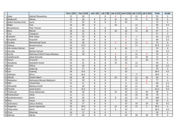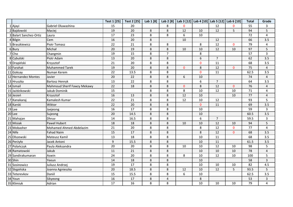 1 2 3 4 5 6 7 8 9 10 11 12 13 14 15 16 17 18 19 20 21 22 23 24 25 26 27 28 29 30 31 32 33 34 35 Ajayi Bajdowski Balart Sanchez-Ortiz Bilgin Braszkiewicz Bury Cho Cybulski Drapiński Farahat Goksay Hernandez Montes Hruszka Ismail Jaździkowski Jesień Kanakaraj Karski Lee Lee Mahajan Misiak Mobasher Nife Olszewski Perżyło Polańczyk Ramatowski Sandirakumaran Shin Sosinowicz Stępińska Teterevkov Youn Klimiuk Gabriel Oluwashina Maciej Laura Cem Piotr Tomasz Michał Changmin Piotr Adam Krzysztof Muhammed Tarek Numan Kerem Javier Bartosz Henryk Mahmoud Sherif Fawzy Mekawy Jakub Dominik Krzysztof Kamalesh Kumar Wiktor Jaejeong Sujeong Dhruv Paweł Hubert Mohamed Ahmed Abdelazim Fahad Naim Mateusz Kamil Jacek Antoni Paula Aleksandra Jakub Aswin Yeeun Juliusz Andrzej Joanna Agnieszka Daniil Sikyeong Adrian Test 1 [25] 15 19 17 16 22 20 19 13 21 19 22 20 13 22 15 16 22 22 16 20 14 18 21 15 13 9 20 11 24 14 19 20 15 16 17 Test 2 [25] 20 20 23 20 21 19 15 20 20 20 13.5 22 22 18 13 21 20 17 14.5 16.5 18 20 17 18 15.5 20 21 20 18 17 18.5 15.5 17 16 Lab 1 [8] 8 8 8 8 8 8 8 8 8 8 8 8 8 8 8 8 8 8 8 8 8 8 8 8 8 8 8 8 8 8 8 8 8 8 Lab 2 [8] Lab 3 [12] Lab 4 [10] Lab 5 [12] Lab 6 [10] 8 0 12 0 8 12 10 12 5 8 6 10 10 12 8 8 12 0 8 10 10 12 10 7 8 8 6 7 8 0 11 8 0 8 12 0 8 0 11 8 6 10 8 6 7 8 0 8 12 0 8 8 10 12 10 8 12 10 10 8 12 10 12 8 0 11 8 10 8 10 8 6 7 8 10 10 12 10 8 8 12 0 8 8 12 0 8 10 11 8 10 11 8 10 10 12 10 8 10 10 10 8 8 10 12 10 8 10 8 10 10 10 8 12 10 12 5 8 6 10 4 8 8 10 10 10 Total 55 94 72 66 79 97 57 62 68 75 62.5 74 64 76 71 77 93 69 59 60.5 59.5 94 77 68 68 61.5 98 78 100 58 82 93.5 62.5 53 79 Grade 3 5 4 3.5 4 5 3 3.5 3.5 4 3.5 4 3.5 4 4 4 5 3.5 3 3.5 3 5 4 3.5 3.5 3.5 5 4 5 3 4.5 5 3.5 3 4