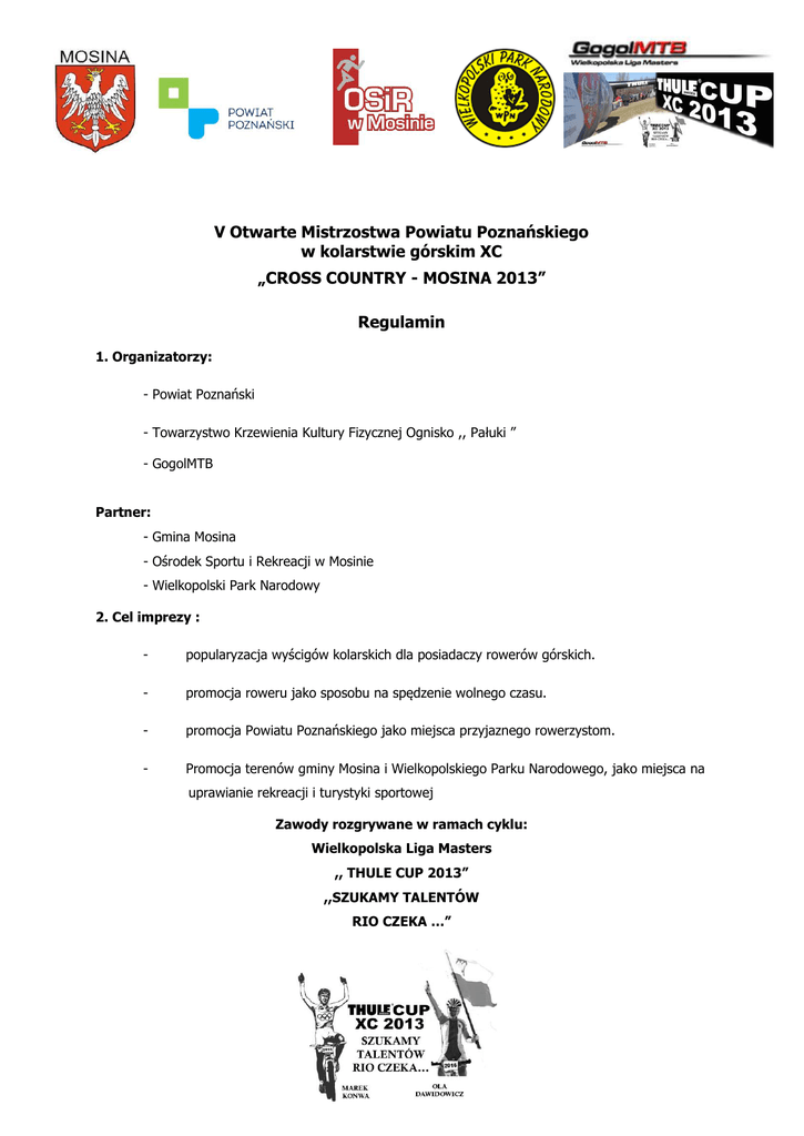 V Otwarte Mistrzostwa Powiatu Poznańskiego w kolarstwie górskim XC „CROSS COUNTRY - MOSINA 2013” Regulamin 1. Organizatorzy: - Powiat Poznański - Towarzystwo Krzewienia Kultury Fizycznej Ognisko ,, Pałuki ” - GogolMTB Partner: - Gmina Mosina - Ośrodek Sportu i Rekreacji w Mosinie - Wielkopolski Park Narodowy 2. Cel imprezy : - popularyzacja wyścigów kolarskich dla posiadaczy rowerów górskich. - promocja roweru jako sposobu na spędzenie wolnego czasu. - promocja Powiatu Poznańskiego jako miejsca przyjaznego rowerzystom. - Promocja terenów gminy Mosina i Wielkopolskiego Parku Narodowego, jako miejsca na uprawianie rekreacji i turystyki sportowej Zawody rozgrywane w ramach cyklu: Wielkopolska Liga Masters ,, THULE CUP 2013” ,,SZUKAMY TALENTÓW RIO CZEKA …” 3. Termin i miejsce zawodów : Zawody odbędą się w dniu 30.06.2013r. Start i meta – Polana przy ul. Skrzyneckiej w Mosinie /Pożegowo/ Biuro zawodów czynne od godz. 08.00 -Zapisów na listę startową można dokonać na 30 min. przed startem w danej kategorii wiekowej. Warunkiem zgłoszenia jest wpłata wpisowego: - dzieci do lat 10. żacy, młodzicy, młodziczki bez wpłaty - Super Amator 5 zł - juniorzy młodsi, juniorki, juniorzy, - kobiety, kobiety Masters 20 zł - elita, Mastersi 30 zł 4.Kategorie Wiekowe: Zawody mają charakter otwarty. W sezonie 2013 zostanie poprowadzona klasyfikacja generalna indywidualna w następujących kategoriach wiekowych: Dzieci młodsze - wiek 0 - 8 lat ( 2004 – i młodsze) Dzieci starsze - wiek 9 – 10 lat ( 2003 – 2002 ) Mężczyźni kategoria rocznik żak 2002 2001 młodzik 2000 1999 junior młodszy 1998 1997 junior 1996 1995 elita 1994 i starsi - SuperMasters OPEN 1981 i starsi Master I 1982 1973 Master II 1972 1963 Master III 1962 1958 Master IV 1957 i starsi Kobiety żaczka 2002 2001 młodziczka 2000 1999 -juniorki młodsze 1998 1997* juniorki 1998 1995* elita 1994 i starsze Master I 1982 i starsze Master II 1972 i starsze** organizator dopuszcza możliwość wprowadzenia dodatkowej kat. juniorka młodsza jeżeli zostaną zgłoszone i sklasyfikowane, więcej niż 4 zawodniczki rocznik 1998,1997, jeżeli nie, wszystkie zawodniczki rocznik 1998-1995 są klasyfikowane jako kat. Juniorka ** kategoria Kobiety Masters II tylko wtedy gdy zostanie zgłoszonych min. 8 zawodniczek z czego min. 4 zawodniczki rocznik 1972 i starsze 5. Warunki uczestnictwa a) Warunkiem uczestnictwa jest posiadanie kasku ochronnego zarówno podczas zawodów jak i jazd treningowych. b) Zawodnicy powinni okazać dowód tożsamości. c) Zawodnicy poniżej 16 lat muszą okazać pisemną zgodę rodziców lub opiekunów na udział w zawodach. 6.Nagrody: Nagradzanych zostaje 6 zawodników w każdej kategorii wiekowej : 1 miejsce puchar 2-6 miejsca puchar, lub statuetka, lub medal Dodatkowo nagrodzonych zostaje 10 zawodników w kat. SuperMasters OPEN 7. Warunki techniczne a) Zawody rozgrywane są na rowerach: - górskich 26” - górskich 29” ( kierownica prosta lub jaskółka ) Warunkowo dopuszcza się do startu rowery 28” szer. opony min 45mm b) Zawodnik zobowiązany jest do startu z oryginalnym numerem startowym wydanym przez organizatorów. c) Numer startowy należy zamocować na kierownicy tak, aby był czytelny dla sędziów. d) W wypadku zagubienia lub zniszczenia numeru zawodnik jest zobowiązany wykupić duplikat numeru od organizatora . e) Za zniszczenie rozumie się również pozbawienie numeru kolorowych krawędzi poprzez przycięcie . f) Koszt duplikatu wynosi 10 zł 8.Sposób przeprowadzenia wyścigów: - Sędzią Głównym zawodów jest p. Wojciech Jankowski - zawodnicy są ustawiani według listy startowej po 5 w rzędzie - dystans w kategorii MASTERS I,II, III i IV musi być tak dobrany, aby czas zwycięzcy wynosił, co najmniej 70 min. - wjazd zawodnika na ostatnie okrążenie musi być sygnalizowany sygnałem akustycznym (dzwonek, syrena itp.) - zawodnicy zdublowani kończą wyścig na okrążeniu, na którym lider przekroczył linię mety. - dekoracja i rozdanie nagród odbywać się będzie w trakcie trwania zawodów ok. 10 min po zakończeniu następnego wyścigu. Kolejność i godziny startów: - dzieci 10.15 ( 2 rundy małe ) - żak 10.45 ( czas zwycięzcy ok.20.min ) - żaczka 10.45 ( czas zwycięzcy ok.20.min ) - młodzicy 10.45 (czas zwycięzcy ok. 30min) - młodziczki 10.45 (czas zwycięzcy ok. 30min) - juniorki 11.50 (czas zwycięzcy ok. 50min) - kobiety 11.50 (czas zwycięzcy ok. 50min) - kobiety masters 11.50 (czas zwycięzcy ok. 50 min) - juniorzy młodsi 13.30 (czas zwycięzcy ok. 60min) - masters I 13.30 (czas zwycięzcy ok. 60min) - masters II 13.30 (czas zwycięzcy ok. 60min) - masters III 13.30 (czas zwycięzcy ok. 60min) - masters IV 13.30 (czas zwycięzcy ok. 60min) - juniorzy 15.30 (czas zwycięzcy ok. 80min) - elita 15.30 (czas zwycięzcy ok. 80min) Poszczególne kategorie będą nagradzane w trakcie trwania następnych wyścigów Dekoracja kat Masters, Junior oraz Elita ok. godz.17.00 9. Postanowienia końcowe: a) Organizator nie ponosi odpowiedzialności za wypadki losowe zaistniałe podczas dojazdu uczestników na zawody i powrotu z nich. b) Organizator nie ponosi odpowiedzialności materialnej za rzeczy zaginione w trakcie trwania zawodów. c) Organizator nie ponosi odpowiedzialności za ewentualne kolizje i wypadki na trasie. d) Brak znajomości regulaminu nie będzie uznawany jako wytłumaczenie. e) Osoby bez numerów startowych poruszające się na rowerach po trasie rajdu będą usuwane z trasy przez obsługę techniczną. f) Na trasie rajdu występują strome podjazdy i niebezpieczne zjazdy. g) Maraton odbędzie się bez względu na warunki atmosferyczne. h) Organizator zastrzega sobie prawo do odwołania imprezy w związku z wystąpieniem klęsk żywiołowych lub innych sytuacji uznawanych za działanie "siły wyższej". i) Wszyscy zawodnicy proszeni są o nie zaśmiecanie trasy rajdu i szczególną troskę o środowisko naturalne. j) Uczestnik za