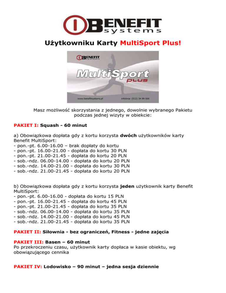 Użytkowniku Karty MultiSport Plus! Masz możliwość skorzystania z jednego, dowolnie wybranego Pakietu podczas jednej wizyty w obiekcie: PAKIET I: Squash - 60 minut a) Obowiązkowa dopłata gdy z kortu korzysta dwóch użytkowników karty Benefit MultiSport: - pon.-pt. 6.00-16.00 – brak dopłaty do kortu - pon.-pt. 16.00-21.00 - dopłata do kortu 30 PLN - pon.-pt. 21.00-21.45 - dopłata do kortu 20 PLN - sob.-ndz. 06.00-14.00 - dopłata do kortu 20 PLN - sob.-ndz. 14.00-21.00 - dopłata do kortu 30 PLN - sob.-ndz. 21.00-21.45 - dopłata do kortu 20 PLN b) Obowiązkowa dopłata gdy z kortu korzysta jeden użytkownik karty Benefit MultiSport: - pon.-pt. 6.00-16.00 - dopłata do kortu 15 PLN - pon.-pt. 16.00-21.45 - dopłata do kortu 45 PLN - pon.-pt. 21.00-21.45 - dopłata do kortu 35 PLN - sob.-ndz. 06.00-14.00 - dopłata do kortu 35 PLN - sob.-ndz. 14.00-21.00 - dopłata do kortu 45 PLN - sob.-ndz. 21.00-21.45 - dopłata do kortu 35 PLN PAKIET II: Siłownia - bez ograniczeń, Fitness - jedne zajęcia PAKIET III: Basen – 60 minut Po przekroczeniu czasu, użytkownik karty dopłaca w kasie obiektu, wg obowiązującego cennika PAKIET IV: Lodowisko – 90 minut – jedna sesja dziennie