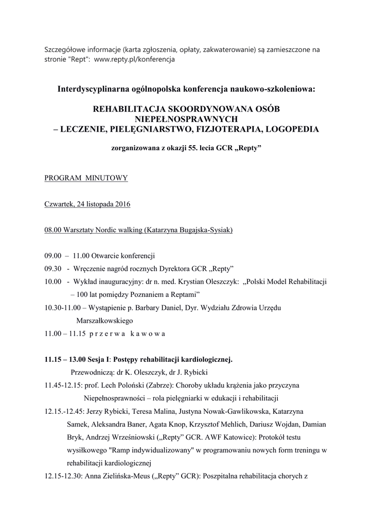 Szczegółowe informacje (karta zgłoszenia, opłaty, zakwaterowanie) są zamieszczone na stronie "Rept": www.repty.pl/konferencja Interdyscyplinarna ogólnopolska konferencja naukowo-szkoleniowa: REHABILITACJA SKOORDYNOWANA OSÓB NIEPEŁNOSPRAWNYCH – LECZENIE, PIELĘGNIARSTWO, FIZJOTERAPIA, LOGOPEDIA zorganizowana z okazji 55. lecia GCR „Repty” PROGRAM MINUTOWY Czwartek, 24 listopada 2016 08.00 Warsztaty Nordic walking (Katarzyna Bugajska-Sysiak) 09.00 – 11.00 Otwarcie konferencji 09.30 - Wręczenie nagród rocznych Dyrektora GCR „Repty” 10.00 - Wykład inauguracyjny: dr n. med. Krystian Oleszczyk: „Polski Model Rehabilitacji – 100 lat pomiędzy Poznaniem a Reptami” 10.30-11.00 – Wystąpienie p. Barbary Daniel, Dyr. Wydziału Zdrowia Urzędu Marszałkowskiego 11.00 – 11.15 p r z e r w a k a w o w a 11.15 – 13.00 Sesja I: Postępy rehabilitacji kardiologicznej. Przewodniczą: dr K. Oleszczyk, dr J. Rybicki 11.45-12.15: prof. Lech Poloński (Zabrze): Choroby układu krążenia jako przyczyna Niepełnosprawności – rola pielęgniarki w edukacji i rehabilitacji 12.15.-12.45: Jerzy Rybicki, Teresa Malina, Justyna Nowak-Gawlikowska, Katarzyna Samek, Aleksandra Baner, Agata Knop, Krzysztof Mehlich, Dariusz Wojdan, Damian Bryk, Andrzej Wrześniowski („Repty” GCR. AWF Katowice): Protokół testu wysiłkowego "Ramp indywidualizowany" w programowaniu nowych form treningu w rehabilitacji kardiologicznej 12.15-12.30: Anna Zielińska-Meus („Repty” GCR): Poszpitalna rehabilitacja chorych z mechanicznym wspomaganiem lewej komory serca typu HeartWare 12.30-12.45: Iwona Cogiel („Repty” GCR”): Pielęgnowanie pacjentów z w mechanicznym wspomaganiem lewej komory serca 12.45-13.00: Katarzyna Bugajska-Sysiak („Repty” GCR”): Fizjoterapia w mechanicznym wspomaganiu lewej komory serca 13.00 – 13.15 p r z e r w a k a w o w a 13.15 – 14.30 Warsztaty szkoleniowe dla pielęgniarek 13.15 – 14.30 Sesja II. Rehabilitacja w schorzeniach narządu ruchu Przewodniczą: dr Wiesław Rycerski, dr Krzysztof Mehlich 13.15-13.30 Alina Radajewska (Krapkowice): Terapia lustrzana (Mirror visual feedback) wspomagająca usprawnianie ręki po udarze mózgu 13.30-13.45: Jarosław Szczygieł (GCR „Repty”): Nauka chodzenia z częściowym odciążeniem masy ciała – PBWS 13.45-14.00: Wiesław Rycerski („Repty” GCR): Rehabilitacja funkcji chodu - ocena, rola mechatroniki 14.00-14.15: Dariusz Gustowski („Repty” GCR): Leczenie zachowawcze skolioz 14.15-14.30: Michał Rau, Joanna Rau, Wojciech Chmielnicki (GCR „Repty”): Rehabilitacja domowa jako przykład interdyscyplinarnej opieki nad osobą niepełnosprawną 14.30 – 15.30 p r z e r w a o b i a d o w a 15.30–17.00 Sesja III: Rola pielęgniarki w rehabilitacji kardiologicznej. Przewodniczy: dr Ewa Molka. 15.30-16.00: Izabella Uchmanowicz (Wrocław): Polska adaptacja skali 9-item European Heart Failure Self-care Behavior Scale (9-EHFScBS) dla oceny poziomu samoopieki u chorych z niewydolnością serca. 16.15-16.30: Joanna Rosińczuk-Tonderys (Wrocław): Kompresjoterapia w profilaktyce zakrzepicy żył głębokich u pacjentów po udarze mózgu 16.30-16.45: Iwona Fus (”Repty” GCR): Edukacja pacjenta 16.45-17.00: Joanna Ryba, Ilona Szymocha („Repty” GCR”): Wpływ rehabilitacji kardiologicznej na sprawność pacjentów po 75 roku życia 17.15 – warsztaty Nordic walking (Katarzyna Bugajska-Sysiak) 18.00 Kolacja towarzyska PROGRAM SZCZEGÓŁOWY DRUGIEGO DNIA Piątek, 25 listopada 2016 08.15 – 10.00 Walne zgromadzenie sprawozdawczo-wyborcze Polskiego Towarzystwa Rehabilitacji Neurologicznej 8.30 – 10.00 Warsztaty szkoleniowe: Warsztaty A. Innowacyjne metody neurorehabilitacji wykorzystywane w terapii mowy, funkcji językowych i procesów poznawczych osób dorosłych - system C-Eye - mgr Bożena Duda - RehaCom - mgr Dorota Pikuła - terapia EEG-feedback - mgr Katarzyna Broniec - Siekaniec Warsztaty B. Pomoc chorym z dysfagią neurogenną i zaburzeniami mowy z wykorzystaniem systemu VocaStim i aparatu IOPI - mgr Ewelina Abramowicz-Pakuła - mgr Grażyna Kubacka 10.00 – 12.00 Sesja IV. Rehabilitacja w neurologii Przewodniczą: prof. A. Kwolek. prof. J. Opara 10.00 - 10.30 Józef Opara: 55 lat GCR i 20 lat skal „Repty” 10.30 - 11.00 Andrzej Kwolek (Rzeszów): Moja „przygoda” z Reptami 11.00 – 11.30 ks. Sebastian Bensz: Opieka duszpasterska nad osobami niepełnosprawnymi 11.30 – 12.00 Stephan Bamborschke (Berlin): Mission of the P.A.N. Center in Berlin 12.00 – 12.15 Józef Opara (Repty): Zespół rzekomo-opuszkowy: diagnostyka i leczenie. 12.15 – 12.30 p r z e r w a k a w o w a 12.00 – 13.30 Warsztaty szkoleniowe rehabilitacji kardiologicznej Justyna Nowak-Gawlikowska, Katarzyna Samek, Jerzy Rybicki: Demonstracja testu wysiłkowego "Ramp indywidualizowany" na bieżni mechanicznej Demonstracja różnych form treningu wytrzymałościowego na cykloergometrze i bieżni mechanicznej: - trening ciągły sterowany obciążeniem oraz częstotliwością rytmu serca - trening typu HIIT (High Intensity Interval Training) - trening piramidowy 12.15 – 12.00 Sesja V. Neurorehabilitacja Przewodniczą: prof. Alina Barkowska, dr hab. Iwona Sarzyńska-Długosz 12.15 – 12.45 Maria Pąchalska (Kraków): Ogólnomózgowy interpretator świata. 12.45 – 13.15 Alina Borkowska (Bydgoszcz): Wpływ procesów poznawczych na zaburzenia komunikacji językowej u chorych z uszkodzeniem OUN. 13.15 – 13.45 Jolanta Panasiuk (Lublin): Zaburzenia języka a komunikacja w przypadkach uszkodzeń lewej półkuli mózgu 13.45 – 14.15: Iwona Sarzyńska-Długosz (Warszawa): Co możemy zrobić dla chorych z minimalnym stanem świadomości? 14.15-14.30 Monika Błaszczyszyn (Opole): Jak można oceniać wyniki rehabilitacji poudarowej? 14.30 Zamknięcie konferencji i wręczenie certyfikatów