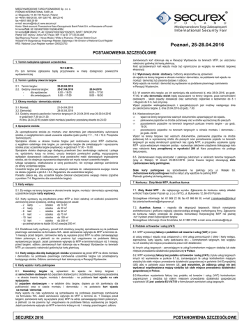 MIĘDZYNARODOWE TARGI POZNAŃSKIE Sp. z o. o. POZNAŃ INTERNATIONAL FAIR Ltd. ul. Głogowska 14, 60-734 Poznań, Poland tel +48/61/ 869 26 00, 691 026 745 , 869 23 40 fax +48/61/ 869 29 99 e-mail: [email protected]; www.securex.pl Konto / Bank account: Powszechna Kasa Oszczędności Bank Polski S.A. w Warszawie o/Poznań Nr konta PLN: 38 102040270000110204242962 Nr konta EUR (IBAN): PL 46 102040270000140210929075, SWIFT: BPKOPLPW Płatnik VAT czynny / Active VAT Payer, NIP / Tax ID: 777-00-00-488 Sąd Rejonowy Poznań – Nowe Miasto i Wilda w Poznaniu / Poznan District Court Wydział VIII Gospodarczy Krajowego Rejestru Sądowego / 8th Division of National Court Register KRS / National Court Register number: 0000202703 Poznań, 25-28.04.2016 POSTANOWIENIA SZCZEGÓŁOWE 1. Termin nadsyłania zgłoszeń uczestnictwa 16.10.2015r. Po tym terminie zgłoszenia będą przyjmowane w miarę dostępności powierzchni wystawienniczej. 2. Termin i godziny otwarcia targów 2.1. Termin targów: 2.2. Godziny otwarcia targów: dla wystawców: dla zwiedzających: 25-28.04.2016 25-27.04.2016 8:00 – 18:00 9:00 – 17:00 28.04.2016 8:00 – 17:00 9:00 – 16:00 3. Okresy montażu i demontażu stoiska 3.1. Montaż: 21-24.04.2016 3.2. Demontaż: 29-30.04.2016 3.3. Godziny otwarcia pawilonów i terenów targowych 21-23.04.2016 oraz 29-30.04.2016 w godzinach 7.30 do 21.30. W dniu 24.04.2016 (ostatni dzień montażu) pawilony pozostaną otwarte do 24.00 4. Sprzątanie stoiska Za uporządkowanie stoiska po montażu oraz demontażu jest odpowiedzialny wykonawca stoiska, z uwzględnieniem zasad usuwania odpadów (patrz punkty 7.7. , 7.8. i 12.2. Przepisów Technicznych). Sprzątanie stoiska w okresie trwania targów jest realizowane przez MTP codziennie, z wyjątkiem ostatniego dnia targów, po zamknięciu targów dla zwiedzających i opuszczeniu stoiska przez uczestnika targów (wystawcę), w godzinach 17.00 – 19.00. Sprzątanie stoiska obejmuje jego dostępną przestrzeń (bez zamkniętego zaplecza) i polega na: opróżnieniu koszy na śmieci, umyciu twardych powierzchni podłóg, wyczyszczeniu wykładzin dywanowych (odkurzaczem) oraz powierzchni mebli stanowiących wyposażenie stoiska, ale nie obejmuje czyszczenia eksponatów ani mycia naczyń uczestnika targów. Usługa sprzątania, wkalkulowana w cenę powierzchni, nie wymaga żadnego zamówienia ze strony uczestnika targów. Uczestnik targów jest zobowiązany we własnym zakresie do zabezpieczenia swojego mienia na stoisku (zgodnie z pkt.6.2. i 6.3. Regulaminu dla uczestników targów). Ponadto zaleca się, aby uczestnik targów dokonał ubezpieczenia swojego mienia (zgodnie z punktem 7.4. Regulaminu dla uczestników targów). 5. Karty wstępu zamówionych kart dokonuje się w Recepcji Wystawców na terenach MTP, po uiszczeniu należności gotówką lub kartą płatniczą. Ilość sprzedawanych kart wjazdu może być ograniczona ze względu na wielkość targowej ekspozycji. 6.2. Wykonawcy stoisk i dostawcy / odbiorcy eksponatów są uprawnieni do wjazdu na tereny targowe w okresie montażu i demontażu, na podstawie kart wjazdu na montaż / demontaż lub zlecenia dostawy / odbioru. Karty wjazdu na montaż / demontaż są wydawane na podstawie pisemnego zamówienia w Recepcji Wystawców. 6.3. W ostatnim dniu targów, po ich zamknięciu dla publiczności tj. dnia 28.04.2016, po godz. 17:00, w celu demontażu stoisk będą wpuszczane na tereny targowe, poza samochodami osobowymi , także pojazdy dostawcze oraz samochody ciężarowe o ładowności do 8 t i długości do 8 m, bez przyczep. Wjazd pojazdów wielkogabarytowych i specjalistycznych jest możliwy następnego dnia po zakończeniu targów, tj. dnia 29.04.2016.od godz. 7.00. 6.4. Niedozwolonym jest : • wjazd na tereny targowe bez ważnych dokumentów uprawniających do wjazdu, • parkowanie pojazdów na drodze pożarowej oraz w strefie wyznaczonej dla pieszych • pozostawienie pojazdów na terenach targowych podczas trwania targów - po godz. 19.00, • pozostawienie pojazdów na terenach targowych w okresie montażu i demontażu po godz. 22.00. Wjazd na tereny targowe bez ważnych dokumentów, parkowanie pojazdów na drodze pożarowej lub w wyznaczonej strefie dla pieszych oraz pozostawienie pojazdu na terenach targowych po wyżej określonych godzinach bez zgody MTP, a przypadku uzyskania zgody MTP - poza wskazanym miejscem postoju - spowoduje założenie urządzenia blokującego koło oraz nałożenie kary porządkowej w wysokości 200 zł. Kara porządkowa nie podlega fakturowaniu. 6.5. Zainteresowani mogą skorzystać z parkingu położonym w okolicach terenów targowych (przy ul. Matejki). W dniach 25-28.04.2016. (okres trwania targów) obowiązują stałe i jednorazowe karty parkingowe. Stałe karty parkingowe są sprzedawane na parkingu przy ul. Jednorazowe karty parkingowe można nabyć przy wjeździe na parking MTP. Płatność gotówką lub kartą płatniczą. Matejki 63. 7. Konkursy: Złoty Medal MTP, Acanthus Aureus 5.1. Do wstępu na tereny targowe w okresie trwania targów, montażu i demontażu upoważniają uczestników targów karty wystawcy. 7.1. Złoty Medal MTP - dla najlepszego wyrobu. Zgłoszenia do konkursu należy składać w World Trade Center Poznań sp. z o.o. (WTC), ul. Bukowska 12, 60-810 Poznań. 5.2. Karty wystawcy są przydzielane przez MTP w ilości zależnej od wielkości powierzchni zamówionej przez wystawcę, według następujących zasad: - 2 karty stoisko do 10 m2 - 4 karty stoisko do 20 m2 - 6 kart stoisko do 50 m2 - 8 kart stoisko do 75 m2 - 10 kart stoisko do 100 m2 - 12 kart stoisko do 200 m2 - po jednej karcie na każde 50 m2 powyżej 200 m2. Szczegółowe informacje: tel. 61 869 22 06, fax 61 866 66 50, e-mail: [email protected] lub [email protected]. 5.3. Dodatkowe karty wystawcy, ponad limit określony powyżej, sprzedawane są na podstawie pisemnego zamówienia na formularzu WA. Jeżeli zamówienie wpłynęło do MTP w terminie ok. 1 miesiąca prz