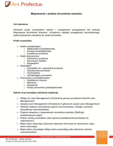 Mapowanie i analiza strumienia wartości Cel szkolenia Zdobycie przez uczestników wiedzy i umiejętności posługiwania się metodą Mapowania Strumienia Wartości. Uczestnicy nabędą umiejętności samodzielnego wykorzystywania narzędzia do analiz procesów. Profil uczestnika • • • • Kadra zarządzająca: o Właściciele przedsiębiorstw o Prezesi przedsiębiorstw o Dyrektorzy produkcji Kadra kierownicza: o Kierownicy produkcji o Kierownicy działów o Brygadziści Specjaliści: o Specjaliści ds. organizacji produkcji o Inżynierowie procesów o Technolodzy o Zarządzający procesami Pracownicy przedsiębiorstwa: o Operatorzy maszyn o Monterzy o Spawacze o Każdy pracownik przedsiębiorstwa Zakres oraz tematyka szkolenia obejmują • • • • • • • Wstęp do Lean Management (Omówienie genezy powstania techniki Lean Management) Zasady Lean Management (Omówienie 5 głównych zasad Lean Management) Wartość dodana (Omówienie pojęcia marnotrawstwa, rodzaje i sposoby identyfikacji marnotrawstwa) Pojęcie związane z mapowaniem strumienia wartości (Definicje podstawowych pojęć) Wybór rodziny produktów (Jak wybrać przedstawicieli produktów do mapowania?) Mapa stanu obecnego (Sposoby zbierania informacji do stworzenia mapy stanu obecnego) Mapa stanu przyszłego (Mapa stanu przyszłego jako elementy redukcji marnotrawstwa) • Plan wdrażania zmian (Jak zaplanować i wdrożyć zmiany z pomocą mapy strumienia wartości) Czas szkolenia: 8 godzin Każdy uczestnik otrzyma zaświadczenie o szkoleniu Opis koncepcji Mapowanie strumienia wartości jest to technika polegająca na opisywaniu w sposób graficzny jak wygląda przepływ strumienia wartości w oczach klienta od początku do końca procesu. Wykorzystując tą technikę można zidentyfikować miejsca występowania marnotrawstwa, a po ich analizie sposób na ich ograniczenie lub eliminację. Mapowanie polega na przejściu przez proces i zaznaczeniu przepływów zarówno materiałów, jak i informacji.
