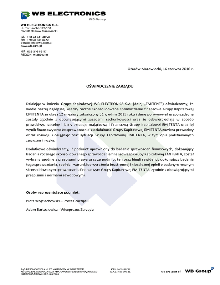 Ożarów Mazowiecki, 16 czerwca 2016 r. OŚWIADCZENIE ZARZĄDU Działając w imieniu Grupy Kapitałowej WB ELECTRONICS S.A. (dalej „EMITENT”) oświadczamy, że wedle naszej najlepszej wiedzy roczne skonsolidowane sprawozdanie finansowe Grupy Kapitałowej EMITENTA za okres 12 miesięcy zakończony 31 grudnia 2015 roku i dane porównywalne sporządzone zostały zgodnie z obowiązującymi zasadami rachunkowości oraz że odzwierciedlają w sposób prawdziwy, rzetelny i jasny sytuację majątkową i finansową Grupy Kapitałowej EMITENTA oraz jej wynik finansowy oraz że sprawozdanie z działalności Grupy Kapitałowej EMITENTA zawiera prawdziwy obraz rozwoju i osiągnięć oraz sytuacji Grupy Kapitałowej EMITENTA, w tym opis podstawowych zagrożeń i ryzyka. Dodatkowo oświadczamy, iż podmiot uprawniony do badania sprawozdań finansowych, dokonujący badania rocznego skonsolidowanego sprawozdania finansowego Grupy Kapitałowej EMITENTA, został wybrany zgodnie z przepisami prawa oraz że podmiot ten oraz biegli rewidenci, dokonujący badania tego sprawozdania, spełniali warunki do wyrażenia bezstronnej i niezależnej opinii o badanym rocznym skonsolidowanym sprawozdaniu finansowym Grupy Kapitałowej EMITENTA, zgodnie z obowiązującymi przepisami i normami zawodowymi. Osoby reprezentujące podmiot: Piotr Wojciechowski – Prezes Zarządu Adam Bartosiewicz - Wiceprezes Zarządu