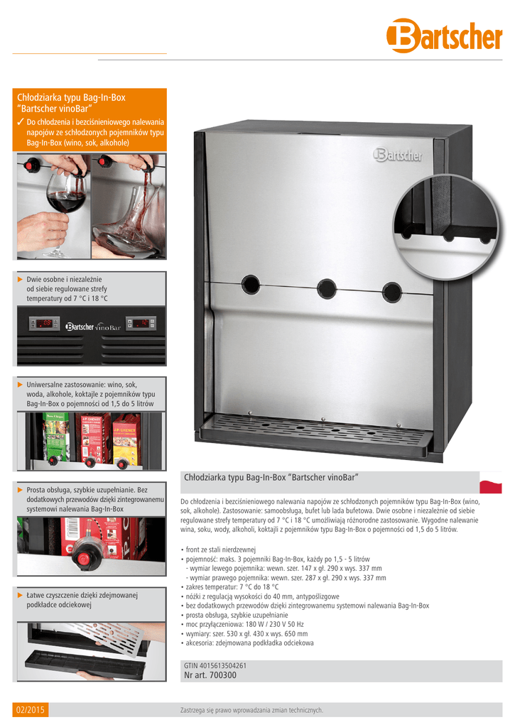 Chłodziarka typu Bag-In-Box “Bartscher vinoBar” 3Do chłodzenia i bezciśnieniowego nalewania napojów ze schłodzonych pojemników typu Bag-In-Box (wino, sok, alkohole) Dwie osobne i niezależnie od siebie regulowane strefy temperatury od 7 °C i 18 °C Uniwersalne zastosowanie: wino, sok, woda, alkohole, koktajle z pojemników typu Bag-In-Box o pojemności od 1,5 do 5 litrów Chłodziarka typu Bag-In-Box “Bartscher vinoBar” Prosta obsługa, szybkie uzupełnianie. Bez dodatkowych przewodów dzięki zintegrowanemu systemowi nalewania Bag-In-Box Łatwe czyszczenie dzięki zdejmowanej podkładce odciekowej Do chłodzenia i bezciśnieniowego nalewania napojów ze schłodzonych pojemników typu Bag-In-Box (wino, sok, alkohole). Zastosowanie: samoobsługa, bufet lub lada bufetowa. Dwie osobne i niezależnie od siebie regulowane strefy temperatury od 7 °C i 18 °C umożliwiają różnorodne zastosowanie. Wygodne nalewanie wina, soku, wody, alkoholi, koktajli z pojemników typu Bag-In-Box o pojemności od 1,5 do 5 litrów. • front ze stali nierdzewnej • pojemność: maks. 3 pojemniki Bag-In-Box, każdy po 1,5 - 5 litrów - wymiar lewego pojemnika: wewn. szer. 147 x gł. 290 x wys. 337 mm - wymiar prawego pojemnika: wewn. szer. 287 x gł. 290 x wys. 337 mm • zakres temperatur: 7 °C do 18 °C • nóżki z regulacją wysokości do 40 mm, antypoślizgowe • bez dodatkowych przewodów dzięki zintegrowanemu systemowi nalewania Bag-In-Box • prosta obsługa, szybkie uzupełnianie • moc przyłączeniowa: 180 W / 230 V 50 Hz • wymiary: szer. 530 x gł. 430 x wys. 650 mm • akcesoria: zdejmowana podkładka odciekowa GTIN 4015613504261 Nr art. 700300 02/2015 Zastrzega się prawo wprowadzania zmian technicznych.