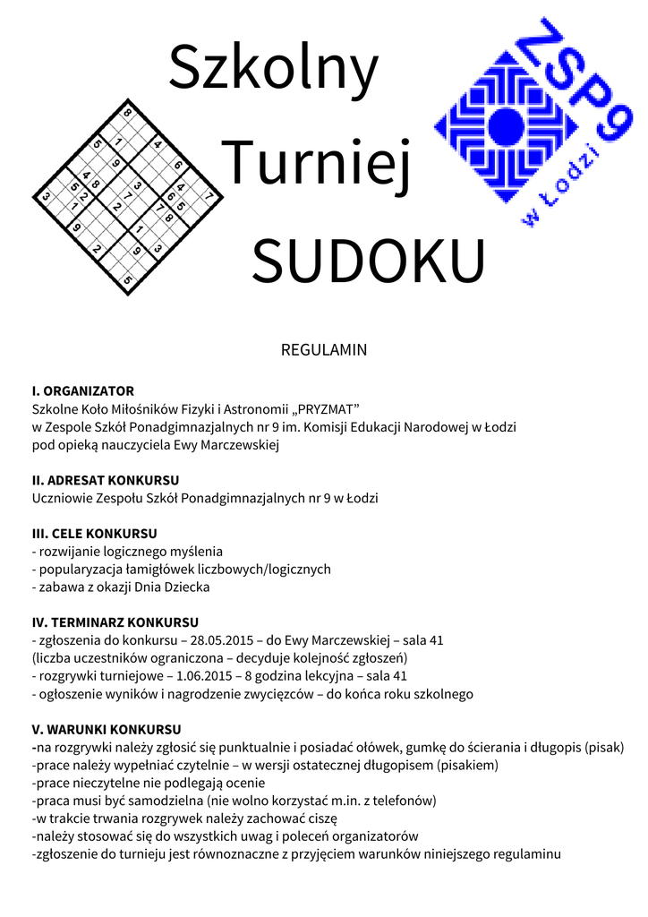 Szkolny Turniej SUDOKU REGULAMIN I. ORGANIZATOR Szkolne Koło Miłośników Fizyki i Astronomii „PRYZMAT” w Zespole Szkół Ponadgimnazjalnych nr 9 im. Komisji Edukacji Narodowej w Łodzi pod opieką nauczyciela Ewy Marczewskiej II. ADRESAT KONKURSU Uczniowie Zespołu Szkół Ponadgimnazjalnych nr 9 w Łodzi III. CELE KONKURSU - rozwijanie logicznego myślenia - popularyzacja łamigłówek liczbowych/logicznych - zabawa z okazji Dnia Dziecka IV. TERMINARZ KONKURSU - zgłoszenia do konkursu – 28.05.2015 – do Ewy Marczewskiej – sala 41 (liczba uczestników ograniczona – decyduje kolejność zgłoszeń) - rozgrywki turniejowe – 1.06.2015 – 8 godzina lekcyjna – sala 41 - ogłoszenie wyników i nagrodzenie zwycięzców – do końca roku szkolnego V. WARUNKI KONKURSU -na rozgrywki należy zgłosić się punktualnie i posiadać ołówek, gumkę do ścierania i długopis (pisak) -prace należy wypełniać czytelnie – w wersji ostatecznej długopisem (pisakiem) -prace nieczytelne nie podlegają ocenie -praca musi być samodzielna (nie wolno korzystać m.in. z telefonów) -w trakcie trwania rozgrywek należy zachować ciszę -należy stosować się do wszystkich uwag i poleceń organizatorów -zgłoszenie do turnieju jest równoznaczne z przyjęciem warunków niniejszego regulaminu