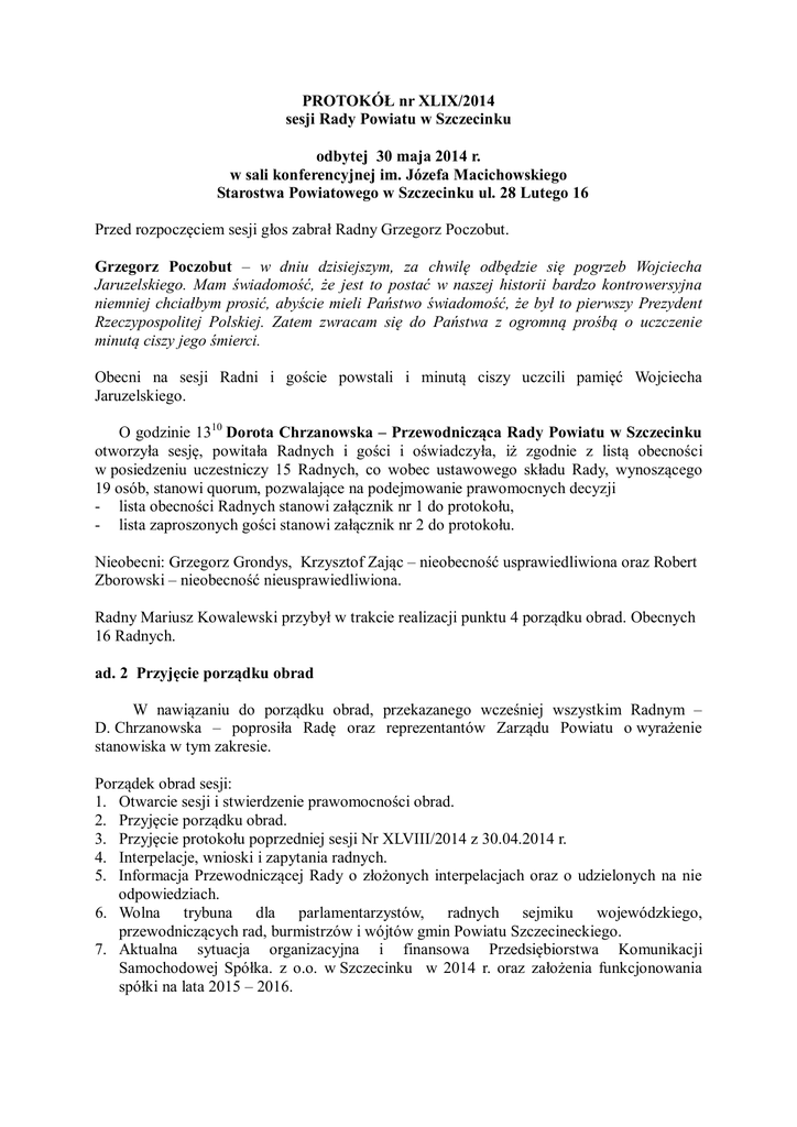 PROTOKÓŁ nr XLIX/2014 sesji Rady Powiatu w Szczecinku odbytej 30 maja 2014 r. w sali konferencyjnej im. Józefa Macichowskiego Starostwa Powiatowego w Szczecinku ul. 28 Lutego 16 Przed rozpoczęciem sesji głos zabrał Radny Grzegorz Poczobut. Grzegorz Poczobut – w dniu dzisiejszym, za chwilę odbędzie się pogrzeb Wojciecha Jaruzelskiego. Mam świadomość, że jest to postać w naszej historii bardzo kontrowersyjna niemniej chciałbym prosić, abyście mieli Państwo świadomość, że był to pierwszy Prezydent Rzeczypospolitej Polskiej. Zatem zwracam się do Państwa z ogromną prośbą o uczczenie minutą ciszy jego śmierci. Obecni na sesji Radni i goście powstali i minutą ciszy uczcili pamięć Wojciecha Jaruzelskiego. O godzinie 1310 Dorota Chrzanowska – Przewodnicząca Rady Powiatu w Szczecinku otworzyła sesję, powitała Radnych i gości i oświadczyła, iż zgodnie z listą obecności w posiedzeniu uczestniczy 15 Radnych, co wobec ustawowego składu Rady, wynoszącego 19 osób, stanowi quorum, pozwalające na podejmowanie prawomocnych decyzji - lista obecności Radnych stanowi załącznik nr 1 do protokołu, - lista zaproszonych gości stanowi załącznik nr 2 do protokołu. Nieobecni: Grzegorz Grondys, Krzysztof Zając – nieobecność usprawiedliwiona oraz Robert Zborowski – nieobecność nieusprawiedliwiona. Radny Mariusz Kowalewski przybył w trakcie realizacji punktu 4 porządku obrad. Obecnych 16 Radnych. ad. 2 Przyjęcie porządku obrad W nawiązaniu do porządku obrad, przekazanego wcześniej wszystkim Radnym – D. Chrzanowska – poprosiła Radę oraz reprezentantów Zarządu Powiatu o wyrażenie stanowiska w tym zakresie. Porządek obrad sesji: 1. Otwarcie sesji i stwierdzenie prawomocności obrad. 2. Przyjęcie porządku obrad. 3. Przyjęcie protokołu poprzedniej sesji Nr XLVIII/2014 z 30.04.2014 r. 4. Interpelacje, wnioski i zapytania radnych. 5. Informacja Przewodniczącej Rady o złożonych interpelacjach oraz o udzielonych na nie odpowiedziach. 6. Wolna trybuna dla parlamentarzystów, radnych sejmiku wojewódzkiego, przewodniczących rad, burmistrzów i wójtów gmin Powiatu Szczecineckiego. 7. Aktualna sytuacja organizacyjna i finansowa Przedsiębiorstwa Komunikacji Samochodowej Spółka. z o.o. w Szczecinku w 2014 r. oraz założenia funkcjonowania spółki na lata 2015 – 2016. 8. Podjęcie uchwał w sprawie: 1) o zmianie uchwały w sprawie przyjęcia „Wieloletniego Programu Inwestycyjnego Powiatu Szczecineckiego na lata 2014 – 2016” (dot. zmiany wartości zadań i dokapitalizowania PKS); 2) o zmianie uchwały w sprawie uchwalenia budżetu Powiatu Szczecineckiego na rok 2014; 3) o zmianie uchwały w sprawie uchwalenia wieloletniej prognozy finansowej Powiatu Szczecineckiego na lata 2014 – 2033; 4) o zmianie uchwały w sprawie uchwalenia budżetu Powiatu Szczecineckiego na rok 2014 (w części dotyczącej ustalenia limitów zobowiązań oraz zmiana planowanego deficytu budżetowego); 5) o zmianie uchwały w sprawie uchwalenia wieloletniej prognozy finansowej Powiatu Szczecineckiego na lata 2014 – 2033 (ze wszystkimi wskaźnikami po zmianach); 6) emisji obligacji powiatowych oraz zasad ich zbywania i wykupu; 7) poparcia stanowiska Sejmiku Województwa Zachodniopomorskiego odnośnie wpisania norki amerykańskiej na listę gatunków obcych i inwazyjnych oraz zaostrzenia przepisów przy zakładaniu ferm norki amerykańskiej; 8) wyrażenia zgody na wniesienie wkładu rzeczowego (aportu) do spółki „Szpital w Szczecinku” spółki z ograniczoną odpowiedzialnością z siedzibą w Szczecinku. 9. Odpowiedź Starosty na interpelacje i zapytania Radnych. 10. Oświadczenia Radnych. 11. Zamknięcie sesji. Dorota Chrzanowska – poinformowała, iż na podstawie art. 15 ust. 2 ustawy z dnia 5 czerwca 1998 r. o samorządzie powiatowym oraz § 36 ust. 1 pkt 1 i 5 Statutu Powiatu Szczecineckiego Zarząd Powiatu Szczecineckiego wystąpił z wnioskiem o zmianę porządku obrad sesji. Zmiana dotyczy wprowadzenia pod obrady w punkcie 8 „Podjęcie uchwał w sprawie” uchwały zmieniającej uchwałę w sprawie określenia przystanków komunikacyjnych, których właścicielem lub zarządzającym jest Powiat Szczecinecki udostępnionych dla operatorów i przewoźników oraz warunków i zasad korzystania z tych przystanków. Następnie poinformowała, iż Radni w materiałach otrzymali wniosek o wprowadzenie zmiany oraz projekt uchwały. Następnie poprosiła Starostę o uzasadnienie wniosku. Wniosek o zmianę porządku obrad stanowi załącznik nr 3 do protokołu. Krzysztof Lis – z upoważnienia Zarządu wnoszę o zmianę porządku obrad. Chodzi o konieczność wprowadzenia zmiany w wykazie przystanków, która wynika z lokalizacji nowego przystanku przy ul. Jana Pawła II w Szczecinku oraz uzupełnienia wykazu o przystanki przy drodze powiatowej Nr 1317 w Bornem Sulinowie. Przystanek na ul. Jana Pawła II jest naprzeciwko internatu Zespołu Szkół Nr 2 przy zatoczce parkingowej. Chcemy, aby autobusy PKS mogły się tam zatrzymywać. Wychodzimy na przeciw potrzeb naszych pasażerów, ponieważ ta lokalizacja jest najlepsza z możliwych. Podjęcie uchwały pozwoli nam na ogłoszenie zmiany w Dzienniku Urzędowym Województwa Zachodniopomorskiego (gdyż jest to prawo lokalne). Przygotujemy stosowny projekt i dokumentację, żeby ten przystanek w najszybszym czasie zorganizować. Następnie Przewodnicząca zapytała, czy są pytania do przedstawionej propozycji zmian porządku obrad. W związku z brakiem pytań Przewodnicząca poddała pod głosowanie wprowadzenie do porządku nowej uchwały w punkcie 8 w podpunkcie 9. 2 W głosowaniu jawnym oddano głosów: za 15 przeciw 0 wstrzymało się od głosu 0 Rada Powiatu jednomyślnie zdecydowała o wprowadzeniu do porządku w punkcie 8 podpunktu 9 – uchwała zmieniająca uchwałę w sprawie określenia przystanków komunikacyjnych, których właścicielem lub zarządzającym jest Powiat Szczecinecki udost