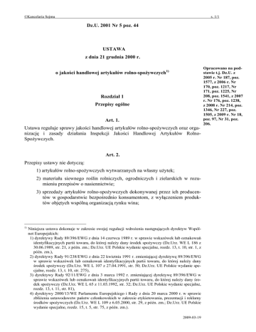 ©Kancelaria Sejmu s. 1/1 Dz.U. 2001 Nr 5 poz. 44 USTAWA z dnia 21 grudnia 2000 r. o jakości handlowej artykułów rolno-spożywczych1) Rozdział 1 Przepisy ogólne Art. 1. Ustawa reguluje sprawy jakości handlowej artykułów rolno-spożywczych oraz organizację i zasady działania Inspekcji Jakości Handlowej Artykułów RolnoSpożywczych. Art. 2. Przepisy ustawy nie dotyczą: 1) artykułów rolno-spożywczych wytwarzanych na własny użytek; 2) materiału siewnego roślin rolniczych, ogrodniczych i zielarskich w rozumieniu przepisów o nasiennictwie; 3) sprzedaży artykułów rolno-spożywczych dokonywanej przez ich producentów w gospodarstwie bezpośrednio konsumentom, z wyłączeniem produktów objętych wspólną organizacją rynku wina; 1) Niniejsza ustawa dokonuje w zakresie swojej regulacji wdrożenia następujących dyrektyw Wspólnot Europejskich: 1) dyrektywy Rady 89/396/EWG z dnia 14 czerwca 1989 r. w sprawie wskazówek lub oznakowań identyfikacyjnych partii towaru, do której należy dany środek spożywczy (Dz.Urz. WE L 186 z 30.06.1989, str. 21, z późn. zm.; Dz.Urz. UE Polskie wydanie specjalne, rozdz. 13, t. 10, str. 1, z późn. zm.), 2) dyrektywy Rady 91/238/EWG z dnia 22 kwietnia 1991 r. zmieniającej dyrektywę 89/396/EWG w sprawie wskazówek lub oznakowań identyfikacyjnych partii towaru, do której należy dany środek spożywczy (Dz.Urz. WE L 107 z 27.04.1991, str. 50; Dz.Urz. UE Polskie wydanie specjalne, rozdz. 13, t. 10, str. 275), 3) dyrektywy Rady 92/11/EWG z dnia 3 marca 1992 r. zmieniającej dyrektywę 89/396/EWG w sprawie wskazówek lub oznakowań identyfikacyjnych partii towaru, do której należy dany środek spożywczy (Dz.Urz. WE L 65 z 11.03.1992, str. 32; Dz.Urz. UE Polskie wydanie specjalne, rozdz. 13, t. 11, str. 81), 4) dyrektywy 2000/13/WE Parlamentu Europejskiego i Rady z dnia 20 marca 2000 r. w sprawie zbliżenia ustawodawstw państw członkowskich w zakresie etykietowania, prezentacji i reklamy środków spożywczych (Dz.Urz. WE L 109 z 6.05.2000, str. 29, z późn. zm.; Dz.Urz. UE Polskie wydanie specjalne, rozdz. 15, t. 5, str. 75, z późn. zm.). 2009-03-19 Opracowano na podstawie t.j. Dz.U. z 2005 r. Nr 187, poz. 1577, z 2006 r. Nr 170, poz. 1217, Nr 171, poz. 1225, Nr 208, poz. 1541, z 2007 r. Nr 176, poz. 1238, z 2008 r. Nr 214, poz. 1346, Nr 227, poz. 1505, z 2009 r. Nr 18, poz. 97, Nr 31, poz. 206. ©Kancelaria Sejmu s. 2/2 4) wymagań zdrowotnych, sanitarnych, weterynaryjnych i fitosanitarnych dotyczących artykułów rolno-spożywczych określonych w odrębnych przepisach; 5) owoców i warzyw, których wymagania jakości handlowej określają przepisy Unii Europejskiej. Art. 3. Użyte w ustawie określenia oznaczają: 1) artykuły rolno-spożywcze – produkty rolne, runo leśne, dziczyznę, organizmy morskie i słodkowodne w postaci surowców, półproduktów oraz wyrobów gotowych otrzymywanych z tych surowców i półproduktów, w tym środki spożywcze; 2) żywność (środek spożywczy) – każdą substancję lub produkt w rozumieniu art. 2 rozporządzenia (WE) nr 178/2002 Parlamentu Europejskiego i Rady z dnia 28 stycznia 2002 r. ustanawiającego ogólne zasady i wymagania prawa żywnościowego, powołującego Europejski Urząd ds. bezpieczeństwa żywności oraz ustanawiającego procedury w zakresie bezpieczeństwa żywności (Dz.Urz. WE L 31 z 01.02.2002); 3) (uchylony); 4) obrót – czynności w rozumieniu art. 3 pkt 8 rozporządzenia, o którym mowa w pkt 2; 5) jakość handlowa – cechy artykułu rolno-spożywczego dotyczące jego właściwości organoleptycznych, fizykochemicznych i mikrobiologicznych w zakresie technologii produkcji, wielkości lub masy oraz wymagania wynikające ze sposobu produkcji, opakowania, prezentacji i oznakowania, nieobjęte wymaganiami sanitarnymi, weterynaryjnymi lub fitosanitarnymi; 6) opakowany środek spożywczy – środek spożywczy w rozumieniu art. 3 ust. 3 pkt 19 ustawy z dnia 25 sierpnia 2006 r. o bezpieczeństwie żywności i żywienia (Dz. U. Nr 171, poz. 1225); 7) partia produkcyjna – określoną ilość artykułu rolno-spożywczego wyprodukowanego, przetworzonego lub zapakowanego w praktycznie takich samych warunkach; 8) próbka – część partii produkcyjnej pobraną jednorazowo, w sposób losowy, w celu kontroli lub oceny w zakresie jakości handlowej artykułu rolnospożywczego; 9) producent – osobę fizyczną, osobę prawną albo jednostkę organizacyjną nieposiadającą osobowości prawnej, która: a) produkuje lub paczkuje artykuły rolno-spożywcze, lub b) wprowadza artykuły rolno-spożywcze do obrotu, jeżeli działalność ta jest zarejestrowana na terytorium któregoś z państw członkowskich Unii Europejskiej; 10) artykuł rolno-spożywczy zafałszowany – produkt, którego skład jest niezgodny z przepisami dotyczącymi jakości handlowej poszczególnych artykułów rolno-spożywczych, albo produkt, w którym zostały wprowadzone zmiany, w tym zmiany dotyczące oznakowania, mające na celu ukrycie jego 2009-03-19 ©Kancelaria Sejmu s. 3/3 rzeczywistego składu lub innych właściwości, jeżeli niezgodności te lub zmiany w istotny sposób naruszają interesy konsumentów, w szczególności jeżeli: a) dokonano zabiegów, które zmieniły lub ukryły jego rzeczywisty skład lub nadały mu wygląd produktu zgodnego z przepisami dotyczącymi jakości handlowej, b) w oznakowaniu podano nazwę niezgodną z przepisami dotyczącymi jakości handlowej poszczególnych artykułów rolno-spożywczych albo niezgodną z prawdą, c) w oznakowaniu podano niezgodne z prawdą dane w zakresie składu, pochodzenia, terminu przydatności do spożycia lub daty minimalnej trwałości, zawartości netto lub klasy jakości handlowej. Rozdział 2 Jakość handlowa Art. 4. 1. Wprowadzane do obrotu artykuły rolno-spożywcze powinny spełniać wymagania w zakresie jakości handlowej, jeżeli w przepisach o jakości handlowej zostały określone takie wymagania, oraz dodatkowe 