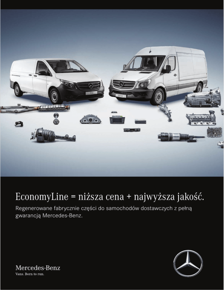 EconomyLine = niższa cena + najwyższa jakość. Regenerowane fabrycznie części do samochodów dostawczych z pełną gwarancją Mercedes-Benz. Wykaz dostępnych części regenerowanych EconomyLine do Vito i Sprintera Agregaty Vito Sprinter Głowice cylindrowe Silnik Skrzynia biegów, automatyczna Skrzynia biegów, manualna Skrzynia rozdzielcza Części mechaniczne Koło zamachowe Kompresor klimatyzacji Pompa wodna Pompa wspomagania układu kierowniczego (hydrauliczna) Przekładnia hydrokinetyczna Sprzęgło - zestaw Tarcza dociskowa sprzęgła Turbosprężarka Układ kierowniczy Wał napędowy Wałek główny skrzyni biegów Wałek pośredni skrzyni biegów Zawór hamulcowy Zespól sterowania automatycznej skrzyni biegów Układ wtryskowy i układ wydechowy AdBlue® dozownik AdBlue® pompa Filtr cząstek stałych Katalizator Pompa wtryskowa Wtryskiwacz Zawór EGR (Exhaust Gas Recirculation) Części elektryczne i elektroniczne Alternator Moduł sterujący silnika Moduł sterujący skrzyni biegów Radio Rozrusznik Urządzenie obsługowe / Nawigacja Części napędu elektrycznego i hybrydowego Baterie Litowo-Jonowe Moduł zarządzania energią Elektromotory ■ ■ ■ ■ ■ ■ ■ ■ ■ ■ ■ ■ ■ ■ ■ ■ ■ ■ ■ ■ ■ ■ ■ ■ ■ ■ ■ ■ ■ ■ ■ ■ ■ ■ ■ ■ ■ ■ ■ ■ ■ ■ ■ ■ ■ ■ ■ ■ ■ ■ ■ ■ ■ ■ ■ ■ ■ ■ O szczegółach oferty chętnie Państwu opowie nasz Doradca Serwisowy.
