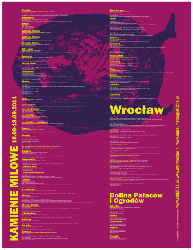Bolesławiec Plac przed pomnikiem „Polski Walczącej”, ul. Kubika – planty 16.09, godz. 10.00 Etniczne kamienie milowe − Ocalić przeszłość. Bolesławieckie miejsca pamięci ofiar II wojny światowej – wycieczka. Bolków Zamek Bolków 17.09, godz. 13.00-18.00 18.09, godz. 11.00-14.00 XVII-wieczny Piknik Historyczny. Bystrzyca Kłodzka Biblioteka Publiczna Miasta i Gminy Bystrzyca Kłodzka, pl. Wolności 16 18.09, godz. 17.00 Miejsca związane z Polakami w północnej Rosji – wystawa. Bystrzyca Kłodzka Muzeum Filumenistyczne, Mały Rynek 1 14.09, godz. 11.00 Aelurius i inni. Tradycje historiografii hrabstwa kłodzkiego – wykład. Chełmsko Śląskie Zespół drewnianych domów „Dwunastu Apostołów”, ul. Sądecka 15 11-18.09, godz. 11.00-18.00 Od posiania do utkania – warsztaty. Dobroszyce Pałac w Dobroszycach, ul. Wojska Polskiego 25 10-11.09, 17-18.09, godz. 11.00-17.00 Cykliczne zwiedzanie pałacu w Dobroszycach oraz przypałacowego parku, wykłady związane z historią Dobroszyc i pałacu, koncert muzyki dawnej, turniej rycerski, zabawy dla dzieci. Drogosław Miejska Biblioteka Publiczna – Filia w Drogosławiu, ul. Świdnicka 60 12.09, godz. 17.00 Kamienie milowe Nowej Rudy − wystawa prac pokonkursowych uczniów noworudzkich szkół. Kamienie milowe Nowej Rudy − sesja popularnonaukowa. Duszniki-Zdrój Muzeum Papiernictwa w Dusznikach-Zdroju, ul. Kłodzka 42 11.09, godz. 11.00-12.00 Papier kamieniem… milowym. Papier w technice, kulturze i sztuce – prelekcja. 11.09, godz. 12.00-13.30 Warsztaty czerpania papieru. Dzierżoniów Sowiogórskie Muzeum Techniki, ul. Sienkiewicza 19 17-18.09, godz. 10.00-18.00 Góry Sowie − europejski fenomen systemu technicznego. Zabytki techniki Gór Sowich, Pomniki architektury przemysłowej Dzierżoniowa, Zabytki techniki Rumunii – wystawy. Projekcje filmów o zabytkach techniki regionu. Piknik na szynach – przejazdy drezynami. KAMIENIE MILOWE 10.09-18.09.2011 Głogów Zamek Książąt Głogowskich – Muzeum Archeologiczno-Historyczne w Głogowie, ul. Brama Brzostowska 1 10.09, godz. 14.00-17.30 Mosty do Polski Historia głogowskich mostów, historyczne związki Głogowa z Polską – wykłady i zwiedzanie z przewodnikiem mostów drogowych i kolejowych. 10.09, godz. 16.00 Głogów Piastów i Jagiellonów – wykład. 10.09, godz. 17.00 Spacer po Starym Mieście w Głogowie. 11.09, godz. 15.00 Ginące zawody – wykład. 11.09, godz. 16.00 Koncert muzyczny połączony z pokazem multimedialnym. Jawor Muzeum Regionalne w Jaworze, ul. Klasztorna 6 17.09, godz. 16.00 Przekraczanie niemożliwego. Kościół Pokoju w Jaworze w X rocznicę wpisania na Listę Światowego Dziedzictwa Kultury UNESCO − wernisaż wystawy. Pl. Bankowy 1 (dziedziniec banku) 10.09, godz. 11.00-13.00 Dzień otwarty w bastei Zamek Anioła – prezentacja wmurowanych w jej ścianę sześciu krzyży kamiennych (tzw. pokutnych), wykład w plenerze. Jaworzyna Śląska Muzeum Przemysłu i Kolejnictwa na Śląsku, ul. Towarowa 4 17.09, godz. 12.00-23.00 VIII Spotkanie „Nasza Historia Harley Davidson”. Jelenia Góra Muzeum Przyrodnicze w Jeleniej Górze, ul. Wolności 268 Wspaniałe siedziby Muzeum w Cieplicach 17.09, godz. 14.30 − prelekcja multimedialna. 17.09, godz. 16.00 − wycieczka do zespołu poklasztornego. Jelenia Góra – Jagniątków Muzeum Miejskie „Dom Gerharta Hauptmanna” w Jeleniej Górze – Jagniątkowie, ul. Michałowicka 32 13.09, godz. 12.00-17.00. Pokaz filmu oraz prelekcja poświęcona ucieczkom Niemców wschodnich w ostatniej fazie istnienia NRD. Karpacz Muzeum Sportu i Turystyki w Karpaczu, ul. Kopernika 2 18.09, godz. 17.00 Dolny Śląsk jako kraina azylu. Exodus tyrolskich protestantów – prelekcja. Kłodzko Dworzec PKS w Kłodzku, pl. Jedności 17.09, godz. 9.00-17,00 Wycieczka autokarowa do Międzygórza. Muzeum Ziemi Kłodzkiej, ul. Łukasiewicza 4 16.09, godz. 11.00 Kulturotwórcza rola joannitów i augustianów w dziejach Kłodzka – otwarcie wystawy, wykład. Zespół Szkół Ogólnokształcących im. Bolesława Chrobrego w Kłodzku, ul. Wojska Polskiego 11 16.09, godz. 10.00 Wkład ziemi kłodzkiej w europejskie dziedzictwo kulturowe – cykl miniwykładów. Krzyżowa „Dom na Wzgórzu”, budynek na terenie Fundacji „Krzyżowa” 17-18.09, godz. 12.00-18.00 o każdej pełnej godzinie zwiedzanie z przewodnikiem. Na urodzinach u pani Freyi von Moltke w „Domu na Wzgórzu” w Krzyżowej − zwiedzanie, projekcje filmów, opowieści o historii miejsca i ludzi z nim związanych. Kudowa-Zdrój Muzeum Kultury Ludowej Pogórza Sudeckiego, Pstrążna 14 14-15.09, godz. 10.00-12.00 Historia Pstrążnej i innych miejsc z nią związanych. Tradycje i kultura lokalnych społeczności − spotkania z dziećmi i młodzieżą. Legnickie Pole Basen w Legnickim Polu, pl. Henryka Pobożnego 1 11.09, godz. 12.00-14.00 III Benedyktyńska Jesień. Ludwikowice Kłodzkie Centrum Kultury Gminy Nowa Ruda – czytelnia biblioteki, ul. Fabryczna 2 15.09, godz. 17.00 Historia widokówkami malowana – pozdrowienia z Gór Sowich – wystawa. Spotkanie z Tadeuszem Biedą, autorem książki Wśród malowniczych wzgórz nad Włodzicą. Łomnica Pałac Łomnica, ul. Karpnicka 3 10-11.09, godz. 11.00-17.00 Odkryj bieg historii w zwierciadle Pałacu Łomnica. Powrót do przyszłości – kiermasz wiejskiego rękodzieła połączony z pokazem typowych produktów dolnośląskich. 17-18.09, godz. 11.00-17.00 Święto lnu – śląskie złoto XXI w. Wapiennik Łaskawy Kamień, Stara Morawa 29 10.09, godz. 12.00-19.00 Święto Hildegardy, inauguracja obchodów EDD 2011. 10.09, godz.17.00 Święto Hildegardy z milowym kamieniem kultury − spotkanie literackie z Olgą Tokarczuk. Syców Muzeum Regionalne w Sycowie, pl. Wolności 7 9.09, godz. 18.00 Inauguracja obchodów EDD 2011. Promocja książki Aleksandry i Krzysztofa Zielniców Był taki czas… Pogranicze śląsko-wielkopolskie (Syców-Kępno-Ostrzeszów). Wspomnienia i relacje z lat 191