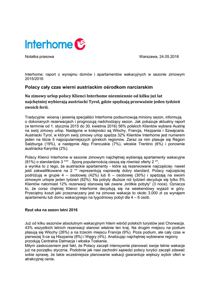 Notatka prasowa Warszawa, 24.05.2016 Interhome: raport z wynajmu domów i apartamentów wakacyjnych w sezonie zimowym 2015/2016 Polacy cały czas wierni austriackim ośrodkom narciarskim Na zimowy urlop polscy Klienci Interhome niezmiennie od kilku już lat najchętniej wybierają austriacki Tyrol, gdzie spędzają przeważnie jeden tydzień swoich ferii. Tradycyjnie wiosną i jesienią specjaliści Interhome podsumowują miniony sezon, informują o dokonanych rezerwacjach i prognozują nadchodzący sezon. Jak pokazuje aktualny raport (w terminie od 1. stycznia 2015 do 30. kwietnia 2016) 56% polskich Klientów wybiera Austrię na swój zimowy urlop. Następne w kolejności są Włochy, Francja, Hiszpania i Szwajcaria. Austriacki Tyrol, w którym swój zimowy urlop spędza 32% Klientów Interhome jest numerem jeden na liście 5 najpopularniejszych górskich regionów. Zaraz za nim plasuje się Region Salzburga (19%), a następnie Alpy Francuskie (7%), włoskie Trentino (6%) i ponownie austriacka Karyntia (2%). Polscy Klienci Interhome w sezonie zimowym najchętniej wybierają apartamenty wakacyjne (81%) o standardzie 3 *** . Sporą popularnością cieszą się również oferty 2 **, a wynika to z tego, że austriackie apartamenty - które są rezerwowane najczęściej- nawet jeśli zakwalifikowane na 2 ** reprezentują naprawdę dobry standard. Polacy najczęściej podróżują w grupie 4 – osobowej (42%) lub 6 – osobowej (30%) i spędzają na swoim zimowym urlopie jeden tydzień (82%). Na pobyty dłuższe niż tydzień decyduje się tylko 5% Klientów natomiast 12% rezerwacji stanowią tak zwane „krótkie pobyty” (3 noce). Oznacza to, że coraz chętniej Klienci Interhome decydują się na weekendowy wyjazd w góry. Przeciętny koszt jaki przeznaczany jest na zimowe wakacje to około 3.000 zł za wynajem apartamentu lub domu wakacyjnego na tygodniowy pobyt dla 4 – 6 osób. Rzut oka na sezon letni 2016 Już od kilku sezonów absolutnym wakacyjnym hitem wśród polskich turystów jest Chorwacja. 43% wszystkich letnich rezerwacji stanowi właśnie ten kraj. Na drugim miejscu na podium plasują się Włochy (26%) a na trzecim miejscu Francja (9%). Poza podium, ale cały czas w pierwszej 5-ce są Hiszpania (8%) i Węgry (4%). Analizując najchętniej wybierane regiony przodują Centralna Dalmacja i włoska Toskania. Miłym zaskoczeniem jest fakt, że Polacy zaczęli intensywnie planować swoje letnie wakacje już na początku stycznia. Podobnie jak nasi zachodni sąsiedzi polscy turyści zaczęli zdawać sobie sprawę, że takie wcześniejsze planowanie wakacji gwarantuje większy wybór ofert w atrakcyjnej cenie. Interhome Polska jest liderem w wynajmie domów i apartamentów wakacyjnych. W swojej ofercie ma ponad 33 tys. domów i apartamentów w 34 krajach. Górskie domki, wille z basenem, doskonale zlokalizowane apartamenty w najpiękniejszych miastach, apartamenty i domy przy plaży, typowe toskańskie wille – wszystkie są dostępne na stronie i gotowe do rezerwacji online. Spółka Interhome AG, z siedzibą w Glattbrugg jest własnością Hotelplan Holding AG. 100% udziałów tej firmy należy z kolei do Migros – największego w Szwajcarii przedsiębiorstwa handlu detalicznego z siedzibą w Zurychu. Więcej informacji: Interhome Polska Sp. z o.o. Ul. Stanisława Kostki Potockiego 24B 02-958 Warszawa www.interhome.pl [email protected] Tel: 22 642 23 84 Więcej informacji również na Facebooku, Twitterze, Instagramie i Blogu
