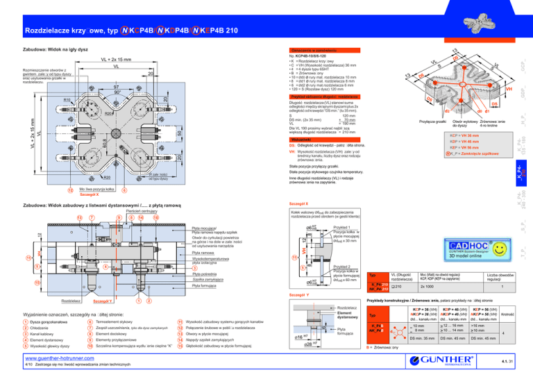 Rozdzielacze krzyżowe, typ N KCP4B/ N KDP4B/ N KEP4B 210 13 Oznaczenie w zamówieniu VL 20 20 97 90° R10 50 V S L S DS VH DS Długość rozdzielacza (VL) stanowi suma odległości między skrajnymi dyszami plus 2x odległość od krawędzi “DS min.” (tu 35 mm). S 120 mm DS min. (2x 35 mm) + 70 mm VL = 190 mm Dla VL 190 prosimy wybrać najbliższą większą długość rozdzielacza = 210 mm R20 VL + 2x 15 mm VL 13 DS DS d2 Przyłącza grzałki d0 d1 Otwór wylotowy Zrównoważenie do dyszy 4-ro krotne KCP = VH 36 mm 60,8 Wskazówki KDP = VH 46 mm DS: Odległość od krawędzi - patrz żółta strona. KEP = VH 56 mm VH: Wysokość rozdzielacza (VH) zależy od średnicy kanału, liczby dysz oraz rodzaju zrównoważenia. 20 _K_P4135 - 180 Rozmieszczenie otworów z gwintem zależy od typu dyszy oraz usytuowania grzałki w rozdzielaczu. VL _GCP_ VL + 2x 15 mm N K_P = Zamknięcie szpilkowe Stała pozycja stykowego czujnika temperatury. W zależności od typu dyszy Możliwa pozycja kołka Szczegół X Inne długości rozdzielaczy (VL) i rodzaje zrównoważenia na zapytanie. Szczegół X Zabudowa: Widok zabudowy z listwami dystansowymi /..... z płytą ramową Pierścień centrujący 8 14 Kołek walcowy Ø6m6 do zabezpieczenia rozdzielacza przed obrotem (w gestii klienta) 10 H7 Ø6 m6 12 VH VH Otwór do cyrkulacji powietrza na górze i na dole w zależności od usytuowania narzędzia Płyta ramowa 11 Wysokotemperaturowa płyta izolacyjna 5 4 3 Przykład 1 Pozycja kołka w płycie mocującej Ødm6 x 30 mm 8 12 Płyta mocująca/ Płyta ramowa napędu szpilek 11 5 Przykład 2 Pozycja kołka w płycie formującej Ød m6 x 60 mm Płyta pośrednia Szpilka zamykająca 15 Płyta formująca _S_P_ 9 7 _T_P_ 13 _K_P4240 - 300 6 8 12 _K_P4210 Stała pozycja przyłączy grzałki. R20 H7 Ø6 m6 Typ VL (Długość rozdzielacza) K_P4-210 NK_P4-210 210 < < Liczba obwodów regulacji 1 2x 1000 Szczegół Y Rozdzielacz Szczegół Y 1 Przykłady konstrukcyjne / Zrównoważenie, patarz przykłady na żółtej stronie 2 Rozdzielacz Element dystansowy 1 Dysza gorącokanałowa 6 Termoelement stykowy 11 Wysokość zabudowy systemu gorących kanałów 2 Chłodzenie 7 Zespół uszczelnienia, tyko dla dysz zamykanych 12 Połączenie śrubowe w pobliżu rozdzielacza 3 Kanał kablowy 8 13 Otwory w płycie mocującej 4 Element dystansowy 9 Elementy przyłączeniowe 14 Napędy szpilek zamykających 5 Wysokość głowicy dyszy 10 Szczelina kompensująca wydłużenie cieplne “K” 15 Głębokość zabudowy w płycie formującej www.guenther-hotrunner.com 4/10 Zastrzega się możliwość wprowadzania zmian technicznych 6 Wyjaśnienie oznaczeń, szczegóły na żółtej stronie: Element dociskowy _GDP_ Np. KCP4B-10/8/6-120 • K = Rozdzielacz krzyżowy • C = VH (Wysokość rozdzielacza) 36 mm • 4 = 4 dysze typu 6SHT • B = Zrównoważony • 10 = Ød0 Ø rury mat. rozdzielacza 10 mm • 8 = Ød1 Ø rury mat. rozdzielacza 8 mm • 6 = Ød2 Ø rury mat.rozdzielacza 6 mm • 120 = S (Rozstaw dysz) 120 mm _H_P_ Zabudowa: Widok na igły dysz Ø16 H7 Ø28 Płyta formująca KCP = 36 (VH) KDP = 46 (VH) NKCP = 36 (VH) NKDP = 46 (VH) Ød... kanału mm Ød... kanału mm Typ K_P4B NK_P4B d... 10 mm 8 mm DS min. 35 mm KEP = 56 (VH) NKEP = 56 (VH) Ød... kanału mm < 12 ... 16 mm < 10 ... 14 mm < 16 mm DS min. 45 mm DS min. 45 mm >16 mm 4 H7 B = Zrównoważony 4.1. 31