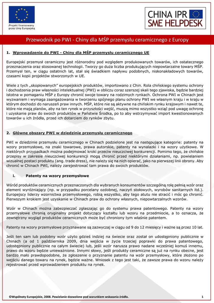 Projekt finansowany przez Unię Europejską Przewodnik po PWI - Chiny dla MŚP przemysłu ceramicznego z Europy 1. Wprowadzenie do PWI - Chiny dla MŚP przemysłu ceramicznego UE Europejski przemysł ceramiczny jest różnorodny pod względem produkowanych towarów, ich ostatecznego przeznaczenia oraz stosowanej technologii. Tworzy go duża liczba produkujących niepowtarzalne towary MŚP. Przemysł ten, w ciągu ostatnich lat, stał się świadkiem napływu podobnych, niskonakładowych towarów, czasami kopii projektów stworzonych w UE. Wiele z tych „skopiowanych” europejskich produktów, importowano z Chin. Rola chińskiego systemu ochrony i dochodzenia praw własności intelektualnej (PWI) w obliczu coraz szerszej skali tego zjawiska, będzie bardziej istotna w pomaganiu MŚP z Europy chronić swoje towary na rodzimych rynkach. Ochrona PWI w Chinach jest wyzwaniem i wymaga zaangażowania w tworzeniu spójnego planu ochrony PWI we własnym kraju i w kraju w którym dochodzi do naruszeń praw innych. MŚP, które nie są aktywne na chińskim rynku krajowym i nawet te, które nie mają planów, aby na ten rynek w przyszłości wejść, muszą mimo wszystko wziąć pod uwagę ochronę i uzyskanie praw do swoich produktów w Państwie Środka, po to aby wstrzymywać import kwestionowanych towarów u ich źródła, przed ich dotarciem do rynków zbytu. 2. Główne obszary PWI w dziedzinie przemysłu ceramicznego PWI w dziedzinie przemysłu ceramicznego w Chinach podzielone jest na następujące kategorie: patenty na wzory przemysłowe, na znaki towarowe, prawa autorskie, patenty na wynalazki i na wzory użytkowe. W niektórych przypadkach można podejmować kroki przeciw nieuczciwej konkurencji. Pomimo tego, że chińskie przepisy w zakresie nieuczciwej konkurencji mogą chronić przed niektórymi działaniami, np. powielaniem wizualnej postaci produktu (ang. trade dress), nie należy się na nich opierać, jako na pierwszej linii obrony. Aby chronić w Chinach PWI, należy zarejestrować tam prawa do swoich produktów. i. Patenty na wzory przemysłowe Wśród produktów ceramicznych przeznaczonych dla wybranych konsumentów szczególną rolę pełnią wzór oraz element wyróżniający (np. w przypadku porcelany ozdobnej, naczyń stołowych, wyrobów sanitarnych itd.). Europejscy liderzy wzornictwa przemysłowego, robią wszystko, aby tego atutu nie stracić i móc go chronić. Pierwszym krokiem jest uzyskanie w Chinach praw do ochrony własnych, niepowtarzalnych wzorów. Wzór w Chinach można zabezpieczać zgłaszając go do systemu prawa patentowego. Patenty na wzory przemysłowe chronią oryginalny projekt dotyczący kształtu lub wzoru na przedmiocie, a to oznacza, że zewnętrzny wygląd produktów ceramicznych może być chroniony tym właśnie patentem. Patenty na wzory przemysłowe przyznawane są zazwyczaj w ciągu od 9 do 12 miesięcy i ważne są przez 10 lat. Jeśli ten sam lub podobny wzór użyto gdzieś indziej na świecie oraz został on udostępniony publicznie w Chinach (a od 1 października 2009, dnia wejścia w życie trzeciej poprawki do prawa patentowego, udostępniony publicznie na całym świecie) lub, jeśli wzór narusza prawo nadane wcześniej komuś innemu, prawo do wzoru będzie unieważnione. Innymi słowy, jeśli produkty ceramiczne są już na rynku obecne, jest bardzo mało prawdopodobne, że zgłoszenie o przyznanie patentu na wzór przemysłowy, które złożono po wejściu danego towaru na rynek, będzie ważne. Wniosek z tego jest taki, że zawsze prawa do wzoru należy rejestrować przed wprowadzeniem produktu na rynek. ©Wspólnoty Europejskie, 2008. Powielanie dozwolone pod warunkiem wskazania źródła. 1 Projekt finansowany przez Unię Europejską ii. Znaki towarowe Ochrona znaku towarowego w Chinach możliwa jest przez zgłoszenie go do systemu prawa znaków towarowych. Ochrona obejmuje pierwsze 10 lat i jest sukcesywnie odnawiana na kolejne dziesięcioletnie okresy. Uzyskanie prawa do znaku towarowego może jednak zająć aż 2-3 lata. Obcokrajowcy i podmioty zagraniczne starające się zarejestrować narodowe/chińskie znaki towarowe, muszą skorzystać z pomocy chińskiego rzecznika patentowego w celu dokonania w ich imieniu zgłoszenia (ewentualnie mogą zrobić to za pomocą Systemu madryckiego, patrz poniżej). Aby wytwórcy towarów ceramicznych mogli podjąć kroki prawne przeciwko producentom towarów podrobionych, muszą zarejestrować swoje znaki towarowe w Chinach lub zarejestrować towar w Systemie madryckim. W Chinach stosuje się zasadę „first to file”, która oznacza że prawo chroni ten podmiot, który jako pierwszy zarejestrował znak towarowy, a nie podmiot który pierwszy go używa. Dlatego, niezarejestrowane znaki towarowe są chronione tylko w kilku sytuacjach (np. kiedy uważa się je w Państwie Środka za „dobrze znane”). Znak towarowy można uznać za dobrze znany tylko na drodze postępowania sądowego, takiego jak spory w sprawie sprzeciwu dotyczącego zgłoszenia znaku towarowego, unieważnienia lub naruszenia praw innych. Wymagania dotyczące dokumentowania takich spraw są uciążliwe, a samo ich prowadzenie kosztowne i wymagające dużego nakładu czasu. Zaleca się więc rejestrować w Chinach znaki towarowe oraz jeśli ma to zastosowanie, ich chińskie odpowiedniki. Strategiczne użycie znaków towarowych może odegrać szczególnie istotną rolę w momencie w którym wzór nie jest zarejestrowany. W przypadku wytłaczanych znaków towarowych lub tych, których część jest integralnie połączona ze wzorem przemysłowym, trudno jest osobie naruszającej prawa odróżnić, które elementy funkcjonalne są istotne, a które są nieistotnymi elementami znaku towarowego. Niektóre z tych osób, zmieniając elementy znaku, jeśli znak ten stanowi w znacznym stopniu integralną część wzoru przemysłowego, mogą nie być wystarczająco dokładne. Wtedy, powielenie wzoru może oznaczać powielenie znak
