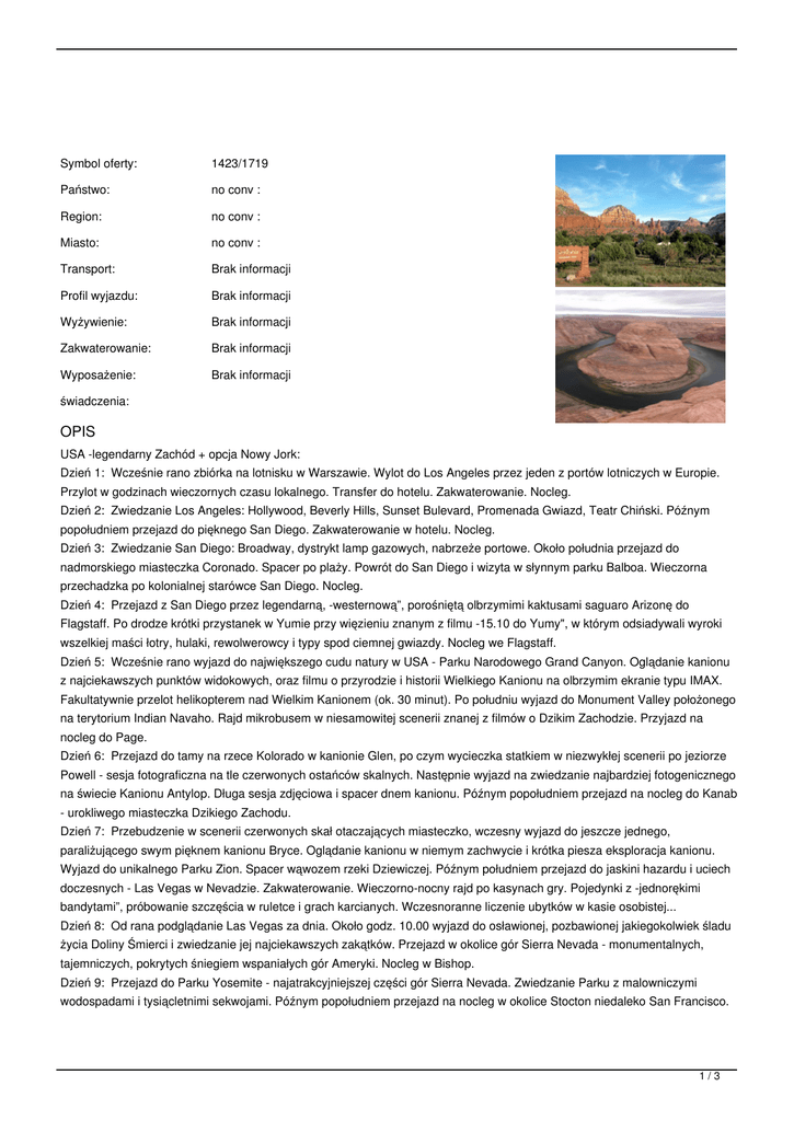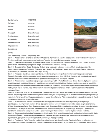 Symbol oferty: 1423/1719 Państwo: no conv : Region: no conv : Miasto: no conv : Transport: Brak informacji Profil wyjazdu: Brak informacji Wyżywienie: Brak informacji Zakwaterowanie: Brak informacji Wyposażenie: Brak informacji świadczenia: OPIS USA -legendarny Zachód + opcja Nowy Jork: Dzień 1: Wcześnie rano zbiórka na lotnisku w Warszawie. Wylot do Los Angeles przez jeden z portów lotniczych w Europie. Przylot w godzinach wieczornych czasu lokalnego. Transfer do hotelu. Zakwaterowanie. Nocleg. Dzień 2: Zwiedzanie Los Angeles: Hollywood, Beverly Hills, Sunset Bulevard, Promenada Gwiazd, Teatr Chiński. Późnym popołudniem przejazd do pięknego San Diego. Zakwaterowanie w hotelu. Nocleg. Dzień 3: Zwiedzanie San Diego: Broadway, dystrykt lamp gazowych, nabrzeże portowe. Około południa przejazd do nadmorskiego miasteczka Coronado. Spacer po plaży. Powrót do San Diego i wizyta w słynnym parku Balboa. Wieczorna przechadzka po kolonialnej starówce San Diego. Nocleg. Dzień 4: Przejazd z San Diego przez legendarną, -westernową”, porośniętą olbrzymimi kaktusami saguaro Arizonę do Flagstaff. Po drodze krótki przystanek w Yumie przy więzieniu znanym z filmu -15.10 do Yumy", w którym odsiadywali wyroki wszelkiej maści łotry, hulaki, rewolwerowcy i typy spod ciemnej gwiazdy. Nocleg we Flagstaff. Dzień 5: Wcześnie rano wyjazd do największego cudu natury w USA - Parku Narodowego Grand Canyon. Oglądanie kanionu z najciekawszych punktów widokowych, oraz filmu o przyrodzie i historii Wielkiego Kanionu na olbrzymim ekranie typu IMAX. Fakultatywnie przelot helikopterem nad Wielkim Kanionem (ok. 30 minut). Po południu wyjazd do Monument Valley położonego na terytorium Indian Navaho. Rajd mikrobusem w niesamowitej scenerii znanej z filmów o Dzikim Zachodzie. Przyjazd na nocleg do Page. Dzień 6: Przejazd do tamy na rzece Kolorado w kanionie Glen, po czym wycieczka statkiem w niezwykłej scenerii po jeziorze Powell - sesja fotograficzna na tle czerwonych ostańców skalnych. Następnie wyjazd na zwiedzanie najbardziej fotogenicznego na świecie Kanionu Antylop. Długa sesja zdjęciowa i spacer dnem kanionu. Późnym popołudniem przejazd na nocleg do Kanab - urokliwego miasteczka Dzikiego Zachodu. Dzień 7: Przebudzenie w scenerii czerwonych skał otaczających miasteczko, wczesny wyjazd do jeszcze jednego, paraliżującego swym pięknem kanionu Bryce. Oglądanie kanionu w niemym zachwycie i krótka piesza eksploracja kanionu. Wyjazd do unikalnego Parku Zion. Spacer wąwozem rzeki Dziewiczej. Późnym południem przejazd do jaskini hazardu i uciech doczesnych - Las Vegas w Nevadzie. Zakwaterowanie. Wieczorno-nocny rajd po kasynach gry. Pojedynki z -jednorękimi bandytami”, próbowanie szczęścia w ruletce i grach karcianych. Wczesnoranne liczenie ubytków w kasie osobistej... Dzień 8: Od rana podglądanie Las Vegas za dnia. Około godz. 10.00 wyjazd do osławionej, pozbawionej jakiegokolwiek śladu życia Doliny Śmierci i zwiedzanie jej najciekawszych zakątków. Przejazd w okolice gór Sierra Nevada - monumentalnych, tajemniczych, pokrytych śniegiem wspaniałych gór Ameryki. Nocleg w Bishop. Dzień 9: Przejazd do Parku Yosemite - najatrakcyjniejszej części gór Sierra Nevada. Zwiedzanie Parku z malowniczymi wodospadami i tysiącletnimi sekwojami. Późnym popołudniem przejazd na nocleg w okolice Stocton niedaleko San Francisco. 1/3 Wiosną i jesienią- przy zamkniętym wjeździe przez Przełęcz Tioga do Yosemite, będzie realizowany wariant drugi - przejazd w okolice Lake Tahoe i zwiedzanie stolicy Kalifornii - Sacramento.. Dzień 10: Przyjazd do San Francisco - według znawców jednego z najładniejszych miast świata. Zwiedzanie miasta: Rosyjskie Wzgórza, Dzielnica Chińska, rybackie nabrzeże, most Golden Gate. Wieczorem przejazd przez cieszącą się dwuznaczną sławą dzielnicę Castro. Możliwość spaceru. Nocleg w słynnej kalifornijskiej dolinie krzemowej. Dzień 11: Przejazd najbardziej malowniczą drogą w USA tzw. Jedynką, biegnącą z San Francisco do Los Angeles, wzdłuż klifowego wybrzeża Pacyfiku. Po drodze podziwianie najpiękniejszych fragmentów urwistego, poszarpanego przez ocean wybrzeża, na którym wylegują się czasem kolonie leniwych słoni morskich. Nocleg w okolicy Santa Maria. Dzień 12: Przejazd do Los Angeles. Po drodze krótkie zwiedzanie Santa Barbara - wypoczynkowej miejscowości prezydenta Reagana. Przyjazd do Los Angeles w godzinach południowych. Zwiedzanie świata techniki filmowej, rozrywki i wszelkiej ułudy Universal Studio. Wieczór pożegnalny przy kalifornijskim winie. Nocleg w LA. Dzień 13: Wcześnie rano przejazd na lotnisko. Wylot do Europy. Dzień 14: Przylot do jednego z europejskich portów lotniczych. Przerwa tranzytowa. Wylot do Warszawy. Przylot w godzinach popołudniowych. UWAGA: Istnieje możliwość przedłużenia pobytu o 1,5 dnia w Nowym Jorku: zwiedzanie Midtown (fakultatywny wjazd na Empire State Building), Grand Central Terminal, 5th Av., 42 Av., Time Square, Broadway, Statua Wolności, Ellis Island, Wall Street, NY Stock Exchange, Punkt -0”. KOSZT OPCJI: II RATA 790 PLN,?III RATA 230 USD TERMINY: 03.03 - 16.03.2016 12.03 - 25.03.2016 16.04 - 29.04.2016 14.05 - 27.05.2016 09.06 - 22.06.2016 04.07 - 17.07.2016* 08.08 - 21.08.2016* 10.09 - 23.09.2016* 08.10 - 21.10.2016 05.11 - 18.11.2016 CENA: 6 995 PLN + 1 310 USD I rata: 800 PLN płatne przy zapisie II rata: 6 995 PLN płatne na 35 dni przed imprezą (minus I rata) III rata: 1 310 USD uczestnik zabiera ze sobą CENA ZAWIERA: · bilet lotniczy na trasie Warszawa - Los Angeles - Warszawa · zakwaterowanie w hotelach i motelach 3*** (pokoje 2 os. z łazienką i klimatyzacją) · śniadania na większości trasy · opiekę pilota - przewodnika polskojęzycznego · opłaty za miejscowych przewodników · przejazdy wewnętrzne mikrobusami z klimatyzacją · ubezpieczenie Europa (KL 30 000 EUR i NNW 3 000 EUR) CENA NIE ZAWIERA: · opłaty za b