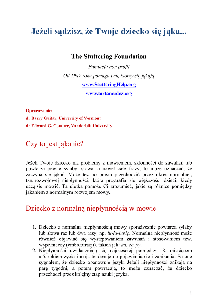 Jeżeli sądzisz, że Twoje dziecko się jąka... The Stuttering Foundation Fundacja non profit Od 1947 roku pomaga tym, którzy się jąkają www.StutteringHelp.org www.tartamudez.org Opracowanie: dr Barry Guitar, University of Vermont dr Edward G. Conture, Vanderbilt University Czy to jest jąkanie? Jeżeli Twoje dziecko ma problemy z mówieniem, skłonności do zawahań lub powtarza pewne sylaby, słowa, a nawet całe frazy, to może oznaczać, że zaczyna się jąkać. Może też po prostu przechodzić przez okres normalnej, tzn. rozwojowej niepłynności, która przytrafia się większości dzieci, kiedy uczą się mówić. Ta ulotka pomoże Ci zrozumieć, jakie są różnice pomiędzy jąkaniem a normalnym rozwojem mowy. Dziecko z normalną niepłynnością w mowie 1. Dziecko z normalną niepłynnością mowy sporadycznie powtarza sylaby lub słowa raz lub dwa razy, np. lu-lu-lubię. Normalna niepłynność może również objawiać się występowaniem zawahań i stosowaniem tzw. wypełniaczy (embołofrazji), takich jak: aa, ee, yy. 2. Niepłynności uwidaczniają się najczęściej pomiędzy 18. miesiącem a 5. rokiem życia i mają tendencje do pojawiania się i zanikania. Są one sygnałem, że dziecko opanowuje język. Jeżeli niepłynności znikają na parę tygodni, a potem powracają, to może oznaczać, że dziecko przechodzi przez kolejny etap nauki języka. 1 Dziecko z łagodnymi objawami jąkania 1. U dziecka będącego w fazie łagodnego jąkania powtórzenia zdarzają się częściej niż dwa razy, np. lu-lu-lu-lu-lubię. Objawy napięcia przy usilnych próbach wypowiedzenia dźwięku mogą być widoczne na twarzy, przede wszystkim w obrębie mięśni ust. 2. Wysokość głosu może wzrastać wraz z kolejnymi powtórzeniami i dziecko może sporadycznie doświadczać blokowania, tzn. przez parę sekund nie następuje u niego przepływ powietrza lub głosu. 3. Niepłynności mogą pojawiać się i znikać, ale są coraz częstsze w mowie dziecka. 4. Proste powtórzenia lub przedłużanie dźwięków są najłagodniejszą formą niepłynności mowy. Cokolwiek, co pozwala Twojemu dziecku jąkać się w lżejszy sposób i przezwyciężać napięcie lub omijanie słów, jest pomocne. Jak pomóc od razu? Staraj się być modelem zwolnionej i zrelaksowanej mowy, kiedy rozmawiasz z dzieckiem. Zachęcaj innych członków rodziny, by robili to samo. Nie mów zbyt wolno, by nie brzmiało to nienaturalnie, ale utrzymuj spokojne tempo, stosując liczne pauzy. Dobrym przykładem jest telewizyjny pan Rogers. Spokojna i zrelaksowana mowa jest najbardziej efektywna w tych momentach dnia, gdy dziecko jest obdarzane niepodzielną uwagą rodzica. Wygospodaruj kilka minut o podobnej porze każdego dnia, kiedy możesz całkowicie poświęcić swoją uwagę dziecku. Nie rób nic innego, jak tylko słuchaj jego wypowiedzi na jakikolwiek temat. Kiedy dziecko rozmawia z Tobą lub zadaje Ci pytania, staraj się odczekać parę sekund – zrób pauzę przed udzieleniem mu odpowiedzi. Dzięki temu rozmowa będzie wolniejsza, bardziej zrelaksowana. Staraj się nie okazywać smutku lub złości, gdy jąkanie Twojego dziecka nasila się. Ono bardzo stara się uczyć wielu nowych umiejętności jednocześnie. Twoja cierpliwość i akceptacja pomogą mu. Jeżeli Twoje dziecko jest sfrustrowane lub zasmucone z powodu pogorszenia się jego mowy, uspokój je. Niektóre dzieci dobrze reagują na słowa: „Wiem, że czasami mówienie jest trudne. Wielu ludzi potyka się w mówieniu. Wszystko jest w porządku…”. Innym dzieciom pomaga dotyk, przytulenie ich, gdy są sfrustrowane. 2 Niektóre czynniki mogą sygnalizować, że dziecko jest bardziej narażone na jąkanie się w przyszłości. Poznanie tych czynników pomoże Ci podjąć decyzję o potrzebie konsultacji logopedycznej. Zobacz zamieszczoną poniżej tabelę. Tabela czynników ryzyka Czynnik ryzyka Historia jąkania się w rodzinie Wiek dziecka w momencie wystąpienia pierwszych objawów jąkania Czas, jaki upłynął od momentu wystąpienia pierwszych objawów Płeć Inne obawy związane z mową dziecka Większe prawdopodobieństwo jąkania wczesnodziecięcego Występuje u mojego dziecka Rodzic, rodzeństwo lub inny członek rodziny, który nadal się jąka Po skończeniu 3,5 lat Jąkanie obecne w mowie dziecka od 6 do 12 miesięcy i dłużej Męska Trudności w artykułowaniu niektórych dźwięków, niezrozumiała mowa, problemy ze zrozumieniem poleceń Dziecko z nasilonym jąkaniem 1. Jeżeli Twoje dziecko jąka się w więcej niż 10% swoich wypowiedzi i mówi z dużym wysiłkiem oraz napięciem lub unika zająknięć, zmieniając słowa i używając dodatkowych dźwięków w celu rozpoczęcia wypowiedzi, korzystna będzie dla niego terapia logopedyczna. U dziecka z nasilonym jąkaniem dominującymi objawami w mowie są zablokowania, które są częstsze niż powtórzenia i przedłużanie dźwięków mowy. Zająknięcia będą się pojawiały coraz częściej. 2. Wcześniejsze sugestie dla rodziców dziecka z łagodnymi objawami jąkania są również odpowiednie w przypadku dziecka z nasilonym problemem. Spróbuj zapamiętać, że zwalnianie i zrelaksowanie Twojej 3 własnej mowy jest bardziej pomocne niż mówienie do dziecka, by zwolniło swoją mowę. 3. Nie obawiaj się porozmawiać z dzieckiem o jąkaniu. Okazuj cierpliwość i akceptację podczas takiej rozmowy. Przezwyciężanie jąkania to często pozbycie się lęku z nim związanego, a nie usilne próby pokonania go. Wskazania, jak rozmawiać z dzieckiem 1. Mów do Twojego dziecka w sposób niespieszny, rób często pauzy. Gdy Twoje dziecko skończy mówić, zaczekaj kilka sekund, nim Ty rozpoczniesz swoją wypowiedź. Twój spokojny, zrelaksowany sposób mówienia będzie znacznie bardziej skuteczny niż jakiekolwiek krytyczne uwagi lub rady typu: „zwolnij” albo „spróbuj jeszcze raz wolniej”. 2. Ogranicz liczbę pytań, które zadajesz Twojemu dziecku. Zamiast zadawać 