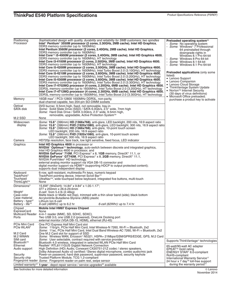 ThinkPad E540 Platform Specifications Product Specifications Reference (PSREF) Positioning Processor Preloaded operating system20 - Some: No operating system - Some: Windows 7 Professional 64 preinstalled through downgrade rights in Windows 8.1 Pro 64-bit - Some: Windows 8 Pro 64-bit - Some: Windows 8.1 64-bit - Some: Windows 8.1 Pro 64-bit Sophisticated design with quality, durability and reliability for SMB customers; two spindles Intel Pentium 3550M processor (2 cores, 2.30GHz, 2MB cache), Intel HD Graphics, DDR3 memory controller (up to 1600MHz) Intel Pentium 3560M processor (2 cores, 2.40GHz, 2MB cache), Intel HD Graphics, DDR3 memory controller (up to 1600MHz) Intel Core i3-4000M processor (2 cores, 2.40GHz, 3MB cache), Intel HD Graphics 4600, DDR3 memory controller (up to 1600MHz), HT technology Intel Core i3-4100M processor (2 cores, 2.50GHz, 3MB cache), Intel HD Graphics 4600, DDR3 memory controller (up to 1600MHz), HT technology Intel Core i5-4200M processor (2 cores, 2.50GHz, 3MB cache), Intel HD Graphics 4600, DDR3 memory controller (up to 1600MHz), Intel Turbo Boost 2.0 (3.10GHz), HT technology Intel Core i5-4210M processor (2 cores, 2.60GHz, 3MB cache), Intel HD Graphics 4600, DDR3 memory controller (up to 1600MHz), Intel Turbo Boost 2.0 (3.20GHz), HT technology Intel Core i5-4300M processor (2 cores, 2.60GHz, 3MB cache), Intel HD Graphics 4600, DDR3 memory controller (up to 1600MHz), Intel Turbo Boost 2.0 (3.30GHz), HT technology Intel Core i7-4702MQ processor (4 cores, 2.20GHz, 6MB cache), Intel HD Graphics 4600, DDR3L memory controller (up to 1600MHz), Intel Turbo Boost 2.0 (3.20GHz), HT technology Intel Core i7-4712MQ processor (4 cores, 2.30GHz, 6MB cache), Intel HD Graphics 4600, DDR3L memory controller (up to 1600MHz), Intel Turbo Boost 2.0 (3.30GHz), HT technology Memory 16GB max7 / PC3-12800 1600MHz DDR3L, non-parity, dual-channel capable, two 204-pin SO-DIMM sockets Optical DVD burner, 9.5mm high, fixed, not removable, tray-in SATA disk Some: Solid State Drive (SSD) / SATA 6.0Gb/s, 2.5" wide, 7mm high Some: Hard Disk Drive / SATA 3.0Gb/s, 2.5" wide, 9.5mm high, removable, upgradable, Active Protection System M.2 SSD None Widescreen Some:15.6" (396mm) HD (1366x768), anti-glare, LED backlight, 200 nits, 16:9 aspect ratio display Some:15.6" (396mm) FHD (1920x1080), anti-glare, LED backlight, 300 nits, 16:9 aspect ratio Some:15.6" (396mm) HD (1366x768), anti-glare, 10-point touch screen LED backlight, 200 nits, 16:9 aspect ratio Some:15.6" (396mm) FHD (1920x1080), anti-glare, 10-point touch screen LED backlight, 300 nits, 16:9 aspect ratio Camera HD720p resolution, face track, low light sensitive, fixed focus, LED indicator Graphics Intel HD Graphics 4600 in processor or NVIDIA Optimus technology, auto-switch between discrete and integrated graphics, Intel HD Graphics 4600 in processor, and NVIDIA GeForce 710M, PCI Express x 8, 1GB memory, DirectX 11.1, or NVIDIA GeForce GT740M, PCI Express x 8, 2GB memory, DirectX 11.1, NVIDIA PureVideo HD technology, external analog monitor support via VGA DB-15 connector and digital monitor support via HDMI (supporting HDCP to output protected content); supports dual independent display Keyboard 6-row, spill-resistant, multimedia Fn keys, numeric keypad TrackPoint TrackPoint pointing device, Internet Scroll Bar13 Touchpad UltraNav, wide touchpad below keyboard, integrated five buttons, multi-touch ThinkLight None Dimensions3 15.6W" (WxDxH): 14.84" x 9.84" x 1.05-1.17"; 377 x 250mm x 26.6-29.6mm Weight2 6-cell: from 5.4 lb (2.46kg) Case color Matte black or Matte red (top), trimmed with a thin silver band (side); black bottom Case material Acrylonitrile-Butadiene-Styrene (ABS) plastic Battery - type37 Lithium Ion 6-cell Battery - life10 6-cell (48Whr): up to 6.2 hr 6-cell (62Whr): up to 7.4 hr Chipset Mobile Intel HM87 Express Chipset ExpressCard None Multicard Reader 4-in-1 reader (MMC, SD, SDHC, SDXC) Ports Two USB 3.0, one USB 2.0 (powered), OneLink Docking port external monitor (VGA DB-15, HDMI), ethernet (RJ-45) PCIe Mini Card One PCI Express Half Mini Card slot PCIe WLAN4 Some: 11b/g/n, PCIe Half Mini Card, Intel Wireless-N 7260, Wi-Fi + Bluetooth, 2x2 Some: 11ac, PCIe Half Mini Card, Intel Dual Band Wireless-AC 7260, Wi-Fi + Bluetooth, 2x2 M.2 Card One M.2 Card slot for support of SSD M.2 WWAN Some: Wireless WAN, Ericsson N5321, HSPA+ 21Mbps/GSM/GPRS/EDGE, GPS, M.2 Card SIM card Some: User selectable, contract required with service provider Bluetooth Bluetooth 4.0 wireless, integrated in selected WLAN PCIe Half Mini Card Ethernet Realtek RTL8111GUS Gigabit Network Connection Audio support High Definition (HD) Audio, Conexant CX20751-21Z codec / stereo speakers, Dolby Advanced Audio v2 certified / Stereo digital microphone, combo audio/mic jack Security Power-on password, hard disk password, supervisor password, security keyhole Security chip Trusted Platform Module, TCG 1.2-compliant Fingerprint reader Some: Fingerprint reader on palm rest, swipe sensor Limited warranty12 1-year - depot repair service / service upgrades22 available See footnotes for more detailed information Preloaded applications (only some listed) • Lenovo Support • Lenovo Companion • Lenovo Cloud Storage • ThinkVantage System Update •Norton Internet Security (30 days of virus definitions) • Microsoft Office preloaded; purchase a product key to activate Supports ThinkVantage technologies 65-watt/90-watt AC adapter EPEAT Gold rating ENERGY STAR 6.0-compliant RoHS-compliant International Warranty Service17 24 hour x 7 day18 toll-free support during the warranty period12 Lenovo November 2014