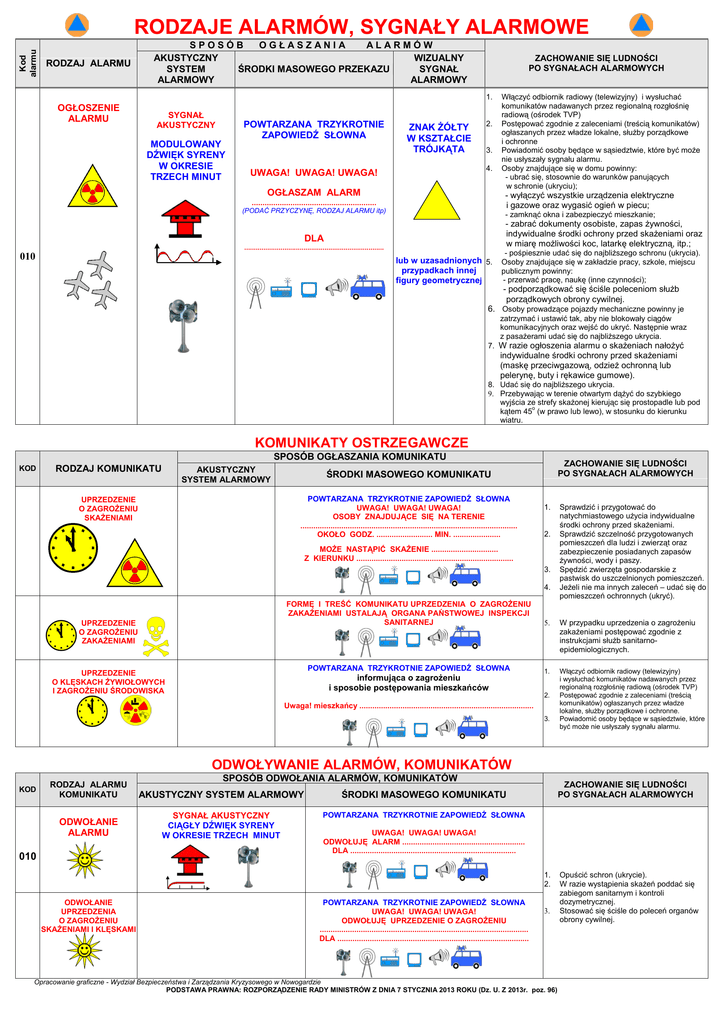 Kod alarmu RODZAJE ALARMÓW, SYGNAŁY ALARMOWE RODZAJ ALARMU SPOSÓB OGŁASZANIA ALARMÓW AKUSTYCZNY WIZUALNY SYSTEM ŚRODKI MASOWEGO PRZEKAZU SYGNAŁ ALARMOWY ALARMOWY ZACHOWANIE SIĘ LUDNOŚCI PO SYGNAŁACH ALARMOWYCH 1. OGŁOSZENIE ALARMU SYGNAŁ AKUSTYCZNY MODULOWANY DŹWIĘK SYRENY W OKRESIE TRZECH MINUT POWTARZANA TRZYKROTNIE ZAPOWIEDŹ SŁOWNA ZNAK ŻÓŁTY W KSZTAŁCIE TRÓJKĄTA 2. 3. 4. UWAGA! UWAGA! UWAGA! OGŁASZAM ALARM - wyłączyć wszystkie urządzenia elektryczne i gazowe oraz wygasić ogień w piecu; .......................................................... (PODAĆ PRZYCZYNĘ, RODZAJ ALARMU itp) - zamknąć okna i zabezpieczyć mieszkanie; - zabrać dokumenty osobiste, zapas żywności, indywidualne środki ochrony przed skażeniami oraz w miarę możliwości koc, latarkę elektryczną, itp.; DLA ......................................................................... 010 Włączyć odbiornik radiowy (telewizyjny) i wysłuchać komunikatów nadawanych przez regionalną rozgłośnię radiową (ośrodek TVP) Postępować zgodnie z zaleceniami (treścią komunikatów) ogłaszanych przez władze lokalne, służby porządkowe i ochronne Powiadomić osoby będące w sąsiedztwie, które być może nie usłyszały sygnału alarmu. Osoby znajdujące się w domu powinny: - ubrać się, stosownie do warunków panujących w schronie (ukryciu); lub w uzasadnionych 5. przypadkach innej figury geometrycznej - pośpiesznie udać się do najbliższego schronu (ukrycia). Osoby znajdujące się w zakładzie pracy, szkole, miejscu publicznym powinny: - przerwać pracę, naukę (inne czynności); - podporządkować się ściśle poleceniom służb porządkowych obrony cywilnej. 6. Osoby prowadzące pojazdy mechaniczne powinny je zatrzymać i ustawić tak, aby nie blokowały ciągów komunikacyjnych oraz wejść do ukryć. Następnie wraz z pasażerami udać się do najbliższego ukrycia. 7. W razie ogłoszenia alarmu o skażeniach nałożyć indywidualne środki ochrony przed skażeniami (maskę przeciwgazową, odzież ochronną lub pelerynę, buty i rękawice gumowe). 8. Udać się do najbliższego ukrycia. 9. Przebywając w terenie otwartym dążyć do szybkiego wyjścia ze strefy skażonej kierując się prostopadle lub pod o kątem 45 (w prawo lub lewo), w stosunku do kierunku wiatru. KOMUNIKATY OSTRZEGAWCZE SPOSÓB OGŁASZANIA KOMUNIKATU KOD RODZAJ KOMUNIKATU AKUSTYCZNY SYSTEM ALARMOWY POWTARZANA TRZYKROTNIE ZAPOWIEDŹ SŁOWNA UWAGA! UWAGA! UWAGA! OSOBY ZNAJDUJĄCE SIĘ NA TERENIE ..................................................................................................... OKOŁO GODZ. .......................... MIN. ...................... UPRZEDZENIE O ZAGROŻENIU SKAŻENIAMI ZACHOWANIE SIĘ LUDNOŚCI PO SYGNAŁACH ALARMOWYCH ŚRODKI MASOWEGO KOMUNIKATU 1. 2. MOŻE NASTĄPIĆ SKAŻENIE ............................... Z KIERUNKU ......................................................................... 3. 4. UPRZEDZENIE O ZAGROŻENIU ZAKAŻENIAMI Sprawdzić i przygotować do natychmiastowego użycia indywidualne środki ochrony przed skażeniami. Sprawdzić szczelność przygotowanych pomieszczeń dla ludzi i zwierząt oraz zabezpieczenie posiadanych zapasów żywności, wody i paszy. Spędzić zwierzęta gospodarskie z pastwisk do uszczelnionych pomieszczeń. Jeżeli nie ma innych zaleceń – udać się do pomieszczeń ochronnych (ukryć). FORMĘ I TREŚĆ KOMUNIKATU UPRZEDZENIA O ZAGROŻENIU ZAKAŻENIAMI USTALAJĄ ORGANA PAŃSTWOWEJ INSPEKCJI SANITARNEJ 5. W przypadku uprzedzenia o zagrożeniu zakażeniami postępować zgodnie z instrukcjami służb sanitarnoepidemiologicznych. POWTARZANA TRZYKROTNIE ZAPOWIEDŹ SŁOWNA 1. Włączyć odbiornik radiowy (telewizyjny) i wysłuchać komunikatów nadawanych przez regionalną rozgłośnię radiową (ośrodek TVP) Postępować zgodnie z zaleceniami (treścią komunikatów) ogłaszanych przez władze lokalne, służby porządkowe i ochronne. Powiadomić osoby będące w sąsiedztwie, które być może nie usłyszały sygnału alarmu. UPRZEDZENIE O KLĘSKACH ŻYWIOŁOWYCH I ZAGROŻENIU ŚRODOWISKA informująca o zagrożeniu i sposobie postępowania mieszkańców 2. Uwaga! mieszkańcy ................................................................................. 3. ODWOŁYWANIE ALARMÓW, KOMUNIKATÓW KOD SPOSÓB ODWOŁANIA ALARMÓW, KOMUNIKATÓW RODZAJ ALARMU KOMUNIKATU AKUSTYCZNY SYSTEM ALARMOWY ŚRODKI MASOWEGO KOMUNIKATU ODWOŁANIE ALARMU SYGNAŁ AKUSTYCZNY CIĄGŁY DŹWIĘK SYRENY W OKRESIE TRZECH MINUT POWTARZANA TRZYKROTNIE ZAPOWIEDŹ SŁOWNA 010 ZACHOWANIE SIĘ LUDNOŚCI PO SYGNAŁACH ALARMOWYCH UWAGA! UWAGA! UWAGA! ODWOŁUJĘ ALARM ......................................................... DLA ............................................................................. 1. 2. ODWOŁANIE UPRZEDZENIA O ZAGROŻENIU SKAŻENIAMI I KLĘSKAMI POWTARZANA TRZYKROTNIE ZAPOWIEDŹ SŁOWNA UWAGA! UWAGA! UWAGA! ODWOŁUJĘ UPRZEDZENIE O ZAGROŻENIU ................................................................................................. DLA ......................................................................................... 3. Opracowanie graficzne - Wydział Bezpieczeństwa i Zarządzania Kryzysowego w Nowogardzie PODSTAWA PRAWNA: ROZPORZĄDZENIE RADY MINISTRÓW Z DNIA 7 STYCZNIA 2013 ROKU (Dz. U. Z 2013r. poz. 96) Opuścić schron (ukrycie). W razie wystąpienia skażeń poddać się zabiegom sanitarnym i kontroli dozymetrycznej. Stosować się ściśle do poleceń organów obrony cywilnej.