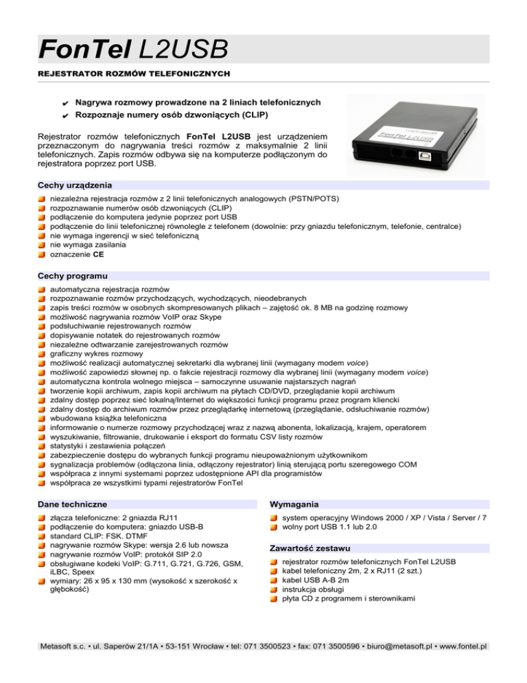 FonTel L2USB REJESTRATOR ROZMÓW TELEFONICZNYCH ✔ Nagrywa rozmowy prowadzone na 2 liniach telefonicznych ✔ Rozpoznaje numery osób dzwoniących (CLIP) Rejestrator rozmów telefonicznych FonTel L2USB jest urządzeniem przeznaczonym do nagrywania treści rozmów z maksymalnie 2 linii telefonicznych. Zapis rozmów odbywa się na komputerze podłączonym do rejestratora poprzez port USB. Cechy urządzenia niezależna rejestracja rozmów z 2 linii telefonicznych analogowych (PSTN/POTS) rozpoznawanie numerów osób dzwoniących (CLIP) podłączenie do komputera jedynie poprzez port USB podłączenie do linii telefonicznej równolegle z telefonem (dowolnie: przy gniazdu telefonicznym, telefonie, centralce) nie wymaga ingerencji w sieć telefoniczną nie wymaga zasilania oznaczenie CE Cechy programu automatyczna rejestracja rozmów rozpoznawanie rozmów przychodzących, wychodzących, nieodebranych zapis treści rozmów w osobnych skompresowanych plikach – zajętość ok. 8 MB na godzinę rozmowy możliwość nagrywania rozmów VoIP oraz Skype podsłuchiwanie rejestrowanych rozmów dopisywanie notatek do rejestrowanych rozmów niezależne odtwarzanie zarejestrowanych rozmów graficzny wykres rozmowy możliwość realizacji automatycznej sekretarki dla wybranej linii (wymagany modem voice) możliwość zapowiedzi słownej np. o fakcie rejestracji rozmowy dla wybranej linii (wymagany modem voice) automatyczna kontrola wolnego miejsca – samoczynne usuwanie najstarszych nagrań tworzenie kopii archiwum, zapis kopii archiwum na płytach CD/DVD, przeglądanie kopii archiwum zdalny dostęp poprzez sieć lokalną/Internet do większości funkcji programu przez program kliencki zdalny dostęp do archiwum rozmów przez przeglądarkę internetową (przeglądanie, odsłuchiwanie rozmów) wbudowana książka telefoniczna informowanie o numerze rozmowy przychodzącej wraz z nazwą abonenta, lokalizacją, krajem, operatorem wyszukiwanie, filtrowanie, drukowanie i eksport do formatu CSV listy rozmów statystyki i zestawienia połączeń zabezpieczenie dostępu do wybranych funkcji programu nieupoważnionym użytkownikom sygnalizacja problemów (odłączona linia, odłączony rejestrator) linią sterującą portu szeregowego COM współpraca z innymi systemami poprzez udostępnione API dla programistów współpraca ze wszystkimi typami rejestratorów FonTel Dane techniczne złącza telefoniczne: 2 gniazda RJ11 podłączenie do komputera: gniazdo USB-B standard CLIP: FSK. DTMF nagrywanie rozmów Skype: wersja 2.6 lub nowsza nagrywanie rozmów VoIP: protokół SIP 2.0 obsługiwane kodeki VoIP: G.711, G.721, G.726, GSM, iLBC, Speex wymiary: 26 x 95 x 130 mm (wysokość x szerokość x głębokość) Wymagania system operacyjny Windows 2000 / XP / Vista / Server / 7 wolny port USB 1.1 lub 2.0 Zawartość zestawu rejestrator rozmów telefonicznych FonTel L2USB kabel telefoniczny 2m, 2 x RJ11 (2 szt.) kabel USB A-B 2m instrukcja obsługi płyta CD z programem i sterownikami Metasoft s.c. • ul. Saperów 21/1A • 53-151 Wrocław • tel: 071 3500523 • fax: 071 3500596 • [email protected] • www.fontel.pl