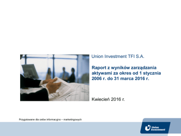 Union Investment TFI S.A. Raport z wyników zarządzania aktywami za okres od 1 stycznia 2006 r. do 31 marca 2016 r. Kwiecień 2016 r. Przygotowane dla celów informacyjno – marketingowych Spis treści 1 Oświadczenia Firmy 2 Opis kompozytów oraz wyniki zarządzania aktywami 2.1. Fundusze inwestycyjne 2.2. Portfele Asset Management 3 Pozostałe ujawnienia 1. Oświadczenia Firmy 31.03.2016 3 Klauzula ● Prezentacja wyników zarządzania aktywami została sporządzona dla celów informacyjno-marketingowych i nie stanowi rekomendacji, doradztwa inwestycyjnego ani prognozy, nie jest ofertą ani zaproszeniem do zgłoszenia oferty kupna/sprzedaży instrumentów finansowych, doradztwa ani żadnej innej usługi inwestycyjnej czy produktu. ● Publikacja te nie jest adresowana do konkretnych osób ani podmiotów i nie uwzględnia celów inwestycyjnych, sytuacji finansowej, poziomu ryzyka ani potrzeb poszczególnych klientów. Przed podjęciem jakiejkolwiek decyzji inwestycji w produkty Union Investment TFI S.A. potencjalny klient powinien zapoznać się z informacjami dotyczącymi ryzyka inwestycji, opłat, prowizji i innych kosztów związanych z produktem oraz niezbędne jest dokonanie oceny, czy dany produkt odpowiada jego celom inwestycyjnym, zdolności do ponoszenia ryzyka, oraz jego poziomowi wiedzy i doświadczenia inwestycyjnego. ● Inwestowanie w niektóre instrumenty finansowe może charakteryzować się dużą zmiennością wartości i w przypadku realizacji inwestycji klient może otrzymać kwotę niższą od kwoty wpłaconej. Zmiany kursów walutowych mogą mieć negatywny wpływ na cenę, wartość lub przychód z inwestycji. Jeśli waluta, w której denominowane jest dany produkt jest inna od waluty krajowej klienta, zwrot z inwestycji może zwiększać się lub zmniejszać w zależności od fluktuacji kursów walutowych. ● Inwestowanie w finansowe kontrakty terminowe odznaczają się dużą dźwignią finansową, która powoduje, że niewielka zmiana ceny kontraktu terminowego powoduje duży wpływ na osiąganą stopę zwrotu z zainwestowanego kapitału. W rezultacie klient może uzyskiwać wysokie zyski, ale także musi liczyć się z utratą części lub całości zainwestowanego kapitału. ● Stopy zwrotu osiągnięte w przeszłości nie są wiarygodnym wskaźnikiem przyszłych wyników inwestycyjnych. ● Kompozyt jest zbiorem portfeli, charakteryzujących się podobną strategią inwestycyjną lub celem inwestycyjnym. Klient nie ma możliwości zainwestowania aktywów bezpośrednio w kompozyt. Klient ma możliwość zainwestowania w fundusze inwestycyjne lub strategie, w oparciu o które zarządzane są portfele Asset Management tworzące kompozyt. ● Poziomy opodatkowania klienta, zależą od indywidualnej sytuacji klienta oraz jego statusu podatkowego i mogą w przyszłości ulegać zmianom . ● Publikacja ta, w całości ani w części nie może być reprodukowana w żaden sposób bez zgody Union Investment TFI S.A. 1. Oświadczenia Firmy 31.03.2016 4 Oświadczenia Firmy ● Niniejszy Raport z Wyników Zarządzania Aktywami został sporządzony przez Union Investment TFI S.A. zgodnie ze Światowymi Standardami Prezentacji Wyników i Zarządzania Aktywami (Global Investment Performance Standards (GIPS®)). ● Za tworzenie, wdrażanie i utrzymywanie mechanizmów kontroli, zapewniających prawidłowe ujęcie wszystkich danych, kalkulację i prezentację wyników zarządzania aktywami w niniejszym raporcie odpowiada Zarząd Union Investment TFI S.A. Małgorzata Góra - Dubiela Prezes Zarządu Warszawa, 31 marca 2016 roku Zbigniew Jakubowski Wiceprezes Zarządu Małgorzata Popielewska Członek Zarządu 1. Oświadczenia Firmy 31.03.2016 5 Definicja Firmy ● Firmą w rozumieniu standardów GIPS® jest Union Investment TFI S.A., spółka akcyjna działająca na podstawie Kodeksu Spółek Handlowych, która w dniu 1 czerwca 1995 (nr decyzji KPW-40731/95) uzyskała zezwolenie Komisji Papierów Wartościowych i Giełd (obecnie Komisji Nadzoru Finansowego) na wykonywanie działalności polegającej na tworzeniu i zarządzaniu funduszami inwestycyjnymi. ● W dniu 29 października 2004 r. (nr decyzji DFI/W/4030-7-6-4503/04) Union Investment TFI S.A. uzyskała zezwolenie Komisji Nadzoru Finansowego na zarządzanie cudzym pakietem papierów wartościowych na zlecenie. ● W okresie sprawozdawczym definicja Firmy nie uległa zmianie. ● Szczegółowy opis warunków świadczenia usług zarządzania znajduje się w Statutach Funduszy Inwestycyjnych oraz w Regulaminie Świadczenia Usług Zarządzania Cudzym Pakietem Instrumentów Finansowych na Zlecenie, dostępnych na stronie internetowej www.union-investment.pl. ● Pełna lista kompozytów wraz z ich szczegółowym opisem dostępna jest na życzenie Klientów. 1. Oświadczenia Firmy 31.03.2016 6 Status Firmy w zakresie weryfikacji Oświadczenie Firmy o zgodności sporządzenia prezentacji wyników zarządzania aktywami ze standardami GIPS® za okres 01.01.2003 - 31.12.2007 było przedmiotem weryfikacji przez Ernst & Young Audit Sp. z o.o. Weryfikacja ta nie obejmowała badania wyników inwestycyjnych żadnego z kompozytów przedstawionych przez Firmę w załączonej prezentacji. Raport z weryfikacji jest dostępny na życzenie klientów. Spis treści 1 Oświadczenia Firmy 2 Opis kompozytów oraz wyniki zarządzania aktywami 2.1. Fundusze inwestycyjne 2.2. Portfele Asset Management 3 Pozostałe ujawnienia 2. Opis kompozytów oraz wyniki zarządzania aktywami 2.1. Fundusze inwestycyjne 31.03.2016 8 Kompozyt Akcji Polskich Union Investment TFI SA sporządziło i przedstawia niniejszy raport zgodnie ze Światowymi Standardami Prezentacji Wyników Zarządzania Aktywami (GIPS®) 200% Stopa zwrotu kompozytu Okres zarządzania Ref erencyjna stopa zwrotu 150% 100% 50% 0% sty 06 wrz 07 maj 09 sty 11 wrz 12 maj 14 sty 16 Stopa zw rotu ogółem Referencyjna Liczba stopa portfeli zw rotu 2015 2014 2013 2012 2011 2010 2009 2008 2007 2006 %