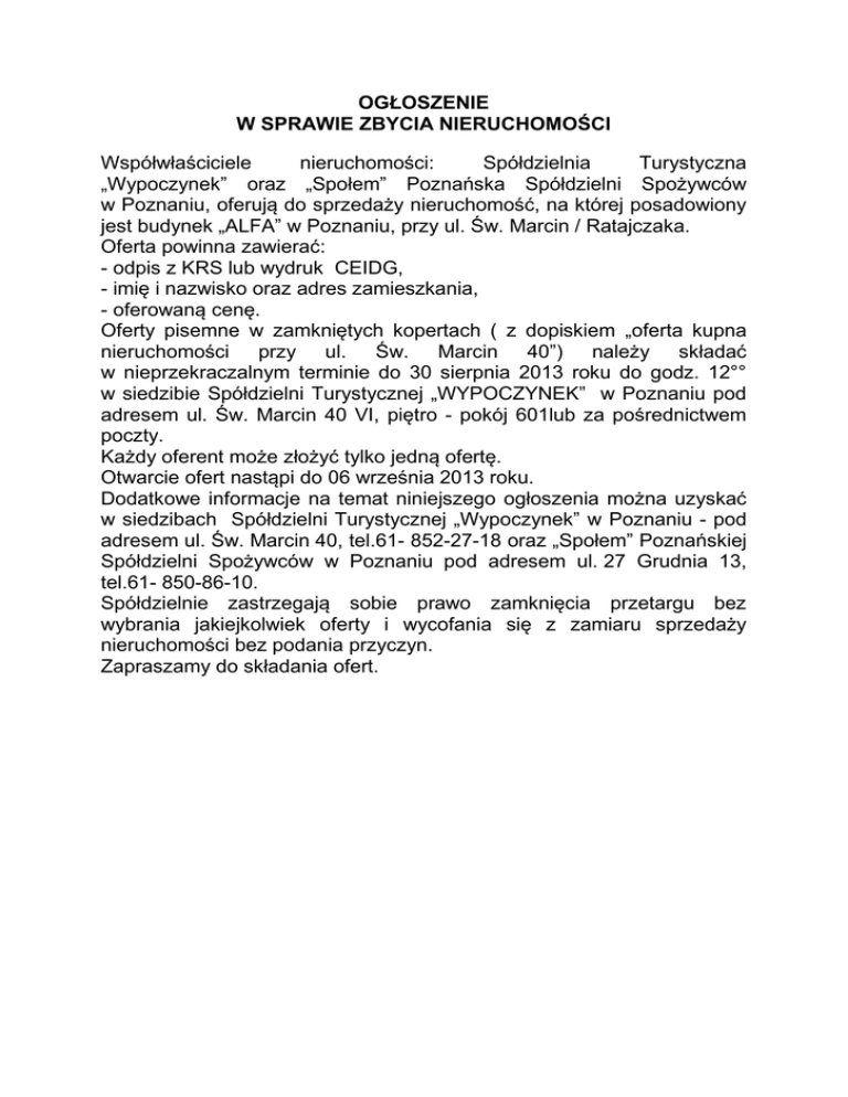 OGŁOSZENIE W SPRAWIE ZBYCIA NIERUCHOMOŚCI Współwłaściciele nieruchomości: Spółdzielnia Turystyczna „Wypoczynek” oraz „Społem” Poznańska Spółdzielni Spożywców w Poznaniu, oferują do sprzedaży nieruchomość, na której posadowiony jest budynek „ALFA” w Poznaniu, przy ul. Św. Marcin / Ratajczaka. Oferta powinna zawierać: - odpis z KRS lub wydruk CEIDG, - imię i nazwisko oraz adres zamieszkania, - oferowaną cenę. Oferty pisemne w zamkniętych kopertach ( z dopiskiem „oferta kupna nieruchomości przy ul. Św. Marcin 40”) należy składać w nieprzekraczalnym terminie do 30 sierpnia 2013 roku do godz. 12°° w siedzibie Spółdzielni Turystycznej „WYPOCZYNEK” w Poznaniu pod adresem ul. Św. Marcin 40 VI, piętro - pokój 601lub za pośrednictwem poczty. Każdy oferent może złożyć tylko jedną ofertę. Otwarcie ofert nastąpi do 06 września 2013 roku. Dodatkowe informacje na temat niniejszego ogłoszenia można uzyskać w siedzibach Spółdzielni Turystycznej „Wypoczynek” w Poznaniu - pod adresem ul. Św. Marcin 40, tel.61- 852-27-18 oraz „Społem” Poznańskiej Spółdzielni Spożywców w Poznaniu pod adresem ul. 27 Grudnia 13, tel.61- 850-86-10. Spółdzielnie zastrzegają sobie prawo zamknięcia przetargu bez wybrania jakiejkolwiek oferty i wycofania się z zamiaru sprzedaży nieruchomości bez podania przyczyn. Zapraszamy do składania ofert.