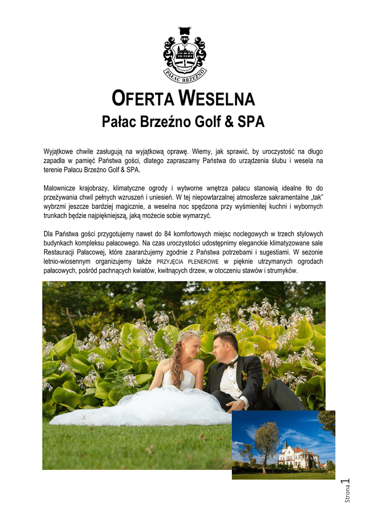 OFERTA WESELNA Pałac Brzeźno Golf & SPA Wyjątkowe chwile zasługują na wyjątkową oprawę. Wiemy, jak sprawić, by uroczystość na długo zapadła w pamięć Państwa gości, dlatego zapraszamy Państwa do urządzenia ślubu i wesela na terenie Pałacu Brzeźno Golf & SPA. Malownicze krajobrazy, klimatyczne ogrody i wytworne wnętrza pałacu stanowią idealne tło do przeżywania chwil pełnych wzruszeń i uniesień. W tej niepowtarzalnej atmosferze sakramentalne „tak” wybrzmi jeszcze bardziej magicznie, a weselna noc spędzona przy wyśmienitej kuchni i wybornych trunkach będzie najpiękniejszą, jaką możecie sobie wymarzyć. Strona 1 Dla Państwa gości przygotujemy nawet do 84 komfortowych miejsc noclegowych w trzech stylowych budynkach kompleksu pałacowego. Na czas uroczystości udostępnimy eleganckie klimatyzowane sale Restauracji Pałacowej, które zaaranżujemy zgodnie z Państwa potrzebami i sugestiami. W sezonie letnio-wiosennym organizujemy także PRZYJĘCIA PLENEROWE w pięknie utrzymanych ogrodach pałacowych, pośród pachnących kwiatów, kwitnących drzew, w otoczeniu stawów i strumyków. Koktajl powitalny Tradycyjne powitanie młodych chlebem i solą, lampka wina musującego Cena – 15 PLN/os UROCZYSTY OBIAD Przystawki (jedna do wyboru) bresaola z ruccolą i parmezanem pasztet gęsi z żurawiną szynka parmeńska podana na ananasie sałatka caprese krewetki z sosem szafranowym sałatka z arbuzem, serem feta i miętą sałatka szefa kuchni : mix świeżych sałat z własnego ogrodu podana z świeżym ogórkiem i pomidorem z grillowanym kurczakiem w sezamie befsztyk tatarski na grzance Zupy (jedna do wyboru) cena od 12 PLN/os Cena od 12 PLN/os tradycyjny rosół z domowym makaronem lub kołdunami krem z pomidorów ze świeżą bazylią żurek w chlebie z jajkiem zupa borowikowa zupa cebulowa na białym winie z grzanką serową trójkolorowy krem – ze szpinaku, z pomidorów i z selera barszcz czerwony z kołdunami Danie główne (jedno do wyboru) Cena od 32 PLN /os Zrazy wołowe z ekologicznej wołowiny Grillowany filet z indyka przekładany bakłażanem i zapiekany pod serem podany z sosem tymiankowym roladki cielęce z szałwią w sosie kurkowym sakiewki wieprzowe faszerowane warzywami roladki drobiowe faszerowana szpinakiem w sosie koperkowym udko z kaczki w sosie pieczeniowym grillowane polędwiczki wieprzowe w sosie kurkowym dziczyzna marynowana w czerwonym winie przygotowana metodą „sous vide” filet z sandacza na szpinaku smażony filet z pstrąga kłodzkiego z warzywami roladki z soli z warzywami z sosem cytrynowym stek z łososia pieczony w cieście francuskim z łamanym pieprzem grillowane warzywa: cukinia, pomidor i papryka podane z ryżem Dodatki do dań głównych Strona ziemniaki gotowane z koperkiem (gotowane w całości, młode w sezonie, purée) ziemniaki pieczone z czosnkiem i rozmarynem kluski śląskie ryż z warzywami kasza gryczana lub jaglana mizeria pomidory z cebulką w śmietanie wybór surówek sezonowych ( buraczki, marchewka, kapusta) surówka z kapusty czerwonej z jabłkiem i rodzynkami kapusta biała ( sezonowo młoda) z koperkiem i śmietaną zasmażana marchewka z groszkiem zasmażane buraczki surówka z selera z rodzynkami bukiet warzyw gotowanych z masłem i ziołami duszone pieczarki surówka z pora 2 Cena od 5 PLN/os Desery (jeden do wyboru) Cena od 12 PLN/os sałatka owocowa z winem musującym i miętą puchar lodów suflet czekoladowy drożdżówka podana na ciepło sernik z musem malinowym szarlotka podana na ciepło z lodami Bufet zimnych przekąsek Cena od 5 PLN/os za 1 składnik wybór mięs i wędlin własnego wyrobu pasztet domowy z musem żurawinowym pasztet z gęsiny roladki z boczku galaretki drobiowe lub wieprzowe deska serów pleśniowych i dojrzewających rożki z szynki z musem chrzanowym ryba po grecku śledzie w oleju, śmietanie i pomidorach półmisek ryb wędzonych sałatka jarzynowa sałatka grecka sałatka gyros rostbef ze szparagami z sosem tatarskim wybór świeżych warzyw i pikli z sosami świeżo wypiekane pieczywo i masło Bufet dań gorących Dania serwowane późną porą Cena od 12 PLN/os barszcz czerwony z krokietem lub pasztecikami boeuf strogonoff flaczki wołowe z pieczywem grillowana karkówka podana z ziemniakami gratin i surówką zrazy wołowe z kopytkami i pieczonymi buraczkami Specjały szefa kuchni Cena od 15 PLN/os za 1 składnik zupa gulaszowa szaszłyki drobiowe w ostrym sosie pieczeń wieprzowa w sosie własnym rogu z indyka z pieczarkami klopsiki cielęce w sosie kurkowym lub pietruszkowym gołąbki z ryżem lub kaszą w sosie pomidorowym lub grzybowym pierogi własnego wyrobu: ruskie, ze szpinakiem lub z mięsem naleśniki w sosie pomidorowym zapiekane z serem grillowany camembert z żurawiną pikantne skrzydełka drobiowe roladki z miruny pieczarki faszerowane kompozycja warzyw gotowanych na parze na specjalne zamówienie udziec pieczony w całości z dodatkami: pieczonymi ziemniakami, kaszą, kapustą z grzybami, sosem tatarskim lub cumberland paella z krewetkami „black Tiger” i czosnkowym dipem 3 Strona Bufet deserów Cena od 10 PLN/os wybór galaretek i musów koktajlowych szarlotka sernik sernik na zimno drożdżówka fontanna czekoladowa z owocami Menu dla dzieci Cena – 50 PLN/os Rosół drobiowy z domowym makaronem Filet z kurczaka z frytkami i surówką z marchewki Puchar lodów z sosem czekoladowym Wycena dokonywana jest po wybraniu dań. Ceny zawierają podatek VAT. ALKOHOLE OPEN BAR Opcja 1 Nielimitowane spożycie napoi do 6 godzin: soki owocowe, napoje gazowane typu coca cola, fanta, sprite Woda mineralna gazowana i niegazowana Kawa i herbata 35 PLN od osoby Opcja 2 Nielimitowane spożycie napoi do 6 godzin: soki owocowe, napoje gazowane typu coca cola, fanta, sprite Woda mineralna gazowana i niegazowana Kawa i herbata Alkoholi: wino, piwo 90 PLN od osoby Opcja 3 Nielimitowane spożycie napoi do 6 godzin: soki owocowe, napoje gazowane typu coca cola, 