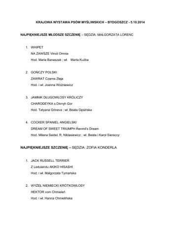 KRAJOWA WYSTAWA PSÓW MYŚLIWSKICH – BYDGOSZCZ - 5.10.2014 NAJPIĘKNIEJSZE MŁODSZE SZCZENIĘ – SĘDZIA: MAŁGORZATA LORENC 1. WHIPET NA ZAWSZE Vincit Omnia Hod. Maria Banaszak ; wł. Marta Kuźba 2. GOŃCZY POLSKI ZAWRAT Czarna Złaja Hod. i wł. Joanna Woźniewicz 3. JAMNIK DŁUGOWŁOSY KRÓLICZY CHARODEYKA s Divnyh Gor Hod. Tatyana Grineva ; wł. Beata Gęsińska 4. COCKER SPANIEL ANGIELSKI DREAM OF SWEET TRIUMPH Renmil’s Dream Hod. Milena Seidel, R. Niklasiewicz ; wł. Beata i Karol Sieraccy NAJPIĘKNIEJSZE SZCZENIĘ – SĘDZIA: ZOFIA KONDERLA 1. JACK RUSSELL TERRIER Z Ledulandu AKIKO HISASHI Hod. i wł. Małgorzata Tymańska 2. WYŻEŁ NIEMIECKI KRÓTKOWŁOSY HEKTOR vom Chmieleń Hod. i wł. Hanna Chmielińska 3. CHART AFGAŃSKI NATALIA VODINOVA Y – shirvan Hod. i wł. Stephane Adrianes (Belgia) 4. WYŻEŁ WĘGIERSKI KRÓTKOWŁOSY Luxatori BAJOS OF CSERENCI Hod. Rafał Kamiński ; wł. Rafał Kamiński, Agnieszka Kamińska NAJPIĘKNIEJSZY JUNIOR – SĘDZIA: MAŁGORZATA LORENC 1. GOŃCZY POLSKI MÓJ ZBÓJ El – Halem Hod. i wł. Maria Minakowska 2. CHART AFGAŃSKI NIJI KAHANI A DOSE OF DEJA VU Hod. Reka Kiss ; wł. Marek Józefiak 3. SPRINGER SPANIEL ANGIELSKI PIECE OF GOLD Venandi Peritu Hod. Monika Węgrocka ; wł.Hanna Ciemiecka 4. AIREDALE TERRIER FLAIRE M MARVEL Hod. Hanna Gajewska ; wł. Elena Baranowska NAJPIĘKNIEJSZY WETERAN – SĘDZIA: LESZEK SIEJKOWSKI 1. WYŻEŁ NIEMIECKI SZORSTKOWŁOSY GAJA Spokojne Łowisko (ur. 22.4.2006 r.) Hod. i wł. Henryk Tomaszewski 2. POSOKOWIEC BAWARSKI SALWA HUBERTOWY Druh (ur. 3.6.2006 r.) Hod. Piotr Radomski ; wł. Anna Styczyńska 3. COCKER SPANIEL ANGIELSKI XANTHOS z Vejminku ( ur. 17.11.2004 r.) Hod. Pavel Sulcek ; wł. Beata i Karol Sieraccy 4. JAMNIK DŁUGOWŁOSY MINIATUROWY ARABESKA z Końskiego Raju (ur. 11.4.2001 r.) Hod. i wł. Elżbieta Olszańska NAJPIĘKNIEJSZY PIES UŻYTKOWY - SĘDZIA: LESZEK SIEJKOWSKI 1. GOŃCZY POLSKI WALENTYNKA El – Halem Hod. i wł. Maria Minakowska 2. POSOKOWIEC BAWARSKI NIKI z Doliny Górnej Wisły Hod. Stanisław Rejman ; wł. Joanna Przygórska 3. JAMNIK KRÓTKOWŁOSY STANDARDOWY ZORAN – CZUK Hodowla Myślinów Hod. Wanda Oleszczuk ; wł. Anna Kędziora 4. JAMNIK SZORSTKOWŁOSY STANDARDOWY DUNAJ Złamany Szeląg Hod. M. Z. Wawrzyniak ; wł. Stefan Miesojed GRUPA III - SĘDZIA: ZOFIA KONDERLA 1. TERIER SZKOCKI Tecono KIROMBO Hod. Katarzyna Batura ; wł. Joanna Śmidoda 2. WEST HIGHLAND WHITE TERRIER JONATHAN Sunshine Celebration Hod. Krisova Martina ; wł. Katarzyna Jurkowska 3. AIREDALE TERRRIER ZANETTI Ruvido Hod. Marta Kuligowska ; wł. Jolanta Lomber, Ryszard Lomber 4. TERIER WALIJSKI MORISA Bżanci Raj Hod. i wł. Irena Kobylarz GRUPA IV - SĘDZIA: MARIA WAWRZYNIAK 1. JAMNIK SZORSTKOWŁOSY MINIATUROWY POHANIEC Red Horses Hod. i wł. Beata Żyder 2. JAMNIK KRÓTKOWŁOSY STANDARDOWY ZORAN – CZUK Hodowla Myślinów Hod. Wanda Oleszczuk ; wł. Anna Kędziora 3. JAMNIK DŁUGOWŁOSY KRÓLICZY DIEGO Kreskomania Hod. Mirosław Zwierzyński ; wł. Marzena Fenkanin 4. JAMNIK DŁUGOWŁOSY MINIATUROWY CHESTER Senergetti Hod. i wł. Mariola Nowak GRUPA V - SĘDZIA: LESZEK SIEJKOWSKI 1. KARELSKI PIES NA NIEDŹWIEDZIE PANDA Krajeńska Kraina Hod. i wł. Jacek Krzyżanowski GRUPA VI - SĘDZIA: MAŁGORZATA LORENC 1. GOŃCZY POLSKI MÓJ ZBÓJ El – Halem Hod. i wł. Maria Minakowska 2. GOŃCZY SCHILLERA FAUNA z Ostowej Ostoi Hod. J.T. Oset ; wł. Anna i Janusz Jedlińscy 3. OGAR POLSKI WESTA z Zatrzebia Hod. Katarzyna Matuszewska ; wł. Aneta Mischke 4. BASSET HOUND BROMBA Ze Stajennych Progów Hod. i wł. Katarzyna Buksa GRUPA VII - SĘDZIA: LESZEK SIEJKOWSKI 1. SETER SZKOCKI – GORDON LARSON Black Ivy Hod. Agata Witkowska ; wł. Agata Piaścik 2. WYŻEŁ CZESKI SZORSTKOWŁOSY KOKSA Rawicka Sfora Hod. Dariusz Domaniecki ; wł. Tomasz Sławiński 3. POINTER ZEUS z Halikarnasu Hod. Barbara Szafran, Krzysztof Sulej ; wł. Angelika Feculak 4. WYŻEŁ NIEMIECKI SZORSTKOWŁOSY IKAR Spokojne Łowisko Hod. i wł. Henryk Tomaszewski GRUPA VIII - SĘDZIA: MAŁGORZATA LORENC 1. LABRADOR RETRIEVER DICKENDALL MAY MORNING AT BELLA MARE Hod. Kendall Herr, Faith Hyndmann ; wł. Monika Dowgiałło, Sonia Czajor 2. PŁOCHACZ NIEMIECKI WACHTELHUND GOYA z Wdeckiego Parku Hod. Ryszard Rezmer ; wł. Dariusz Rutkowski 3. SPRINGER SPANIEL ANGIELSKI PIECE OF GOLD Venandi Peritu Hod. Monika Węgrocka ; wł.Hanna Ciemiecka 4. COCKER SPANIEL ANGIELSKI HALLO Psy Przyszłości Hod. Beata i Karol Sieraccy ; wł. Beata Rausz GRUPA X - SĘDZIA: MAŁGORZATA LORENC 1. WHIPPET MY FREND THE WIND Vincit Omnia Hod. Maria Banasiak ; wł. Marta Kuźba 2. CHART POLSKI AMBASADOR Herbu Węszynos Hod. Beata Kielar ; wł. Iwona Kurek – Krzyżewska, Bogusław Krzyżewski 3. CHART ROSYJSKI BORZOJ CASANOVA Negrus Hod. i wł. Justyna Bielicka 4. CHART AFGAŃSKI NIJI KAHANI A DOSE OF DEJA VU Hod. Reka Kiss ; wł. Marek Józefiak NAJPIĘKNIEJSZY PIES KRAJOWEJ WYSTAWY PSÓW MYŚLIWSKICH BYDGOSZCZ - 5.10. 2014 R. SĘDZIA: ZOFIA KONDERLA 1. TERIER SZKOCKI Tecono KIROMBO Hod. Katarzyna Batura ; wł. Joanna Śmidoda 2. LABRADOR RETRIEVER DICKENDALL MAY MORNING AT BELLA MARE Hod. Kendall Herr, Faith Hyndmann ; wł. Monika Dowgiałło, Sonia Czajor 3. SETER SZKOCKI – GORDON LARSON Black Ivy Hod. Agata Witkowska ; wł. Agata Piaścik 4. GOŃCZY POLSKI MÓJ ZBÓJ El – Halem Hod. i wł. Maria Minakowska