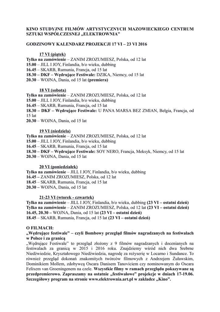 KINO STUDYJNE FILMÓW ARTYSTYCZNYCH MAZOWIECKIEGO CENTRUM SZTUKI WSPÓŁCZESNEJ „ELEKTROWNIA” GODZINOWY KALENDARZ PROJEKCJI 17 VI – 23 VI 2016 17 VI (piątek) Tylko na zamówienie – ZANIM ZROZUMIESZ, Polska, od 12 lat 15.00 – JILL I JOY, Finlandia, b/o wieku, dubbing 16.45 – SKARB, Rumunia, Francja, od 15 lat 18.30 – DKF – Wędrujące Festiwale: DZIKA, Niemcy, od 15 lat 20.30 – WOJNA, Dania, od 15 lat (premiera) 18 VI (sobota) Tylko na zamówienie – ZANIM ZROZUMIESZ, Polska, od 12 lat 15.00 – JILL I JOY, Finlandia, b/o wieku, dubbing 16.45 – SKARB, Rumunia, Francja, od 15 lat 18.30 – DKF – Wędrujące Festiwale: U PANA MARSA BEZ ZMIAN, Belgia, Francja, od 15 lat 20.30 – WOJNA, Dania, od 15 lat 19 VI (niedziela) Tylko na zamówienie – ZANIM ZROZUMIESZ, Polska, od 12 lat 15.00 – JILL I JOY, Finlandia, b/o wieku, dubbing 16.45 – SKARB, Rumunia, Francja, od 15 lat 18.30 – DKF – Wędrujące Festiwale: SOY NERO, Francja, Meksyk, Niemcy, od 15 lat 20.30 – WOJNA, Dania, od 15 lat 20 VI (poniedziałek) Tylko na zamówienie – JILL I JOY, Finlandia, b/o wieku, dubbing 16.45 – ZANIM ZROZUMIESZ, Polska, od 12 lat 18.45 – SKARB, Rumunia, Francja, od 15 lat 20.30 – WOJNA, Dania, od 15 lat 21-23 VI (wtorek - czwartek) Tylko na zamówienie – JILL I JOY, Finlandia, b/o wieku, dubbing (23 VI – ostatni dzień) Tylko na zamówienie – ZANIM ZROZUMIESZ, Polska, od 12 lat (23 VI – ostatni dzień) 16.45, 20.30 – WOJNA, Dania, od 15 lat (23 VI – ostatni dzień) 18.45 – SKARB, Rumunia, Francja, od 15 lat (23 VI – ostatni dzień) O FILMACH: „Wędrujące festiwale” – czyli Bombowy przegląd filmów nagradzanych na festiwalach w Polsce i za granicą „Wędrujące Festiwale” to przegląd złożony z 9 filmów nagradzanych i docenianych na festiwalach za granicą w 2015 i 2016 roku. Znajdziemy wśród nich dwa Srebrne Niedźwiedzie, Kryształowego Niedźwiedzia, nagrodę za reżyserię w Locarno i Sundance. To również przegląd dokonań znakomitych twórców filmowych z Andrzejem Żuławskim, Dominikiem Mollem, zdobywcą Oscara Danisem Tanoviciem czy nominowanym do Oscara Felixem van Groeningenem na czele. Wszystkie filmy w ramach przeglądu pokazywane są przedpremierowo. Zapraszamy na ostatnie „festiwalowe” projekcje w dniach 17-19.06. Szczegółowy program na stronie www.elektrownia.art.pl w zakładce „Kino”. Wojna, reż. Tobias Lindholm, Dania 2015 (115 min.) Nominowany do Oscara najnowszy obraz Tobiasa Lindholma, scenarzysty „Polowania” i serialu „Rząd”, określany przez krytykę mianem jednego z najbardziej inteligentnych filmów wojennych, jakie kiedykolwiek nakręcono. Sierżant Claus Pedersen stacjonuje wraz ze swoją kompanią na afgańskiej prowincji. W tym czasie żona dowódcy, Maria, musi sobie radzić z trudami codziennego życia bez męża i z samotnym wychowywaniem trojga dzieci. Podczas rutynowej misji żołnierze dostają się w krzyżowy ogień talibów. Aby ratować swoich ludzi, Claus podejmuje dramatyczną decyzję, w wyniku której zostaje oskarżony o popełnienie zbrodni wojennej. Konsekwencje czynu poważnie dotykają zarówno sierżanta, jak i jego rodzinę. „Wojna” jest zarówno thrillerem wojennym, jak i dramatem sądowym – i w obu przypadkach pozostaje obrazem znakomitym, bardzo realistycznym. Za wyjątkiem głównych postaci, filmowych wojskowych odgrywają prawdziwi duńscy żołnierze służący w Afganistanie. Źródło: materiały prasowe dystrybutora (Aurora Films) Ceny biletów: - tani poniedziałek: 10 zł, wtorek - czwartek: 12 zł, piątek - niedziela: 15 zł - filmy dla dzieci: 12 zł - grupowe (powyżej pięciu osób): 10 zł - karnety na trzy dowolnie wybrane filmy w ramach DKF w dowolnym terminie do 30 czerwca 2016 - 21 zł, karnet na jeden film - 10 zł Informacje pod nr tel. (48) 383 60 77, (48) 386 16 60, a także na stronie internetowej www.elektrownia.art.pl