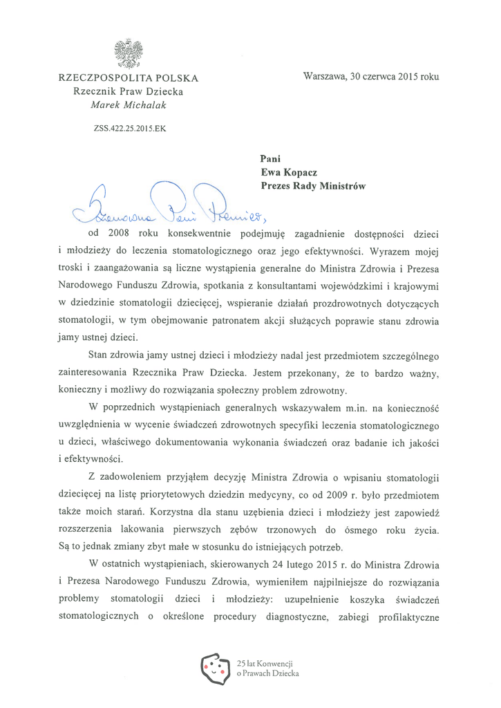 Warszawa, 30 czerwca 2015 roku RZECZPOSPOLITA POLSKA Rzecznik Praw Dziecka Marek Michalak ZSS.422.25.201 5.EK Pani Ewa Kopacz Prezes Rady Ministrów L od 2008 N roku konsekwentnie podejmuję zagadnienie dostępności dzieci i młodzieży do leczenia stomatologicznego oraz jego efektywności. Wyrazem mojej troski i zaangażowania są liczne wystąpienia generalne do Ministra Zdrowia i Prezesa Narodowego Funduszu Zdrowia, spotkania z konsultantami wojewódzkimi i krajowymi xy dziedzinie stomatologii dziecięcej, wspieranie działań prozdrowotnych dotyczących stomatologii, w tym obejmowanie patronatem akcji służących poprawie stanu zdrowia jamy ustnej dzieci. Stan zdrowia jamy ustnej dzieci i młodzieży nadal jest przedmiotem szczególnego zainteresowania Rzecznika Praw Dziecka. Jestem przekonany, że to bardzo ważny, konieczny i możliwy do rozwiązania społeczny problem zdrowotny. W poprzednich wystąpieniach generalnych wskazywałem m.in. na konieczność uwzględnienia w wycenie świadczeń zdrowotnych specyfiki leczenia stomatologicznego u dzieci, właściwego dokumentowania wykonania świadczeń oraz badanie ich jakości i efektywności. Z zadowoleniem przyjąłem decyzję Ministra Zdrowia o wpisaniu stomatologii dziecięcej na listę priorytetowych dziedzin medycyny, co od 2009 r. było przedmiotem także moich starań. Korzystna dla stanu uzębienia dzieci i młodzieży jest zapowiedź rozszerzenia lakowania pierwszych zębów trzonowych do ósmego roku życia. Są to jednak zmiany zbyt małe w stosunku do istniejących potrzeb. W ostatnich wystąpieniach, skierowanych 24 lutego 2015 r. do Ministra Zdrowia i Prezesa Narodowego Funduszu Zdrowia, wymieniłem najpilniejsze do rozwiązania problemy stomatologii stomatologicznych o dzieci określone młodzieży: i procedury • uzupełnienie diagnostyczne, 25 lat Konwencji o Prawach Dziecka koszyka zabiegi świadczeń profilaktyczne i lecznicze, wydzielenie puli środków finansowych na leczenie dzieci i młodzieży bez możliwości przenoszenia ich na leczenie dorosłych oraz zbadanie, na jakie świadczenia stomatologiczne u dzieci pieniądze te są wydatkowane. Analizując treści odpowiedzi na moje wystąpienia oraz odnosząc się do uwag zgłaszanych w sprawie stomatologii przez rodziców, dyrektorów szkół, samorządowców, mogę stwierdzić, że nie są one spójne. Oznacza to, że postulaty zgłaszane w sprawie poprawy stanu uzębienia jamy ustnej dzieci i młodzieży przez rodziców małoletnich pacjentów nie zawsze są zgodne z działaniami podejmowanymi przez instytucje odpowiedzialne za ochronę zdrowia. 95 proc. 18-łatków ma próchnicę zębów. Wyniki Ogólnopolskiego Monitoringu Zdrowia Jamy Ustnej (lata 2008 — 2012) wskazują, że u 85,6 proc. dzieci 6 - letnich stwierdzono próchnicę i wskaźnik ten nie zmienił się na przestrzeni czterech lat. U dzieci 12 letnich próchnicę w 2012 r. stwierdzono u 79,6 proc. dzieci, w 2010 roku wskaźnik — ten wynosił 82,7 proc. Zasadne jest zatem używanie terminu „epidemia próchnicy u dzieci”. Posługując się stosowanymi w stomatologii wskaźnikami oceny stanu zdrowia jamy ustnej (np. procent dzieci w danym przedziale wiekowym wolnych od próchnicy; wielkość populacji dzieci, które mają mniej niż trzy zęby zajęte próchnicą, wskaźnik PUW wśród grupy dwunastolatków) uprawnione jest postawienie tezy, że stan zdrowia jamy ustnej dzieci i młodzieży jest dalece niezadowalający. Niepokojącą informacją jest, że w 51 na 314 powiatów (dane na dzień 23 kwietnia 2015 r. przedstawione przez Naczelną Radę Lekarską) nie jest podpisana umowa z NFZ na realizację świadczeń ogólnostomatologicznych dla dzieci i młodzieży do lat 18. Oznacza to, że na terenie tych powiatów brak jest placówek, które z założenia chcą realizować świadczenia stomatologiczne u dzieci. Wyjaśnienia, że każdy gabinet stomatologiczny, który ma podpisaną z NFZ umowę na wykonywanie świadczeń ogólnostomatologicznych może przyjmować dzieci i młodzież, nie rozwiązuje realnej dostępności do leczenia stomatologicznego. Doraźna wizyta u dentysty nie może być traktowana jako realizacja leczenia stomatologicznego dziecka. Można zatem stwierdzić, że dotychczasowe działania podejmowane na rzecz poprawy stanu zdrowia jamy ustnej dzieci i młodzieży były mało skuteczne i nieadekwatne do diagnozy i skali problemu. W związku z tym wyrażam przekonanie, że niezbędne jest dokonanie analizy podejmowanych działań, ich ocena i modyfikacja, zgodnie z rozpoznanymi jej słabymi stronami bądź niepełnym wykonaniem. Przemiany w ochronie zdrowia, w tym komercjalizacja usług stomatologicznych, sprzyjały upowszechnianiu poglądu. że za stan zdrowia dziecka, w tym stan jego uzębienia. odpowiadają jego opiekunowie. Niedostateczna świadomość znaczenia działań profilaktycznych w stomatologii do przyjmowania dzieci — u części rodziców, niechęć stomatologów postrzeganie ich jako „trudnych pacjentów”, ograniczenie wykonywania profilaktyki stomatologicznej w szkołach, to tylko niektóre powody złego stanu zdrowia jamy ustnej dzieci i młodzieży. W konsekwencji tego, nadal znaczna część dzieci trafia do stomatologa dopiero wówczas, gdy dolegtiwości wynikające ze złego stanu uzębienia wymagają interwencji medycznej. Sprawując urząd Rzecznika Praw Dziecka stoję na straży interesów i potrzeb dziecka. Mam jednak świadomość, że rozwiązanie problemów efektywnego leczenia próchnicy wymaga uwzględnienia postulatów rodziców dzieci, lekarzy—dentystów, możliwości finansowych Narodowego Funduszu Zdrowia oraz planów i możliwości budżetowych lokalnych samorządów. Konieczne mechanizmów. jest które wypracowanie uwzględniając skutecznych przemiany w w gospodarce ochronie zdrowia rynkowej zapewnią systematyczną poprawę stanu zdrowia jamy ustnej dzieci i młodzieży. Kluczowe wydaje się wypracowanie metod motywujących s