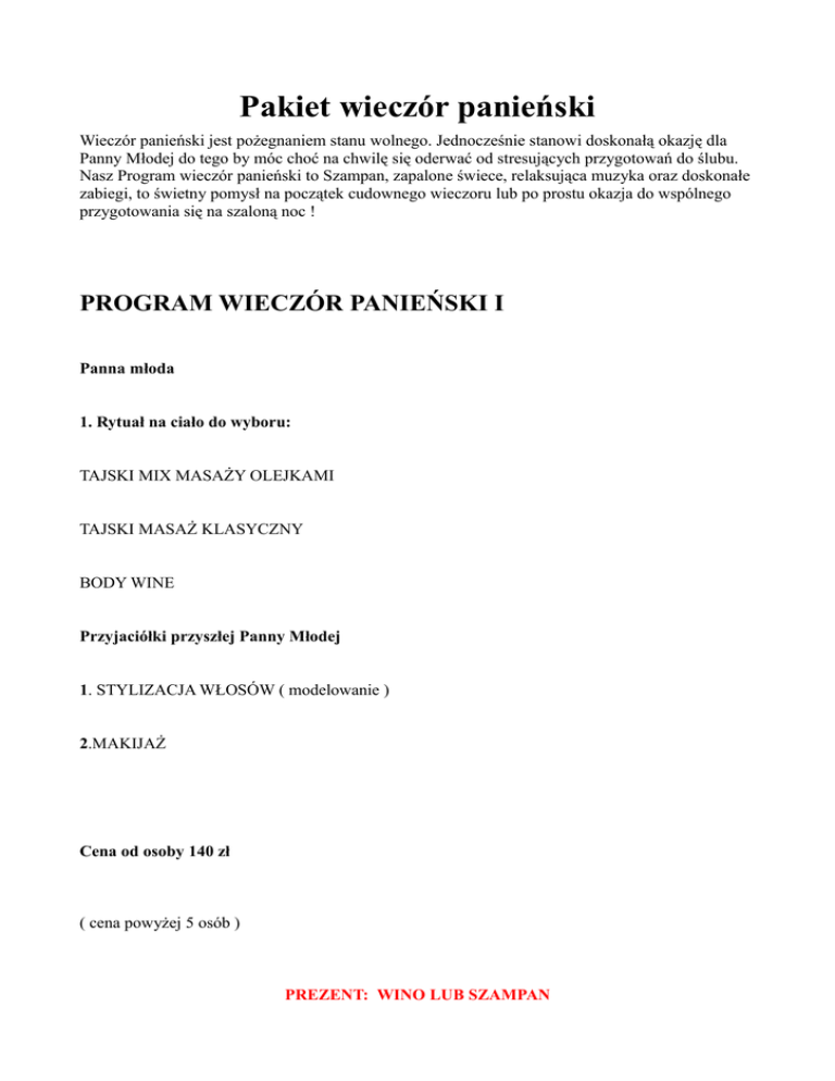 Pakiet wieczór panieński Wieczór panieński jest pożegnaniem stanu wolnego. Jednocześnie stanowi doskonałą okazję dla Panny Młodej do tego by móc choć na chwilę się oderwać od stresujących przygotowań do ślubu. Nasz Program wieczór panieński to Szampan, zapalone świece, relaksująca muzyka oraz doskonałe zabiegi, to świetny pomysł na początek cudownego wieczoru lub po prostu okazja do wspólnego przygotowania się na szaloną noc ! PROGRAM WIECZÓR PANIEŃSKI I Panna młoda 1. Rytuał na ciało do wyboru: TAJSKI MIX MASAŻY OLEJKAMI TAJSKI MASAŻ KLASYCZNY BODY WINE Przyjaciółki przyszłej Panny Młodej 1. STYLIZACJA WŁOSÓW ( modelowanie ) 2.MAKIJAŻ Cena od osoby 140 zł ( cena powyżej 5 osób ) PREZENT: WINO LUB SZAMPAN PROGRAM WIECZÓR PANIEŃSKI II 1. KONSULTACJA ZA KOSMETOLOGIEM I WIZAŻYSTĄ (Porada, dobór odpowiednich zabiegów i kosmetyków ) 2. Rytuał na twarz lub ciało do wyboru: Twarz: EXPRESS NAWILŻAJĄCY PEELING KAWITACYJNY UCZTA KRÓLEWSKA PEELING KAWITACYJNY KWITNĄCA LIPA Ciało: AROMATIC BODY TOUCH BODY WINE TAJSKI MIX MASAŻY OLEJKAMI Cena od osoby 140,- ( cena powyżej 5 osób ) PREZENT: WINO LUB SZAMPAN PROGRAM WIECZÓR PANIEŃSKI III 1. KONSULTACJA ZA KOSMETOLOGIEM I WIZAŻYSTĄ (Porada ,dobór odpowiednich zabiegów i kosmetyków ) 2. Rytuał na twarz lub ciało do wyboru: Twarz: EXPRESS NAWILŻAJĄCY PEELING KAWITACYJNY UCZTA KRÓLEWSKA PEELING KAWITACYJNY KWITNĄCA LIPA Ciało: AROMATIC BODY TOUCH BODY WINE TAJSKI MIX MASAŻY OLEJKAMI 3. Zabieg do wyboru: STYLIZACJA WŁOSÓW ( modelowanie ) MAKIJAŻ MANICURE Cena od osoby 200,( powyżej 6 osób salon zarezerwowany na wyłączność ) PREZENT:POCZĘSTUNEK Z WINEM LUB SZAMPANEM PROGRAM WIECZÓR PANIEŃSKI IV 1.KONSULTACJA ZA KOSMETOLOGIEM I WIZAŻYSTĄ (Porada,dobór odpowiednich zabiegów i kosmetyków) 2. Rytuał na twarz lub ciało do wyboru: Twarz: EXPRESS NAWILŻAJĄCY PEELING KAWITACYJNY UCZTA KRÓLEWSKA PEELING KAWITACYJNY KWITNĄCA LIPA Ciało: AROMATIC BODY TOUCH BODY WINE TAJSKI MIX MASAŻY OLEJKAMI 3. STYLIZACJA WŁOSÓW ( modelowanie ) 4.MAKIJAŻ WIECZOROWY Cena od osoby 240 zł. ( powyżej 6 osób salon zarezerwowany na wyłączność ) PREZENT:POCZĘSTUNEK Z WINEM LUB SZAMPANEM