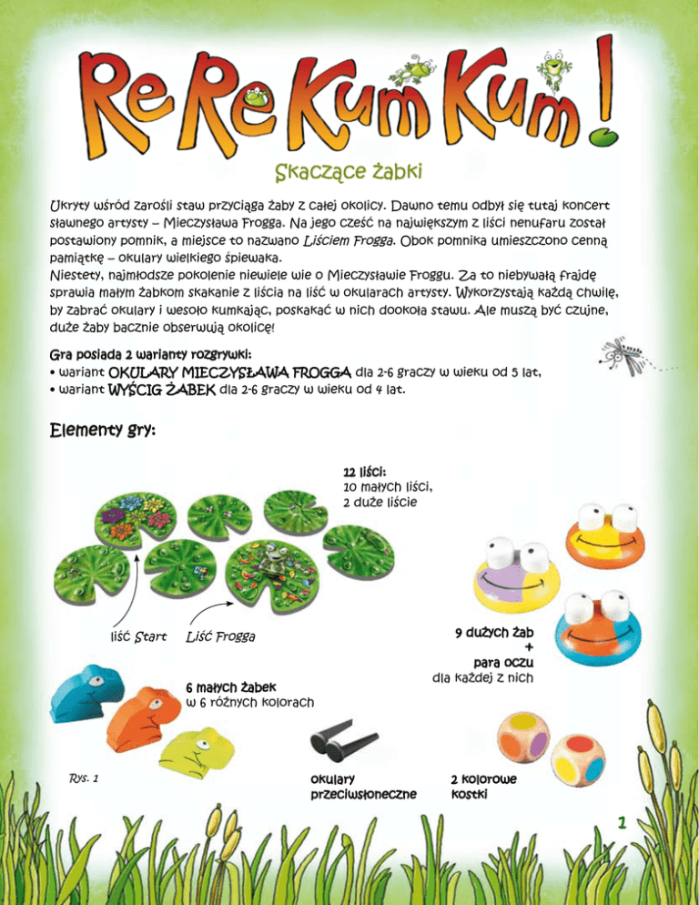 Skaczące żabki Ukryty wśród zarośli staw przyciąga żaby z całej okolicy. Dawno temu odbył się tutaj koncert sławnego artysty – Mieczysława Frogga. Na jego cześć na największym z liści nenufaru został postawiony pomnik, a miejsce to nazwano Liściem Frogga. Obok pomnika umieszczono cenną pamiątkę – okulary wielkiego śpiewaka. Niestety, najmłodsze pokolenie niewiele wie o Mieczysławie Froggu. Za to niebywałą frajdę sprawia małym żabkom skakanie z liścia na liść w okularach artysty. Wykorzystają każdą chwilę, by zabrać okulary i wesoło kumkając, poskakać w nich dookoła stawu. Ale muszą być czujne, duże żaby bacznie obserwują okolicę! Gra posiada 2 warianty rozgrywki: • wariant Okulary Mieczysława Frogga dla 2-6 graczy w wieku od 5 lat, • wariant Wyścig żabek dla 2-6 graczy w wieku od 4 lat. Elementy gry: 12 liści: 10 małych liści, 2 duże liście liść Start 9 dużych żab Liść Frogga + 6 małych żabek w 6 różnych kolorach Rys. 1 okulary przeciwsłoneczne para oczu dla każdej z nich 2 kolorowe kostki 1 OKULARY MIECZYSŁAWA FROGGA (dla graczy w wieku od 5 lat) Cel gry Żabki starają się jak najszybciej dotrzeć do okularów leżących na Liściu Frogga, a następnie rywalizują o to, która z nich jako pierwsza powróci na ten liść w okularach. Żabka, której to się uda, wygrywa grę. Przygotowanie gry 3 małe liście i 2 kolorowe kostki odłóżcie do pudełka – te elementy nie biorą udziału w grze. Przyjrzyjcie się oczom dużych żab. Dziewięcioro oczu ma na spodzie dwukolorowe rysunki odpowiadające kolorom dużych żab, a pozostałe oczy są pod spodem białe. Każda duża żaba musi mieć jedno oko białe od spodu, a drugie z symbolem żaby. Oczy z symbolem żab przydzielamy według prostej zasady: oko jest przydzielane dowolnej żabie z wyjątkiem jednej – tej, której symbol znajduje się na spodzie danego oka. Na przykład duża czerwono-zielona żaba nie może mieć oka z czerwono-zielonym symbolem. Następnie układamy 9 dużych żab oraz liście naprzemiennie, tworząc koło (rys. 2). Rys. 2 Liść Frogga Tu kładziemy okulary. Duże żaby i małe liście układamy naprzemiennie pomiędzy liściem Start a Liściem Frogga. kierunek skakania małych żabek Rozgrywka Każdy gracz wybiera sobie małą żabkę i umieszcza ją na liściu Start. Żabki, które nie biorą udziału w wyścigu, zostają odłożone do pudełka. liść Start Grę rozpoczyna osoba, która potrafi najdalej skoczyć (lub najmłodszy z graczy). Gracz sprawdza jedno wybrane oko dużej żaby, która siedzi na liściu tuż przed jego małą żabką, ogląda je od spodu, a następnie pokazuje innym graczom i odkłada na miejsce. Jeśli oko jest białe pod spodem – co oznacza, że duża żaba ma słaby wzrok – jego żabka skacze na następny liść (rys. 3). Gracz sprawdza oko następnej żaby, pokazuje innym graczom i również odkłada na miejsce. Dopóki trafia na białe pod spodem oczy, jego żabka może skakać do przodu. Gdy jednak gracz wyciągnie oko z kolorowym symbolem pod spodem, oznacza to, że duża żaba ma dobry wzrok i nie pozwala skakać dalej! W takiej sytuacji duża żaba zostaje zamieniona miejscami z tą, na którą wskazuje symbol pod spodem sprawdzonego oka (rys. 4). Po wyciągnięciu oka z kolorowym symbolem kończy się kolejka gracza i do gry włącza się następna osoba, która siedzi po jego lewej stronie. 2 Rys. 3 Gracz trafił na białe pod spodem oko. Jego mała żabka może przeskoczyć na następny liść. Duże żaby czasem przymykają oko na twoje wybryki… Rys. 4 Gracz trafił na oko z kolorowym symbolem. Jego mała żabka nie może przeskoczyć na następny liść. Kolejka gracza się kończy. Dwie duże żaby zostają zamienione miejscami. Niektóre jednak mają wyjątkowo dobry wzrok! Pierwsza mała żabka, która dotrze na Liść Frogga, zakłada okulary przeciwsłoneczne i skacze dalej. Jeśli inna żabka przegoni tę, która ma okulary, zabiera je. Uwaga! Aby ZABRAĆ okulary, nie wystarczy znaleźć się na tym samym liściu, co żabka w okularach. Trzeba ją PRZESKOCZYĆ! Rys. 5 Niebieska mała żabka przegoniła żółtą i teraz ona zakłada okulary. Jeśli żabka w okularach przeciwsłonecznych wskoczy na liść, na którym siedzą już inne żabki, spycha je na kolejny liść. Zepchnięte żabki nie mogą odebrać jej okularów, ponieważ nie wyprzedziły żabki w okularach, zostały jedynie zepchnięte przez nią z liścia. Tylko żabka w okularach może zepchnąć inne żabki na kolejny liść. Koniec gry Rys. 6 Niebieska żabka wskoczyła na liść, na którym znajdują się inne żabki. Spycha je na kolejny liść. Gdy żabka, która ma okulary, wskoczy na Liść Frogga, gra się kończy. 3 WYŚCIG ŻABEK (dla graczy w wieku od 4 lat) Cel gry Żabki zorganizowały wielki wyścig – najszybsza z nich wygra zawody. Przygotowanie gry Bierzemy 12 liści i 2 kolorowe kostki. Okulary nie biorą udziału w grze i zostają odłożone do pudełka. Układamy na stole 10 małych liści w jednej linii. Następnie na początku tej linii kładziemy duży liść Start, a na końcu Liść Frogga. Przydzielamy dużym żabom oczy na tej samej zasadzie, co w pierwszym wariancie gry. Duże żaby losowo umieszczamy po obu stronach linii, którą tworzą liście. Małe żabki ustawiamy na liściu Start. Kolorowe kostki kładziemy w zasięgu ręki. Rys. 7 Jeśli trafisz na białe pod spodem oko, skaczesz dalej! Rozgrywka Gracz rzuca kostkami. Dwa wyrzucone kolory pokazują, której dużej żabie sprawdza jedno wybrane oko (rys. 8). Jeśli oko jest białe pod spodem, jego żabka może skoczyć na kolejny liść, a gracz ponownie rzuca kostkami. Mała żabka skacze z liścia na liść, dopóki gracz nie trafi na oko z symbolem żaby. Jeśli gracz trafi na oko z kolorowym symbolem żaby, traci kolejkę. Jego mała żabka nie może skoczyć na kolejny liść, grę kontynuuje następna osoba, która siedzi po