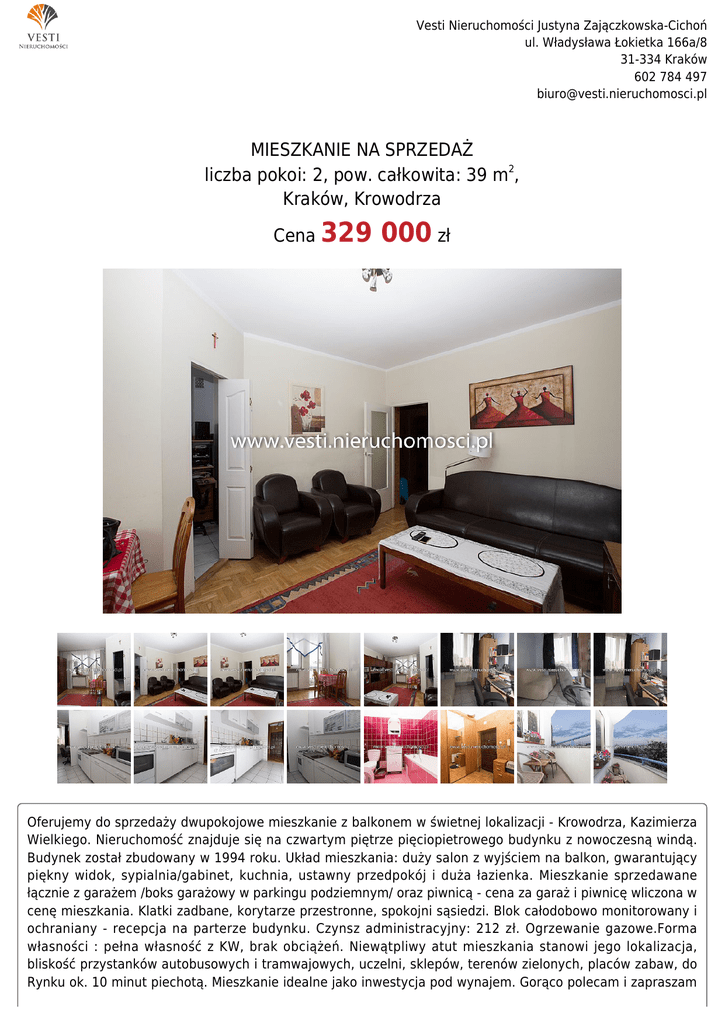 Vesti Nieruchomości Justyna Zajączkowska-Cichoń ul. Władysława Łokietka 166a/8 31-334 Kraków 602 784 497 [email protected] MIESZKANIE NA SPRZEDAŻ liczba pokoi: 2, pow. całkowita: 39 m2, Kraków, Krowodrza Cena 329 000 zł Oferujemy do sprzedaży dwupokojowe mieszkanie z balkonem w świetnej lokalizacji - Krowodrza, Kazimierza Wielkiego. Nieruchomość znajduje się na czwartym piętrze pięciopietrowego budynku z nowoczesną windą. Budynek został zbudowany w 1994 roku. Układ mieszkania: duży salon z wyjściem na balkon, gwarantujący piękny widok, sypialnia/gabinet, kuchnia, ustawny przedpokój i duża łazienka. Mieszkanie sprzedawane łącznie z garażem /boks garażowy w parkingu podziemnym/ oraz piwnicą - cena za garaż i piwnicę wliczona w cenę mieszkania. Klatki zadbane, korytarze przestronne, spokojni sąsiedzi. Blok całodobowo monitorowany i ochraniany - recepcja na parterze budynku. Czynsz administracyjny: 212 zł. Ogrzewanie gazowe.Forma własności : pełna własność z KW, brak obciążeń. Niewątpliwy atut mieszkania stanowi jego lokalizacja, bliskość przystanków autobusowych i tramwajowych, uczelni, sklepów, terenów zielonych, placów zabaw, do Rynku ok. 10 minut piechotą. Mieszkanie idealne jako inwestycja pod wynajem. Gorąco polecam i zapraszam Vesti Nieruchomości Justyna Zajączkowska-Cichoń ul. Władysława Łokietka 166a/8 31-334 Kraków 602 784 497 [email protected] na prezentacje. Symbol 218/VST/MS Typ nieruchomości MIESZKANIE Województwo MAŁOPOLSKIE Gmina Kraków Miejscowość Kraków Dzielnica - osiedle Krowodrza Ulica Kazimierza Wielkiego Rodzaj rynku WTÓRNY Cena 329 000 PLN Pow. całkowita 39,00 m 8 435,90 PLN Cena negocjowana NIE Czynsz i inne opłaty stałe 212,00 PLN Forma własności działki WŁASNOŚĆ Rodzaj mieszkania 2-POKOJOWE Liczba pięter 5 Piętro 4 Liczba pokoi 2 Rodzaj budynku BLOK Standard DOBRY Konstrukcja budynku TRADYCYJNA Technika budowy TRADYCYJNA Typ kuchni ANEKS KUCHENNY Wyposażenie kuchni PEŁNE Umeblowanie PEŁNE Źródło c.w. GAZOWY 2-OBIEGOWY Ogrzewanie C.O. GAZOWE Podpiwniczenie /piwnica PIWNICA Winda w nieruchomości JEST Rodzaj okien PLASTIKOWE Garaż JEST Balkon JEST Widok na południe JEST Forma własności PEŁNA WŁASNOŚĆ Nr Licencji 13491 Cena za m 2 Justyna Zajączkowska-Cichoń Pośrednik w obrocie nieruchomościami 2 602 784 497 [email protected] Więcej ofert na stronie www.vesti.nieruchomosci.pl