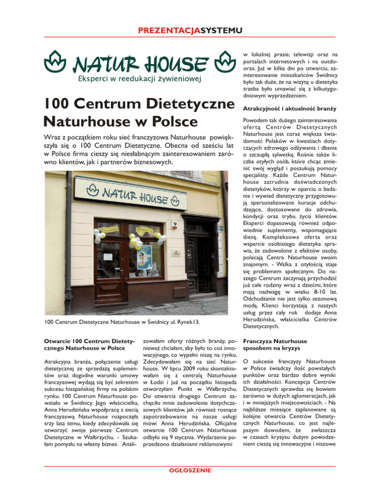 PREZENTACJASYSTEMU 100 Centrum Dietetyczne Naturhouse w Polsce Wraz z początkiem roku sieć franczyzowa Naturhouse powiększyła się o 100 Centrum Dietetyczne. Obecna od sześciu lat w Polsce firma cieszy się niesłabnącym zainteresowaniem zarówno klientów, jak i partnerów biznesowych. 100 Centrum Dietetyczne Naturhouse w Świdnicy ul. Rynek13. Otwarcie 100 Centrum Dietetycznego Naturhouse w Polsce Atrakcyjna branża, połączenie usługi dietetycznej ze sprzedażą suplementów oraz dogodne warunki umowy franczyzowej wydają się być sekretem sukcesu hiszpańskiej firmy na polskim rynku. 100 Centrum Naturhouse powstało w Świdnicy. Jego właścicielka, Anna Herudzińska współpracę z siecią franczyzową Naturhouse rozpoczęła trzy lata temu, kiedy zdecydowała się otworzyć swoje pierwsze Centrum Dietetyczne w Wałbrzychu. - Szukałam pomysłu na własny biznes. Anali- zowałam oferty różnych branży, ponieważ chciałam, aby było to coś innowacyjnego, co wypełni niszę na rynku. Zdecydowałam się na sieć Naturhouse. W lipcu 2009 roku skontaktowałam się z centralą Naturhouse w Łodzi i już na początku listopada otworzyłam Punkt w Wałbrzychu. Do otwarcia drugiego Centrum zachęciło mnie zadowolenie dotychczasowych klientów, jak również rosnące zapotrzebowanie na nasze usługi mówi Anna Herudzińska. Oficjalne otwarcie 100 Centrum Naturhouse odbyło się 9 stycznia. Wydarzenie poprzedzono działaniami reklamowymi OGŁOSZENIE w lokalnej prasie, telewizji oraz na portalach internetowych i na outdoorze. Już w kilka dni po otwarciu, zainteresowanie mieszkańców Świdnicy było tak duże, że na wizytę u dietetyka trzeba było umawiać się z kilkutygodniowym wyprzedzeniem. Atrakcyjność i aktualność branży Powodem tak dużego zainteresowania ofertą Centrów Dietetycznych Naturhouse jest coraz większa świadomość Polaków w kwestiach dotyczących zdrowego odżywania i dbania o szczupłą sylwetkę. Rośnie także liczba otyłych osób, które chcąc zmienić swój wygląd i poszukują pomocy specjalisty. Każde Centrum Naturhouse zatrudnia doświadczonych dietetyków, którzy w oparciu o badania i wywiad dietetyczny przygotowują spersonalizowane kuracje odchudzające, dostosowane do zdrowia, kondycji oraz trybu życia klientów. Eksperci dopasowują również odpowiednie suplementy, wspomagające dietę. Kompleksowa oferta oraz wsparcie osobistego dietetyka sprawia, że zadowolone z efektów osoby, polecają Centra Naturhouse swoim znajomym. - Walka z otyłością staje się problemem społecznym. Do naszego Centrum zaczynają przychodzić już całe rodziny wraz z dziećmi, które mają nadwagę w wieku 8-10 lat. Odchudzanie nie jest tylko sezonową modą. Klienci korzystają z naszych usług przez cały rok dodaje Anna Herudzińska, właścicielka Centrów Dietetycznych. Franczyza Naturhouse sposobem na kryzys O sukcesie franczyzy Naturhouse w Polsce świadczy ilość powstałych punktów oraz bardzo dobre wyniki ich działalności. Koncepcja Centrów Dietetycznych sprawdza się bowiem zarówno w dużych aglomeracjach, jak i w mniejszych miejscowościach. - Na najbliższe miesiące zaplanowane są kolejne otwarcia Centrów Dietetycznych Naturhouse, co jest najlepszym dowodem, że zwłaszcza w czasach kryzysu dużym powodzeniem cieszą się innowacyjne i niszowe PREZENTACJASYSTEMU pomysły na biznes. Dodatkowym atutem współpracy w ramach franczyzy jest wsparcie oraz pomoc doświadczonej firmy zapewnia Rafał Kamieniak, kierownik regionalny firmy Naturhouse. Dogodne warunki umowy franczyzowej W ramach współpracy franczyzowej firma Naturhouse oferuje pomoc w znalezieniu lokalu, zbadanie atrakcyjności jego położenia pod względem handlowym, wyłączność geograficzną w obrębie wyznaczonej strefy, nieodpłatne przeszkolenie pracowników, a także doradztwo w zakresie marketingu oraz w sprawach administracyjno-handlowych. Kwota inwestycji związana z otwarciem punktu wynosi zazwyczaj od 65 do 95 tys. zł. Duże znaczenie ma stan początkowy lokalu - wysokość środków przeznaczonych na remont może wahać się od 5 do 50 tys. zł. Jedyną należnością, nakładaną na franczyzobiorców, jest roczna opłata licencyjna w wysokości 2,4 tys. zł netto. Nie mniej istotne są dostęp do spradzonych rozwiązań biznesowych i cennego know-how marki, a także wypracowane standardy obsługi klienta i prowadzenia kuracji. Szczegóły współpracy franczyzowej z siecią Naturhouse dostępne są na stronie: www.naturhouse-polska.pl lub pod nr infolnii 801 11 12 13. Anna Herudzińska - właścicielka Centrum Naturhouse w Świdnicy. Zadowoleni współpracownicy Dotychczasowi franczyzobiorcy przyznają, że największe zalety współpracy z siecią Naturhouse to przede wszystkim możliwość prowadzenia działalności pod globalną marką, zapewniona wyłączność na sprzedaż suplementów dietetycznych w określonym regionie. Barbara Olszewska - dietetyczka Naturhouse w Świdnicy. RUMIA SŁUPSK WEJHEROWO GDYNIA GDAŃSK ELBLĄG KOŁOBRZEG TCZEW KOSZALIN OLSZTYN OSTRÓDA SZCZECIN PIŁA TORUŃ STARGARD SZCZECIŃSKI BYDGOSZCZ WARSZAWA POZNAŃ INOWROCŁAW GORZÓW WIELKOPOLSKI WŁOCŁAWEK PŁOCK MIŃSK MAZOWIECKI GNIEZNO ŻYRADÓW KONIN ZIELONA GÓRA PRUSZKÓW SIEDLCE ZGIERZ LESZNO LUBIN ŁÓDŹ TOMASZÓW MAZOWIECKI KALISZ PABIANICE GŁOGÓW ŻARY PIOTRKÓW TRYBUNALSKI BEŁCHATÓW WROCŁAW LEGNICA ŚWIDNICA JELENIA GÓRA WAŁBRZYCH RACIBÓRZ Centrum Dietetyczne Naturhouse Rafał Kamieniak - kierownik regionalny Naturhouse na teren Polski zachodniej. OGŁOSZENIE RADOM LUBLIN RADOMSKO CZĘSTOCHOWA CHORZÓW TARNOWSKIE NYSA GÓRY KATOWICE OPOLE DĄBROWA BYTOM GÓRNICZA GLIWICE ZABRZE SOSNOWIEC TYCHY OŚWIĘCIM ŻORY RYBNIK JASTRZĘBIEZDRÓJ KIELCE OSTROWIEC ŚWIĘTOKRZYSKI RZESZÓW KRAKÓW BIELSKO-BIAŁA PRZEMYŚL TARNÓW CIESZYN WADOWICE ŻYWIEC