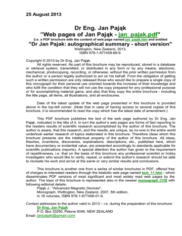 25 August 2013 Dr Eng. Jan Pająk ”Web pages of Jan Pająk - jan_pajak.pdf” (i.e. a PDF brochure with the content of web page named jan_pajak.htm and entitled "Dr Jan Pajak: autographical summary - short version" Wellington, New Zealand, 2013, ISBN 978-1-877458-69-9. Copyright © 2013 by Dr Eng. Jan Pająk. All rights reserved. No part of this brochure may be reproduced, stored in a database or retrieval system, transmitted, or distributed in any form or by any means, electronic, mechanical, photocopying, recording, or otherwise, without the prior written permission from the author or a person legally authorized to act on his behalf. From the obligation of getting such a written permission are only released those who would like to prepare a single copy of this monograph for their personal use oriented towards the increase of their knowledge and who fulfil the condition that they will not use the copy prepared for any professional purpose or for accomplishing material gains, and also that they copy the entire brochure - including the title page, all items, all illustrations, and all enclosures. Date of the latest update of the web page presented in this brochure is provided above in the top-left corner. (Note that in case of having access to several copies of this brochure, it is recommended to read the copy which has the latest date of amendment.) This PDF brochure publishes the text of the web page authored by Dr Eng. Jan Pająk, indicated in the title of it. In turn the author’s web pages are forms of fast reporting to the readers results of scientific research accomplished by the author of this brochure. The author is aware, that this research, and the results, are unique, as no-one in the entire world undertook earlier research of topics elaborated in this brochure. Therefore ideas which this brochure presents are the intellectual property of the author of this brochure. All ideas, theories, inventions, discoveries, explanations, descriptions, etc., published here, which have documentary or evidential value, are presented accordingly to standards applicable for scientific publications (reports). A special attention the author has given to the requirement of repetitiveness, i.e. that on the basis of this brochure any professional scientist or hobby investigator who would like to verify, repeat, or extend the author's research should be able to recreate his work and arrive at the same or very similar results and conclusions. This brochure is another one from a series of similar brochures in PDF, offered free of charges to interested readers through the totaliztic web page named text_11.htm - which disseminates PDF versions of most significant and most widely read web pages by the author. The topic of this brochure is represented also in the newest monograph [1/5] with following editorial details: Pająk J.: "Advanced Magnetic Devices", Monograph, Wellington, New Zealand, 2007, 5th edition, in 18 volumes, ISBN 978-1-877458-01-9. Contact addresses to the author valid in 2013 – i.e. during the preparation of this brochure: Dr Eng. Jan Pająk P.O. Box 33250, Petone 5046, NEW ZEALAND Email: [email protected] #1. The course of my life: I was born in 1946 in a miniature village, which for the longest period of time was called Wszewilki (this particular village frequently changed name). My home village is located in the South-West corner of Poland (close to former East Germany and Chechoslovakia). My father was a technician with "golden hands" skills - means he repaired everything that was broken in tens of miles around our house, starting from watches and clocks, through bicycles and motor vehicles, and finishing on huge industrial gas engines that propelled water pumps in a local waterworks plant (he actually was employed by the town council of Milicz to operate and maintain this waterworks plant). Now I wonder how he could put up with me, as whatever he repaired one evening, I was dismantling the next day when he was at work, to see how it operates, and - of course, not always I managed to put it back so that it worked again. (Especially difficult to put back into a working order turned out to be small watches. So after I experienced several times how my father reacts to the view of a dismantled watch which he repaired just a night before, I started to curb my curiosity about finding out what makes these watches click.) My mother was a housewife - a humble mathematical genius. She was able to count in memory almost as fast as present computers do. Her counting skills always kept shocking shop assistants, providing a lot of fun for me and my sister, who used to accompany mother in shopping expeditions. My education followed a typical pattern for communistic Poland. Firstly (in 1953) I started a primary school in the nearby township Milicz (then having around 20 000 inhabitants). I completed this primary education in 1960. Then I attended a high school (1960 to 1964), which was the Gymnasium of General Education in Milicz. I matriculated in 1964. The Certificate of Matriculation entitled me to undertake the University Studies. I choose to study at the Technical University of Wroclaw, in Poland, which then was one of the most renown universities in Poland. (On the basis of my knowledge of other universities, I personally believe that at that time it was the best university in Poland, and also one of the best in the world.) There was around 12 candidates per one sit at that university, so me passing the entrance exams was a huge accomplishment. I studied there from 1964 to 1970. After the graduation from this university, in 1970 I was employed by the same university, initially as a junior lecturer, then as a lecturer, then as a senior lecturer, and finally in 1974 as a Polish equivalent to a Reader from English style Universities. Then a tornado of political changes swept Poland. I become a member of Solidarity, and when Solidarity went down, I went down with it. A "witch hunting" had s