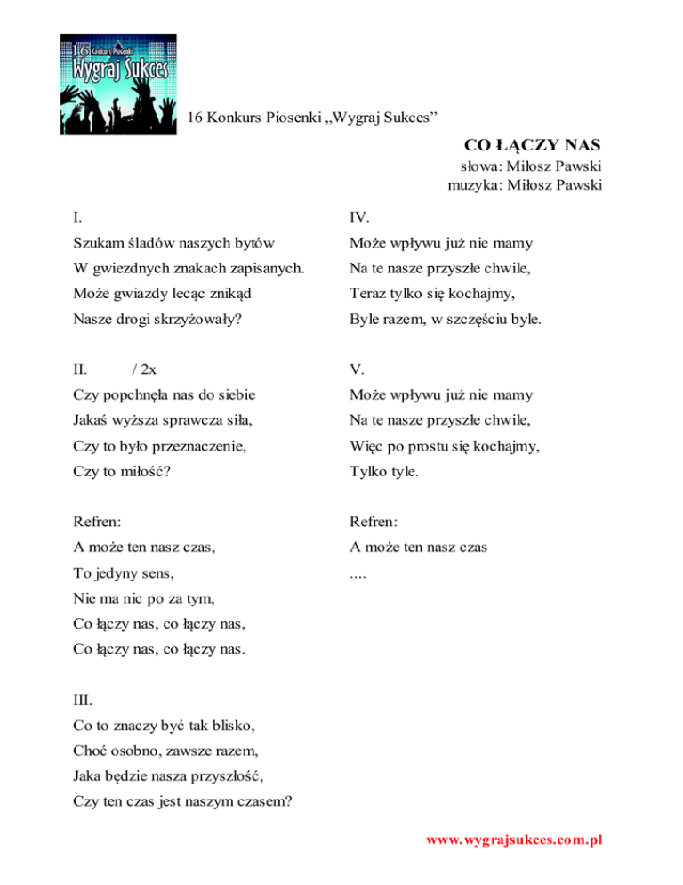 16 Konkurs Piosenki „Wygraj Sukces” CO ŁĄCZY NAS słowa: Miłosz Pawski muzyka: Miłosz Pawski I. IV. Szukam śladów naszych bytów Może wpływu już nie mamy W gwiezdnych znakach zapisanych. Na te nasze przyszłe chwile, Może gwiazdy lecąc znikąd Teraz tylko się kochajmy, Nasze drogi skrzyżowały? Byle razem, w szczęściu byle. II. V. / 2x Czy popchnęła nas do siebie Może wpływu już nie mamy Jakaś wyższa sprawcza siła, Na te nasze przyszłe chwile, Czy to było przeznaczenie, Więc po prostu się kochajmy, Czy to miłość? Tylko tyle. Refren: Refren: A może ten nasz czas, A może ten nasz czas To jedyny sens, .... Nie ma nic po za tym, Co łączy nas, co łączy nas, Co łączy nas, co łączy nas. III. Co to znaczy być tak blisko, Choć osobno, zawsze razem, Jaka będzie nasza przyszłość, Czy ten czas jest naszym czasem? www.wygrajsukces.com.pl