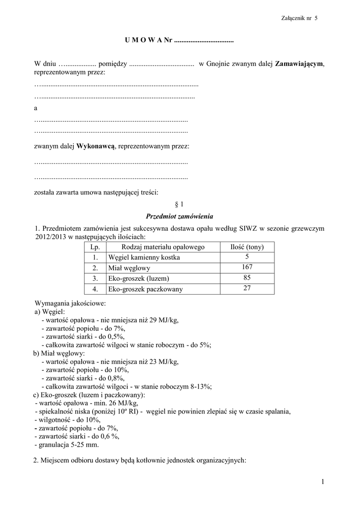Załącznik nr 5 U M O W A Nr ................................. W dniu …................. pomiędzy .................................... w Gnojnie zwanym dalej Zamawiającym, reprezentowanym przez: …....................................................................................... …..................................................................................... a …................................................................................ …................................................................................ zwanym dalej Wykonawcą, reprezentowanym przez: …................................................................................ …................................................................................ została zawarta umowa następującej treści: §1 Przedmiot zamówienia 1. Przedmiotem zamówienia jest sukcesywna dostawa opału według SIWZ w sezonie grzewczym 2012/2013 w następujących ilościach: Lp. Rodzaj materiału opałowego Ilość (tony) 5 1. Węgiel kamienny kostka 167 2. Miał węglowy 85 3. Eko-groszek (luzem) 27 4. Eko-groszek paczkowany Wymagania jakościowe: a) Węgiel: - wartość opałowa - nie mniejsza niż 29 MJ/kg, - zawartość popiołu - do 7%, - zawartość siarki - do 0,5%, - całkowita zawartość wilgoci w stanie roboczym - do 5%; b) Miał węglowy: - wartość opałowa - nie mniejsza niż 23 MJ/kg, - zawartość popiołu - do 10%, - zawartość siarki - do 0,8%, - całkowita zawartość wilgoci - w stanie roboczym 8-13%; c) Eko-groszek (luzem i paczkowany): - wartość opałowa - min. 26 MJ/kg, - spiekalność niska (poniżej 10º RI) - węgiel nie powinien zlepiać się w czasie spalania, - wilgotność - do 10%, - zawartość popiołu - do 7%, - zawartość siarki - do 0,6 %, - granulacja 5-25 mm. 2. Miejscem odbioru dostawy będą kotłownie jednostek organizacyjnych: 1 2.1. Szkoły Podstawowe: a) sukcesywna dostawa węgla kostka gruba gatunek I - przewidywana całkowita ilość węgla kostki grubej objętego postępowaniem wynosi 3 tony tj. Filia w Jarząbkach 1 tona, Filia w Kosterze 2 tony; b) sukcesywna dostawa miału węglowego gatunek I - przewidywana całkowita ilość miału objętego postępowaniem wynosi 147 ton tj.: Filia w Jarząbkach 15 ton, Filia w Kosterze 22 tony, Szkoła Podstawowa w Raczycach 110 ton; c) sukcesywna dostawa eko-groszku - przewidywana całkowita ilość eko-groszku paczkowanego objętego postępowaniem wynosi 25 ton - do Filii w Balicach. 2.2. Urząd Gminy w Gnojnie - przewidywana całkowita ilość eko-groszku objętego postępowaniem wynosi 35 ton. 2.3. Ośrodki Zdrowia: a) sukcesywna dostawa eko-groszku - przewidywana całkowita ilość eko-groszku objętego postępowaniem wynosi 50 ton, tj: Ośrodek Zdrowia w Balicach 20 ton, Ośrodek Zdrowia w Gnojnie 30 ton; b) sukcesywna dostawa węgla kostka gruba gatunek I - przewidywana całkowita ilość węgla kostki grubej objętego postępowaniem wynosi 2 tony - dla Ośrodka Zdrowia w Raczycach; c) sukcesywna dostawa miału węglowego gatunek I - przewidywana całkowita ilość miału objętego postępowaniem wynosi 20 ton - dla Ośrodka Zdrowia w Raczycach. 2.4. OSP w Balicach - przewidywana całkowita ilość eko-groszku paczkowanego objętego postępowaniem wynosi 2 tony. 3. Przewidywana ilość ww. opału może ulec zmniejszeniu w zależności od panujących warunków atmosferycznych. W przypadku zmniejszenia ww. ilości wykonawca nie nabywa prawa do jakichkolwiek roszczeń w stosunku do Zamawiającego. Przedmiot zamówienia obejmuje również załadunek opału, transport i jego rozładunek w miejscu przeznaczenia. §2 Termin realizacji umowy 1. Dostawy winny odbywać się w dni robocze w godzinach od 8.00 do 15.00 partiami, a częstotliwość i wielkość pojedynczych dostaw wynikać będą z każdorazowego zgłoszenia przez jednostkę określoną w §1 (telefonicznie, faxem), bez ograniczeń co do częstotliwości zamówień, w terminie nie dłuższym niż 2 dni od daty złożenia zamówienia lub innym terminie wskazanym przez Zamawiającego. 2. Dostawy będą realizowane od dnia podpisania umowy do dnia 30.04.2012 r. 3. Wykonawca zawiadamia poszczególne jednostki o godzinie planowanej dostawy z minimum 1 – dniowym wyprzedzeniem. § 3 Wynagrodzenie 1. Wykonawca zobowiązuje się do stosowania cen zgodnie ze złożoną ofertą tj.: 1) Sukcesywna dostawa węgla kostka gruba w ilości 5 ton netto – …..........................zł./t plus VAT - ….....................zł./t 2 brutto - …........................... zł.t słownie: …............................................................................................................................................ Maksymalna wartość zamówienia nie przekroczy kwoty ......................... zł brutto. 2) Sukcesywna dostawa miału węglowego w ilości 167 ton netto – …..........................zł./t plus VAT - ….....................zł./t brutto - …........................... zł./t słownie: …............................................................................................................................................ Maksymalna wartość zamówienia nie przekroczy kwoty ......................... zł brutto. 3) Sukcesywna dostawa eko-groszku (luzem) w ilości 85 ton netto – …..........................zł./t plus VAT - ….....................zł./t brutto - …........................... zł./t słownie: …............................................................................................................................................ Maksymalna wartość zamówienia nie przekroczy kwoty ......................... zł brutto. 4) Sukcesywna dostawa eko-groszku paczkowanego w ilości 27 ton netto – …..........................zł./t plus VAT - ….....................zł./t brutto - …........................... zł./t słownie: …...................................................................................