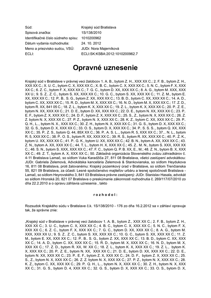 Súd: Spisová značka: Identifikačné číslo súdneho spisu: Dátum vydania rozhodnutia: Meno a priezvisko sudcu, VSÚ: ECLI: Krajský súd Bratislava 1S/138/2010 1010200962 24. 10. 2012 JUDr. Nora Majerníková ECLI:SK:KSBA:2012:1010200962.7 Opravné uznesenie Krajský súd v Bratislave v právnej veci žalobcov 1. A. B., bytom Z. H., XXX XX C.; 2. F. B., bytom Z. H., XXX XX C.; X. U. C., bytom C. X, XXX XX C.; X. B. C., bytom C. X, XXX XX C.; 5. N. C., bytom F. X, XXX XX C.; 6. Z. C., bytom F. X, XXX XX C.; 7. G. C., bytom D. XX, XXX XX C.; 8. A. G., bytom M. XXX, XXX XX U.; 9. S. Z.. Z. C., bytom S. XX, XXX XX C.; 10. G. C., bytom S. XX, XXX XX C.; 11. Z. M., bytom E. XX, XXX XX C.; 12. P.. B.. S. G., bytom Z. XX, XXX XX C.; 13. B. D., bytom C. XX, XXX XX C.; 14. A. D., bytom C. XX, XXX XX C.; 15. R. D., bytom M. X, XXX XX C.; 16. N. D., bytom M. X, XXX XX C.; 17. Z. D., bytom R. XX, 841 05 C.; 18. Z. L., bytom K. X, XXX XX C.; 19. Z. L., bytom K. X, XXX XX C.; 20. P.. Z. E., bytom N. XX, XXX XX C.; 21. D. E., bytom D. XX, XXX XX C.; 22. D. E., bytom N. XX, XXX XX C.; 23. P.. E. F., bytom Z. X, XXX XX C.; 24. D. F., bytom Z. X, XXX XX C.; 25. S., Z., bytom N. X, XXX XX C.; 26. Z. Z. bytom N. X, XXX XX C.; 27. P. Z., bytom N. X, XXX XX C.; 28. K. Z., bytom C. XX, XXX XX C.; 29. P.. Q. H., L.., bytom N. X., XXX XX C.; 30. Z. H., bytom N. X, XXX XX C.; 31. G. S., bytom D. X, XXX XX C.; 32. G. S., bytom D. X, XXX XX C.; 33. O. S., bytom D. X, XXX XX C.; 34. P.. S. S. S.., bytom Q. XX, XXX XX C.; 35. P.. Z. S., bytom Q. 44, 85X XX C.; 36. P.. A. S. L.., bytom R. 5, XXX XX C.; 37... N. L., bytom R. 5, XXX XX C.; 38. P.. O. S., bytom R. XX, XXX XX C.; 39. R. S., bytom R. XX, XXX XX C.; 40. P.. Z. K., bytom U. XX, XXX XX C.; 41. P.. G. K., bytom U. XX, XXX XX C.; 42. B. N., bytom A. XX, XXX XX C.; 43. Z. N., bytom A. XX, XXX XX C.; 44. T. L., bytom H. X, XXX XX C.; 45. Z.. M. N., bytom S. XXX, XXX XX C.; 46. S. N., bytom S. XXX, XXX XX C.; 47. F. C., bytom Q. P. B. XX, E., M.; 48. Z. N., bytom B. X, XXX XX C.; 49. Z. T., bytom A. X, XXX XX C.; 50. Základná organizácia Slovenského zväzu záhradkárov č. 4-11 Bratislava Lamač, so sídlom Vuka Karadžiča 27, 811 08 Bratislava, všetci zastúpení advokátkou: JUDr. Gabriela Zelemová, Advokátska kancelária Zelemová & Stankovianska, so sídlom Heydukova 16, 811 08 Bratislava, proti žalovanému: Krajský pozemkový úrad v Bratislave, so sídlom Trenčianska 55, 821 09 Bratislava, za účasti: Lesné spoločenstvo majiteľov urbáru a lesnej spoločnosti Bratislava Lamač, so sídlom Heyrovského 3, 841 03 Bratislava právne zastúpený: JUDr. Stanislav Hasala, advokát so sídlom Hronská 20, 821 07 Bratislava o preskúmanie zákonnosti rozhodnutia č. 269/117/07/2010 zo dňa 22.2.2010 a o opravu záhlavia uznesenia , takto rozhodol: Rozsudok Krajského súdu v Bratislave č.k. 1S/138/2010 - 176 zo dňa 16.2.2012 sa v záhlaví opravuje tak, že správne znie: „Krajský súd v Bratislave v právnej veci žalobcov 1. A. B., bytom Z., XXX XX C.; 2. F. B., bytom Z. H., XXX XX C.; 3. U. C., bytom C. X, XXX XX C.; 4. B. C., bytom C. X, XXX XX C.; 5. N. C., bytom F. X, XXX XX C.; 6. Z. C., bytom F. X, XXX XX C.; 7. G. C., bytom D. XX, XXX XX C.; 8. A. G., bytom M. XXX, XXX XX U.; 9. S. Z.. Z. C., bytom S. XX, XXX XX C.; 10. G. C., bytom S. XX, XXX XX C.; 11. Z. M., bytom E. XX, XXX XX C.; 12. P.. B.. S. G., bytom Z. XX, XXX XX C.; 13. B. D., bytom C. XX, XXX XX C.; 14. A. D., bytom C. XX, XXX XX C.; 15. R. D., bytom M. X, XXX XX C.; 16. N. D., bytom M. X, XXX XX C.; 17. Z. D., bytom R. XX, W. XX C.; 18. Z. L., bytom K. X, XXX XX C.; 19. Z. L., bytom K. X, XXX XX C.; 20. P.. Z. E., bytom N. XX, XXX XX C.; 21. D. E., bytom D. XX, XXX XX C.; 22. D. E., bytom N. XX, XXX XX C.; 23. P.. E. F., bytom Z. X, XXX XX C.; 24. D. F., bytom Z. X, XXX XX C.; 25. S., Z., bytom N. X, XXX XX C.; 26. Z. Z. bytom N. X, XXX XX C.; 27. P. Z., bytom N. X, XXX XX C.; 28. K. Z., bytom C. XX, XXX XX C.; 29. P.. Q. H., L.., bytom N. X, XXX XX C.; 30. Z. H., bytom N. X, XXX XX C.; 31. G. S., bytom D. 4, XXX XX C.; 32. G. S., bytom D. X, XXX XX C.; 33. O. S., bytom D. X, XXX XX C.; 34. P.. S. S. S.., bytom Q. XX, XXX XX C.; 35. P.. Z. S., bytom Q. 44, 85X XX C.; 36. P.. A. S. L.., bytom R. X, XXX XX C.; 37.P... N. L., bytom R. X, XXX XX C.; 38. P.. O. S., bytom R. XX, XXX XX C.; 39. R. S., bytom R. XX, XXX XX C.; 40. P.. Z. K., bytom U. XX, XXX XX C.; 41. P.. G. K., bytom U. XX, XXX XX C.; 42. B. N., bytom A. XX, XXX XX C.; 43. Z. N., bytom A. XX, XXX XX C.; 44. T. L., bytom H. X, XXX XX C.; 45. Z.. M. N., bytom S. XXX, XXX XX C.; 46. S. N., bytom S. XXX, XXX XX C.; 47. F. C., bytom Q. P. B. XX, E., M.; 48. Z. N., bytom B. X, XXX XX C.; 49. Z. T., bytom A. 5, XXX XX C.; 50. Základná organizácia Slovenského zväzu záhradkárov č. 4-11 Bratislava Lamač, so sídlom Vuka Karadžiča 27, 811 08 Bratislava, všetci zastúpení advokátkou: JUDr. Gabriela Zelemová, Advokátska kancelária Zelemová & Stankovianska, so sídlom Heydukova 16, 811 08 Bratislava, proti žalovanému: Krajský pozemkový úrad v Bratislave, so sídlom Trenčianska 55, 821 09 Bratislava, za účasti: Lesné spoločenstvo majiteľov urbáru a lesnej spoločnosti Bratislava - Lamač, so sídlom Heyrovského 3, 841 03 Bratislava právne zastúpený: JUDr. Stanislav Hasala, advokát so sídlom Hronská 20, 821 07 Bratislava o preskúmanie zákonnosti rozhodnutia č. 269/117/07/2010 zo dňa 22.2.2010, takto...........“ odôvodnenie: Žalobou podanou na Krajský súd v Bratislave dňa 11.5.2010 sa žalobca domáhal preskúmania zákonnosti rozhodnutia žalovaného č. 269/117/07/2010 zo dňa 22.2.2010, ktorým tento druhostupňový správny orgán zamietol odvolanie žalobcu a rozhodnutie Obvodného pozemkového úradu v Bratislave č. 4691/09/823/09-MSO zo dňa 17.9.2009 potvrdil. Žalobca navrhol zrušiť rozhodnutie druhostupňového ako aj prvostupňového správneho orgánu. V žalobe u