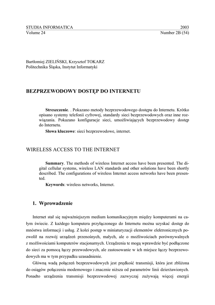 STUDIA INFORMATICA Volume 24 2003 Number 2B (54) Bartłomiej ZIELIŃSKI, Krzysztof TOKARZ Politechnika Śląska, Instytut Informatyki BEZPRZEWODOWY DOSTĘP DO INTERNETU Streszczenie. . Pokazano metody bezprzewodowego dostępu do Internetu. Krótko opisano systemy telefonii cyfrowej, standardy sieci bezprzewodowych oraz inne rozwiązania. Pokazano konfiguracje sieci, umożliwiających bezprzewodowy dostęp do Internetu. Słowa kluczowe: sieci bezprzewodowe, internet. WIRELESS ACCESS TO THE INTERNET Summary. The methods of wireless Internet access have been presented. The digital cellular systems, wireless LAN standards and other solutions have been shortly described. The configurations of wireless Internet access networks have been presented. Keywords: wireless networks, Internet. 1. Wprowadzenie Internet stał się najważniejszym medium komunikacyjnym między komputerami na całym świecie. Z każdego komputera przyłączonego do Internetu można uzyskać dostęp do mnóstwa informacji i usług. Z kolei postęp w miniaturyzacji elementów elektronicznych pozwolił na rozwój urządzeń przenośnych, małych, ale o możliwościach porównywalnych z możliwościami komputerów stacjonarnych. Urządzenia te mogą wprawdzie być podłączone do sieci za pomocą łączy przewodowych, ale zastosowanie w ich miejsce łączy bezprzewodowych ma w tym przypadku uzasadnienie. Główną wadą połączeń bezprzewodowych jest prędkość transmisji, która jest zbliżona do osiągów połączenia modemowego i znacznie niższa od parametrów linii dzierżawionych. Ponadto urządzenia transmisji bezprzewodowej zazwyczaj zużywają więcej energii 58 B. Zieliński, K. Tokarz i wymagają większej mocy obliczeniowej. Mimo tego zalety transmisji bezprzewodowej są niepodważalne. Przenośność, wygoda użytkowania, nieprzerwany dostęp do sieci z domu i pracy oraz w czasie podróży czynią urządzenia przenośne podłączone do Internetu bardzo atrakcyjnymi. 2. Standardy i systemy sieci bezprzewodowych W chwili obecnej znanych jest kilka sposobów uzyskania dostępu do internetu drogą bezprzewodową. Prawdopodobnie najpopularniejszą metodą w Polsce jest dostęp z wykorzystaniem telefonów komórkowych GSM, włączając w to bardziej zaawansowaną i tańszą metodę opartą na protokole GPRS. W tym przypadku zasięg działania sieci jest ogromny – coraz trudniej znaleźć miejsca nie pokryte zasięgiem sieci GSM – ale prędkość transmisji jest stosunkowo niska i dla wielu aplikacji zbyt niska. Potrzebne są zatem inne metody. Być może jedną z nich stanie się standard UMTS, ale jest to ciągle sprawa przyszłości. Dostęp do Internetu można także uzyskać stosując bezprzewodowe sieci lokalne. Obecnie znane są dwa standardy takich sieci: IEEE 802.11 oraz HiPeRLAN. Oba mają po kilka wersji, oferujących różne prędkości transmisji i pracujących w różnych pasmach częstotliwości. Warto nadmienić, iż od sierpnia 2002 roku pasma zarezerwowane dla tych sieci w Europie stały się dostępne do swobodnego (nie wymagającego zezwoleń) użytkowania także w Polsce. Istnieją także łącza bezprzewodowe bardzo małego zasięgu, jak IrDA oraz BlueTooth. Jakkolwiek wydaje się, iż nie mogą one stać się jedynym medium bezprzewodowym przy połączeniu z Internetem, nie należy ich pomijać, gdyż mają one, lub będą miały w przyszłości, wiele ciekawych zastosowań. Jeszcze inną klasę rozwiązań stanowią bezprzewodowe sieci miejskie, zwane także bezprzewodowymi szerokopasmowymi sieciami dostępowymi (BRAN, ang. Broadband Radio Access Network). Ich zadaniem jest jednak zapewnienie łączności w innym miejscu sieci, niewidocznym dla użytkownika. 2.1. Standard GSM GSM (ang. Global System for Mobile communications) [1, 3] jest europejskim standardem cyfrowej telefonii komórkowej, zdefiniowanym przez ETSI (ang. European Telecommunications Standards Institute) Obecnie jest jednym z najpopularniejszych systemów ko- Bezprzewodowy dostęp do internetu 59 mórkowych na świecie. Pozwala nie tylko na transmisję głosu, lecz także danych, można zatem powiedzieć, iż stanowi pewną formę sieci rozległej. GSM może działać w kilku różnych pasmach częstotliwości radiowych. Wersja podstawowa, zwana obecnie GSM 900, zajmuje pasma 890-915 MHz dla transmisji „w górę” (z telefonu do stacji bazowej) i 935-960 MHz „w dół” (ze stacji bazowej do telefonu). W tym pasmie dostępne są 124 kanały częstotliwościowe. Istnieje także wersja GSM 1800 (dawniej DCS 1800), zajmująca pasma odpowiednio 1805-1880 oraz 1710-1785 MHz, co daje 374 kanały częstotliwościowe. Wymienione warianty są obecnie dominujące. Jest jednak także pasmo E-GSM, poszerzone w stosunku do wersji GSM 900 i mogące ją zastąpić, jeżeli dostępne są odpowiednie częstotliwości (880-915 i 925-960 MHz), oferując przy tym 174 kanały. Jeszcze inny wariant, GSM 1900 – można stosować np. w Japonii czy USA, gdzie pozostałe pasma są niedostępne. Prędkość transmisji danych wynosi 9,6 kb/s. Jedyny wyjątek dotyczy przypadku, gdy obie stacje znajdują się w obszarze działania tej samej centrali przełączającej MSC (ang. Mobile Switching Centre) – prędkość rośnie wówczas do 12 kb/s. Modyfikacja kodera umożliwia dalszy wzrost prędkości do 14,4 kb/s. W metodzie HSCSD (ang. High Speed Circuit Switched Data) pojedynczemu połączeniu przypisuje się więcej szczelin czasowych. Pozwala to na zwiększenie prędkości transmisji do 28,8 kb/s bez modyfikacji telefonu oraz 76,8, a nawet 115,2 kb/s, po dokonaniu modyfikacji układu radiowego. 2.2. Standard DECT DECT (ang. Digital Enhanced Cordless Telecommunications) [1, 3] jest europejskim standardem cyfrowej telefonii bezprzewodowej, zdefiniowanym przez ETSI. Może być także wykorzystany w wielu innych zastosowaniach, np. jako rozszerzenie sieci komórkowej GSM lub do zapewnienia bezprzewodowego dostępu do sieci. DECT pracuje w pasmie 1