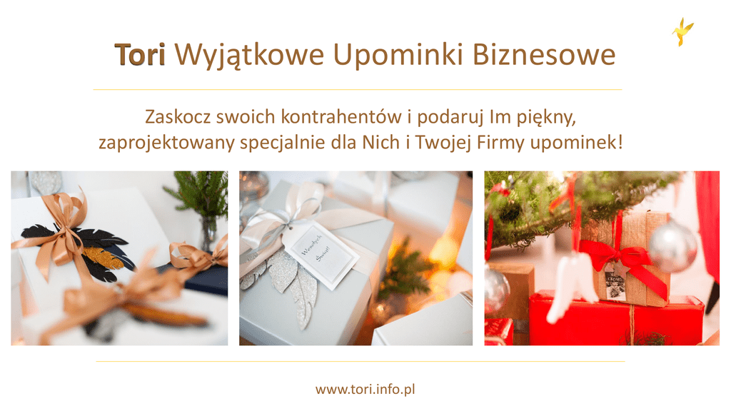 Tori Wyjątkowe Upominki Biznesowe Zaskocz swoich kontrahentów i podaruj Im piękny, zaprojektowany specjalnie dla Nich i Twojej Firmy upominek! www.tori.info.pl Tori to dynamicznie rozwijająca się firma, której podstawą działalności jest tworzenie jedynych w swoim rodzaju prezentów biznesowych. Propolskie, pro regionalne, uczciwe i partnerskie podejście do biznesu oraz ciągłe dążenie do doskonałości to moje główne założenia. Serdecznie zapraszam do współpracy Milena Szymańska [email protected] 539 372 981 2 Kolekcja opakowań „Elegancka” Brokatowe pióra i bombki, złota lub srebrna wstążka. www.tori.info.pl 539 372 981 [email protected] 3 Kolekcja opakowań „Naturalna – czerwona” Pudełka eko z tektury falistej, czerwona kokarda i naturalne dodatki. www.tori.info.pl 539 372 981 [email protected] 4 Kolekcja opakowań „Naturalna – biała” Białe, eleganckie pudełka wykonane z tektury falistej z naturalnymi ozdobami. www.tori.info.pl 539 372 981 [email protected] 5 Przykładowe Propozycje Prezentów Propozycja I Propozycja II Propozycja III Bezy kawowe Consonni Tabliczka czekolady Chocolate Busch Ciasteczka owsiane z czekoladą Consonni Boże Krówki Eleganckie pudełko z tektury eko, personalizowany bilecik, ozdoby Cena 57zł netto Tabliczka czekolady Chocolate Busch Boże Krówki Beziki Consonni Eleganckie pudełko z tektury eko, personalizowany bilecik, ozdoby Cena 49zł netto Ręcznie robione Parliny Gold Cup Premium Marcin Paździor (15szt.) Syrop wiśniowy Cherry Tree Ciastka lub pierniki z Owsianej Manufaktury w pięknie dekorowanym słoju Tabliczka czekolady Chocolate Busch Kandyzowana skórka pomarańczowa w czekoladzie Consonni Eleganckie pudełko z tektury eko, personalizowany bilecik, ozdobna kokarda Cena 120zł netto I każdy inny upominek zaprojektowany specjalnie dla Twojej firmy. www.tori.info.pl 539 372 981 [email protected] 6 Przykładowe Propozycje Prezentów www.tori.info.pl 539 372 981 [email protected] 7 Przykładowe Propozycje Prezentów www.tori.info.pl 539 372 981 [email protected] 8 Kartki Świąteczne z Logo Twojej Firmy www.tori.info.pl 539 372 981 [email protected] 9 Personalizowane zawieszki - bileciki z Logo Twojej Firmy Zapraszam do kontaktu. Chętnie odwiedzę Państwa w firmie, aby zaprezentować upominki firmy Tori. www.tori.info.pl 539 372 981 [email protected] 10