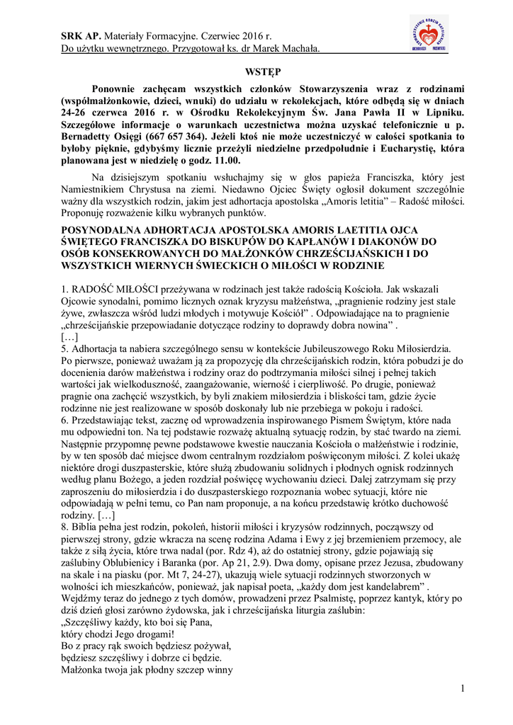 SRK AP. Materiały Formacyjne. Czerwiec 2016 r. Do użytku wewnętrznego. Przygotował ks. dr Marek Machała. WSTĘP Ponownie zachęcam wszystkich członków Stowarzyszenia wraz z rodzinami (współmałżonkowie, dzieci, wnuki) do udziału w rekolekcjach, które odbędą się w dniach 24-26 czerwca 2016 r. w Ośrodku Rekolekcyjnym Św. Jana Pawła II w Lipniku. Szczegółowe informacje o warunkach uczestnictwa można uzyskać telefonicznie u p. Bernadetty Osięgi (667 657 364). Jeżeli ktoś nie może uczestniczyć w całości spotkania to byłoby pięknie, gdybyśmy licznie przeżyli niedzielne przedpołudnie i Eucharystię, która planowana jest w niedzielę o godz. 11.00. Na dzisiejszym spotkaniu wsłuchajmy się w głos papieża Franciszka, który jest Namiestnikiem Chrystusa na ziemi. Niedawno Ojciec Święty ogłosił dokument szczególnie ważny dla wszystkich rodzin, jakim jest adhortacja apostolska „Amoris letitia” – Radość miłości. Proponuję rozważenie kilku wybranych punktów. POSYNODALNA ADHORTACJA APOSTOLSKA AMORIS LAETITIA OJCA ŚWIĘTEGO FRANCISZKA DO BISKUPÓW DO KAPŁANÓW I DIAKONÓW DO OSÓB KONSEKROWANYCH DO MAŁŻONKÓW CHRZEŚCIJAŃSKICH I DO WSZYSTKICH WIERNYCH ŚWIECKICH O MIŁOŚCI W RODZINIE 1. RADOŚĆ MIŁOŚCI przeżywana w rodzinach jest także radością Kościoła. Jak wskazali Ojcowie synodalni, pomimo licznych oznak kryzysu małżeństwa, „pragnienie rodziny jest stale żywe, zwłaszcza wśród ludzi młodych i motywuje Kościół” . Odpowiadające na to pragnienie „chrześcijańskie przepowiadanie dotyczące rodziny to doprawdy dobra nowina” . […] 5. Adhortacja ta nabiera szczególnego sensu w kontekście Jubileuszowego Roku Miłosierdzia. Po pierwsze, ponieważ uważam ją za propozycję dla chrześcijańskich rodzin, która pobudzi je do docenienia darów małżeństwa i rodziny oraz do podtrzymania miłości silnej i pełnej takich wartości jak wielkoduszność, zaangażowanie, wierność i cierpliwość. Po drugie, ponieważ pragnie ona zachęcić wszystkich, by byli znakiem miłosierdzia i bliskości tam, gdzie życie rodzinne nie jest realizowane w sposób doskonały lub nie przebiega w pokoju i radości. 6. Przedstawiając tekst, zacznę od wprowadzenia inspirowanego Pismem Świętym, które nada mu odpowiedni ton. Na tej podstawie rozważę aktualną sytuację rodzin, by stać twardo na ziemi. Następnie przypomnę pewne podstawowe kwestie nauczania Kościoła o małżeństwie i rodzinie, by w ten sposób dać miejsce dwom centralnym rozdziałom poświęconym miłości. Z kolei ukażę niektóre drogi duszpasterskie, które służą zbudowaniu solidnych i płodnych ognisk rodzinnych według planu Bożego, a jeden rozdział poświęcę wychowaniu dzieci. Dalej zatrzymam się przy zaproszeniu do miłosierdzia i do duszpasterskiego rozpoznania wobec sytuacji, które nie odpowiadają w pełni temu, co Pan nam proponuje, a na końcu przedstawię krótko duchowość rodziny. […] 8. Biblia pełna jest rodzin, pokoleń, historii miłości i kryzysów rodzinnych, począwszy od pierwszej strony, gdzie wkracza na scenę rodzina Adama i Ewy z jej brzemieniem przemocy, ale także z siłą życia, które trwa nadal (por. Rdz 4), aż do ostatniej strony, gdzie pojawiają się zaślubiny Oblubienicy i Baranka (por. Ap 21, 2.9). Dwa domy, opisane przez Jezusa, zbudowany na skale i na piasku (por. Mt 7, 24-27), ukazują wiele sytuacji rodzinnych stworzonych w wolności ich mieszkańców, ponieważ, jak napisał poeta, „każdy dom jest kandelabrem” . Wejdźmy teraz do jednego z tych domów, prowadzeni przez Psalmistę, poprzez kantyk, który po dziś dzień głosi zarówno żydowska, jak i chrześcijańska liturgia zaślubin: „Szczęśliwy każdy, kto boi się Pana, który chodzi Jego drogami! Bo z pracy rąk swoich będziesz pożywał, będziesz szczęśliwy i dobrze ci będzie. Małżonka twoja jak płodny szczep winny 1 SRK AP. Materiały Formacyjne. Czerwiec 2016 r. Do użytku wewnętrznego. Przygotował ks. dr Marek Machała. we wnętrzu twojego domu. Synowie twoi jak sadzonki oliwki dokoła twojego stołu. Oto takie błogosławieństwo dla męża, który boi się Pana. Niechaj cię Pan błogosławi z Syjonu, oglądaj pomyślność Jeruzalem przez całe swe życie. Oglądaj dzieci twoich synów. Pokój nad Izraelem! (Ps 128, 1-6). 9. Przekraczamy zatem próg tego pogodnego domu, gdzie rodzina siedzi wokół świątecznego stołu. W centrum spotykamy ojca i matkę z całą ich historią miłosną. W nich wypełnia się ów pierwotny plan, który sam Chrystus przywołuje z mocą: „Czy nie czytaliście, że Stwórca od początku stworzył ich jako mężczyznę i kobietę?” (Mt 19, 4). Przypomina Księga Rodzaju: „Dlatego to mężczyzna opuszcza ojca swego i matkę swoją i łączy się ze swą żoną tak ściśle, że stają się jednym ciałem” (2, 24). 10. Wspaniałe dwa pierwsze rozdziały Księgi Rodzaju przedstawiają nam parę ludzką w jej fundamentalnej rzeczywistości. W tekście na początku Biblii jaśnieją pewne decydujące stwierdzenia. Pierwsze, cytowane syntetycznie przez Jezusa mówi: „Stworzył więc Bóg człowieka na swój obraz, na obraz Boży go stworzył: stworzył mężczyznę i niewiastę” (Rdz 1, 27). Nieoczekiwanie paralelą wyjaśniającą „obraz Boga” jest właśnie para „mężczyzny i kobiety”. Czy to oznacza, że sam Bóg jest obdarzony cechami płciowymi, czy też, że towarzyszy Mu boska towarzyszka, jak wierzyły pewne religie starożytne? Oczywiście, że nie, bo wiemy, jak wyraźnie Biblia odrzuciła jako bałwochwalcze te przekonania rozpowszechnione wśród Kananejczyków Ziemi Świętej. Zachowywana jest transcendencja Boga, ale ponieważ jest On zarazem Stwórcą, to płodność ludzkiej pary jest żywym i skutecznym „obrazem”, widzialnym znakiem aktu stwórczego. 11. Para, która kocha i rodzi życie, jest prawdziwą żywą „figurą” (ale nie żadną z tych wykona
