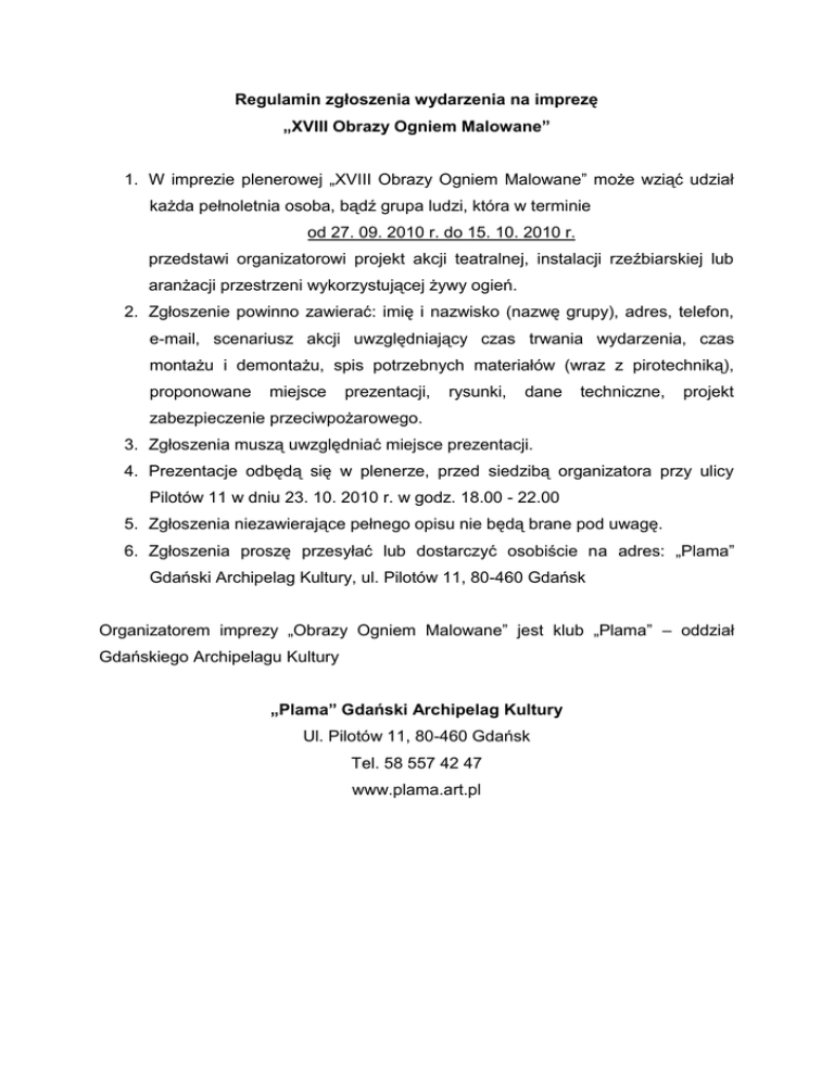 Regulamin zgłoszenia wydarzenia na imprezę „XVIII Obrazy Ogniem Malowane” 1. W imprezie plenerowej „XVIII Obrazy Ogniem Malowane” może wziąć udział każda pełnoletnia osoba, bądź grupa ludzi, która w terminie od 27. 09. 2010 r. do 15. 10. 2010 r. przedstawi organizatorowi projekt akcji teatralnej, instalacji rzeźbiarskiej lub aranżacji przestrzeni wykorzystującej żywy ogień. 2. Zgłoszenie powinno zawierać: imię i nazwisko (nazwę grupy), adres, telefon, e-mail, scenariusz akcji uwzględniający czas trwania wydarzenia, czas montażu i demontażu, spis potrzebnych materiałów (wraz z pirotechniką), proponowane miejsce prezentacji, rysunki, dane techniczne, projekt zabezpieczenie przeciwpożarowego. 3. Zgłoszenia muszą uwzględniać miejsce prezentacji. 4. Prezentacje odbędą się w plenerze, przed siedzibą organizatora przy ulicy Pilotów 11 w dniu 23. 10. 2010 r. w godz. 18.00 - 22.00 5. Zgłoszenia niezawierające pełnego opisu nie będą brane pod uwagę. 6. Zgłoszenia proszę przesyłać lub dostarczyć osobiście na adres: „Plama” Gdański Archipelag Kultury, ul. Pilotów 11, 80-460 Gdańsk Organizatorem imprezy „Obrazy Ogniem Malowane” jest klub „Plama” – oddział Gdańskiego Archipelagu Kultury „Plama” Gdański Archipelag Kultury Ul. Pilotów 11, 80-460 Gdańsk Tel. 58 557 42 47 www.plama.art.pl