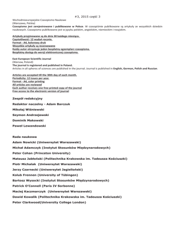 #3, 2015 część 3 Wschodnioeuropejskie Czasopismo Naukowe (Warszawa, Polska) Czasopismo jest zarejestrowane i publikowane w Polsce. W czasopiśmie publikowane są artykuły ze wszystkich dziedzin naukowych. Czasopismo publikowane jest w języku polskim, angielskim, niemieckim i rosyjskim. Artykuły przyjmowane są do dnia 30 każdego miesiąca. Częstotliwość: 12 wydań rocznie. Format - A4, kolorowy druk Wszystkie artykuły są recenzowane Każdy autor otrzymuje jeden bezpłatny egzemplarz czasopisma. Bezpłatny dostęp do wersji elektronicznej czasopisma. East European Scientific Journal (Warsaw, Poland) The journal is registered and published in Poland. Articles in all spheres of sciences are published in the journal. Journal is published in English, German, Polish and Russian. Articles are accepted till the 30th day of each month. Periodicity: 12 issues per year. Format - A4, color printing All articles are reviewed Each author receives one free printed copy of the journal Free access to the electronic version of journal Zespół redakcyjny Redaktor naczelny - Adam Barczuk Mikołaj Wiśniewski Szymon Andrzejewski Dominik Makowski Paweł Lewandowski Rada naukowa Adam Nowicki (Uniwersytet Warszawski) Michał Adamczyk (Instytut Stosunków Międzynarodowych) Peter Cohan (Princeton University) Mateusz Jabłoński (Politechnika Krakowska im. Tadeusza Kościuszki) Piotr Michalak (Uniwersytet Warszawski) Jerzy Czarnecki (Uniwersytet Jagielloński) Kolub Frennen (University of Tübingen) Bartosz Wysocki (Instytut Stosunków Międzynarodowych) Patrick O’Connell (Paris IV Sorbonne) Maciej Kaczmarczyk (Uniwersytet Warszawski) Dawid Kowalik (Politechnika Krakowska im. Tadeusza Kościuszki) Peter Clarkwood(University College London) Igor Dziedzic (Polska Akademia Nauk) Alexander Klimek (Polska Akademia Nauk) Alexander Rogowski (Uniwersytet Jagielloński) Kehan Schreiner(Hebrew University) Bartosz Mazurkiewicz (Politechnika Krakowska im. Tadeusza Kościuszki) Anthony Maverick(Bar-Ilan University) Mikołaj Żukowski (Uniwersytet Warszawski) Mateusz Marszałek (Uniwersytet Jagielloński) Szymon Matysiak (Polska Akademia Nauk) Michał Niewiadomski (Instytut Stosunków Międzynarodowych) Redaktor naczelny - Adam Barczuk 1000 kopii. Wydrukowano w «Aleje Jerozolimskie 85/21, 02-001 Warszawa, Polska» Wschodnioeuropejskie Czasopismo Naukowe Aleje Jerozolimskie 85/21, 02-001 Warszawa, Polska E-mail: [email protected] , http://eesa-journal.com/ Wschodnioeuropejskie Czasopismo Naukowe (East European Scientific Journal) # III, 2015 Spis treści NAUKI MEDYCZNE I NAUKI O ZDROWIU - МЕДИЦИНСКИЕ НАУКИ Petya Kasnakova REHABILITATION OF MYOFASCIAL PAIN SYNDROM IN OVERTENSION RELATED DISEASES .........................6 Knyazev O. V., Parfenov A.I., Konoplaynnikov A. G., Kagramanova A. V., Ruchkina I. N., Fadeeva N. A. SAFETY OF MESENHYMAL STEM CELLS THERAY IN INFLAMATORY BOWEL DEASES...................................10 Belousova M.V., Utkuzova M.A. CHILD AND GADGET. INFLUENCE ON THE SPEECH AND COMMUNICATION...................................................15 Березина Л. В., Матяш В. И., Холин В.В ИЗУЧЕНИЕ ДЕЙСТВИЯ ЭКСТРАКОРПОРАЛЬНОГО ЛАЗЕРНОГО ОБЛУЧЕНИЯ КРОВИ НА ИММУНОЛОГИЧЕСКИЕ ПОКАЗАТЕЛИ У БОЛЬНЫХ С ПОРАЖЕНИЕМ НЕРВНОЙ СИСТЕМЫ ВИРУСНОЙ ЭТИОЛОГИИ ...18 Фадєєнко Г.Д., Гріднєв О.Є. ОСОБЛИВОСТІ ПОЄДНАНОГО ПЕРЕБІГУ ГАСТРОЕЗОФАГЕАЛЬНОЇ РЕФЛЮКСНОЇ І ГІПЕРТОНІЧНОЇ ХВОРОБ В ЗАЛЕЖНОСТІ ВІД ФОРМИ ГАСТРОЕЗОФАГЕАЛЬНОЇ РЕФЛЮКСНОЇ ХВОРОБИ ................................20 Иванова О. В., Касимовская Н. А. ОЦЕНКА УДОВЛЕТВОРЕННОСТИ МЕДИЦИНСКОЙ ПОМОЩЬЮ ПАЦИЕНТАМИ, ПЕРЕНЕСШИМИ ОПЕРАЦИЮ НА СЕРДЦЕ В ФГБУ «ФЕДЕРАЛЬНЫЙ ЦЕНТР СЕРДЕЧНО-СОСУДИСТОЙ ХИРУРГИИ» МИНИСТЕРСТВА ЗДРАВООХРАНЕНИЯ РОССИЙСКОЙ ФЕДЕРАЦИИ (Г.ПЕРМЬ) И ПУТИ СОВЕРШЕНСТВОВАНИЯ МЕДИЦИНСКОЙ ПОМОЩИ.....................................................................................................................................27 Кондратюк Н. Ю., Шевченко М. В., Шестак Н. В., Ященко Ю. Б. МЕДИКО-СОЦІОЛОГІЧНИЙ МОНІТОРИНГ ФАКТОРІВ РИЗИКУ ХРОНІЧНИХ НЕІНФЕКЦІЙНИХ ЗАХВОРЮВАНЬ В УМОВАХ ВИКО-РИСТАННЯ МЕДИЧНОЇ ІНФОРМАЦІЙНОЇ СИСТЕМИ.................................................31 Кошова І. П., Степанський Д. О. ВПЛИВ КОМУНІКАЦІЇ АЕРОКОКІВ З ПАТОГЕННИМИ ТА УМОВНО-ПАТОГЕННИМИ МІКРООРГАНІЗМАМИ IN VITRO НА ЇХ БІОЛОГІЧНІ ВЛАСТИВОСТІ...............................................................................................................35 Stepanskyi D. O., Koshova I. P., Kremenchutskyi G. M. BIOTIPES OF AEROCOCCUS VIRIDANS.................................................................................................................38 Кощавцев А.Г., Краснощекова Е.И. ОСОБЕННОСТИ АНАТОМИИ МОЗОЛИСТОГО ТЕЛА МОЗГА (ПО ДАННЫМ НЕЙРОСОНОГРАФИИ) И НЕРВНО-ПСИХИЧЕСКОЕ РАЗВИТИЕ У ДЕТЕЙ С ГИПОКСИЧЕСКИ-ИШЕМИЧЕСКОЙ ЭН-ЦЕФАЛОПАТИЕЙ..............................................................................................................................................43 Павлова Т. М., Берез