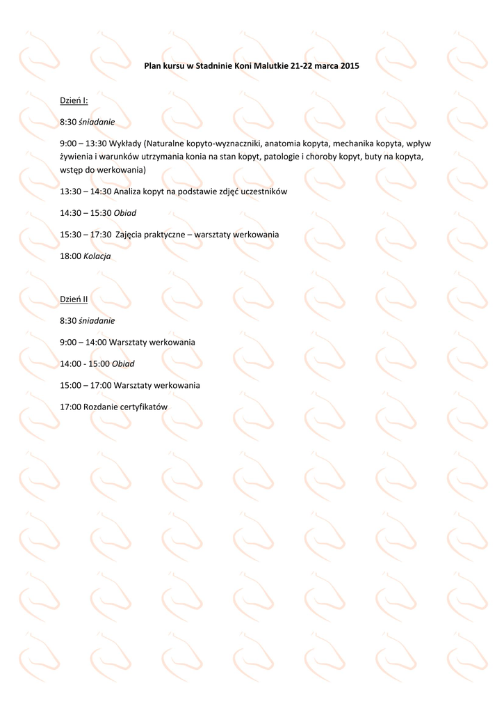 Plan kursu w Stadninie Koni Malutkie 21-22 marca 2015 Dzień I: 8:30 śniadanie 9:00 – 13:30 Wykłady (Naturalne kopyto-wyznaczniki, anatomia kopyta, mechanika kopyta, wpływ żywienia i warunków utrzymania konia na stan kopyt, patologie i choroby kopyt, buty na kopyta, wstęp do werkowania) 13:30 – 14:30 Analiza kopyt na podstawie zdjęć uczestników 14:30 – 15:30 Obiad 15:30 – 17:30 Zajęcia praktyczne – warsztaty werkowania 18:00 Kolacja Dzień II 8:30 śniadanie 9:00 – 14:00 Warsztaty werkowania 14:00 - 15:00 Obiad 15:00 – 17:00 Warsztaty werkowania 17:00 Rozdanie certyfikatów