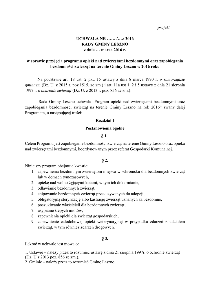 projekt UCHWAŁA NR …… /…./ 2016 RADY GMINY LESZNO z dnia … marca 2016 r. w sprawie przyjęcia programu opieki nad zwierzętami bezdomnymi oraz zapobiegania bezdomności zwierząt na terenie Gminy Leszno w 2016 roku Na podstawie art. 18 ust. 2 pkt. 15 ustawy z dnia 8 marca 1990 r. o samorządzie gminnym (Dz. U. z 2015 r. poz.1515, ze zm.) i art. 11a ust 1, 2 i 5 ustawy z dnia 21 sierpnia 1997 r. o ochronie zwierząt (Dz. U. z 2013 r. poz. 856 ze zm.) Rada Gminy Leszno uchwala „Program opieki nad zwierzętami bezdomnymi oraz zapobiegania bezdomności zwierząt na terenie Gminy Leszno na rok 2016” zwany dalej Programem, o następującej treści: Rozdział I Postanowienia ogólne § 1. Celem Programu jest zapobieganie bezdomności zwierząt na terenie Gminy Leszno oraz opieka nad zwierzętami bezdomnymi, koordynowanym przez referat Gospodarki Komunalnej. § 2. Niniejszy program obejmuje kwestie: 1. zapewnienia bezdomnym zwierzętom miejsca w schronisku dla bezdomnych zwierząt lub w domach tymczasowych, 2. opiekę nad wolno żyjącymi kotami, w tym ich dokarmianie, 3. odławianie bezdomnych zwierząt, 4. chipowanie bezdomnych zwierząt przekazywanych do adopcji, 5. obligatoryjną sterylizację albo kastrację zwierząt uznanych za bezdomne, 6. poszukiwanie właścicieli dla bezdomnych zwierząt, 7. usypianie ślepych miotów, 8. zapewnienia opieki dla zwierząt gospodarskich, 9. zapewnienie całodobowej opieki weterynaryjnej w przypadku zdarzeń z udziałem zwierząt, w tym również zdarzeń drogowych. § 3. Ilekroć w uchwale jest mowa o: 1. Ustawie – należy przez to rozumieć ustawę z dnia 21 sierpnia 1997r. o ochronie zwierząt (Dz. U z 2013 poz. 856 ze zm.). 2. Gminie – należy przez to rozumieć Gminę Leszno. 3. Programie – należy przez to rozumieć „Program opieki nad zwierzętami bezdomnymi oraz zapobiegania bezdomności zwierząt na terenie Gminy Leszno w roku 2016”. 4. Schronisku, należy przez to rozumieć Schronisko Dla Bezdomnych Zwierząt prowadzone przez Zakład Utrzymania Miasta Spółka z o.o. ul. Sobieskiego 75A, 96-100 Skierniewice. Rozdział II Zapewnienie bezdomnym zwierzętom opieki oraz zasady ich wyłapywania § 4. Zgłoszenia o zwierzętach bezdomnych na terenie gminy Leszno przyjmuje Urząd Gminy Leszno. § 5. Podmiotem uprawnionym do odławiania bezpańskich zwierząt z terenu Gminy Leszno jest Leszno – Gabinet Weterynaryjny Sp. z o.o. z siedzibą przy ul. Tuwima 29 05-084 Leszno. § 6. Bezdomne zwierzęta, które w wyniku wypadków losowych utraciły właściciela, po upływie okresu kwarantanny trwającego 14 dni, mogą zostać przekazane fundacji bądź stowarzyszeniu, których statutowym celem jest ochrona zwierząt i które zapewni im opiekę, do czasu adopcji. § 7. Zwierzętom, w celu zapewnienia im bezterminowej opieki do czasu ich adopcji, zostanie zapewnione miejsce w schronisku dla bezdomnych zwierząt lub w domach tymczasowych, które będą odpowiedzialne za właściwe żywienie, optymalne warunki bytowania, pielęgnację, socjalizację oraz stosowanie profilaktyki przeciw chorobom zakaźnym i regularną opiekę weterynaryjną. § 8. Wyznaczony pracownik Referatu Gospodarki Komunalnej Urzędu Gminy Leszno będzie monitorował sytuację zwierząt przebywających w schronisku i w domach tymczasowych, co będzie polegało na wizytach kontrolnych kilkanaście razy w roku wraz z prowadzeniem rejestru psów. § 9. Odławianie bezdomnych zwierząt będzie prowadzone przez uprawniony podmiot za pomocą specjalistycznego sprzętu, który nie będzie stwarzał zagrożenia dla życia i zdrowia zwierząt oraz nie będzie zadawał im cierpienia. Podczas akcji odłowu bezdomnych zwierząt zostanie im zapewniona pomoc weterynaryjna. Przewóz zwierząt wyłapanych będzie odbywał się właściwym środkiem transportu, wyposażonym w klatki, służące to przewożenia zwierząt. § 10. Rannym zwierzętom zostanie udzielona natychmiastowa pomoc oraz zapewniona kompleksowa opieka weterynaryjna. Rozdział III Opieka nad wolno żyjącymi kotami § 12. Opieka będzie polegać na sterylizacji i kastracji tych zwierząt oraz ich dokarmianiu w szczególnych sytuacjach tj. takich gdy brak dokarmiania będzie mógł spowodować poważne, negatywne skutki dla zdrowia zwierząt. § 13. Gmina pokrywa w całości koszty zabiegów sterylizacji kotów wolno żyjących, które przeprowadzać będą zakłady lecznicze, z którymi Gmina Leszno zawarła umowy, tj. § 14. Sterylizacja kotów wolno bytujących będzie odbywać się wyłącznie na zlecenie Gminy. § 15. Po przeprowadzeniu zabiegu koty wolno żyjące wrócą do miejsc, w których zostały odłowione, bądź trafią do adopcji. § 16. Urząd Gminy Leszno będzie prowadził rejestr opiekunów zwierząt wolno bytujących, co zapewni regularny przepływ informacji o stanie zwierząt oraz o konieczności ewentualnej pomocy weterynaryjnej. Rozdział IV Adopcja bezdomnych zwierząt § 17. Gmina będzie prowadzić poszukiwania nowych opiekunów dla psów i kotów poprzez prowadzenie akcji adopcyjnej bezdomnych zwierząt wyłapanych z terenu Gminy, prowadzonej między innymi za pośrednictwem strony internetowej Gminy Leszno. § 18. Gmina będzie współpracować w sprawach związanych z adopcją z fundacjami oraz stowarzyszeniami, których statutowym celem jest ochrona zwierząt, mediami lokalnymi, domami tymczasowymi, osobami fizycznymi, lecznicami weterynaryjnymi oraz z Zakładem Utrzymania Miasta Spółka z o.o. z siedzibą w Skierniewicach. § 19. Gmina będzie prowadzić akcje mające na celu promocje adopcji bezpańskich zwierząt, poprzez umieszczanie ogłoszeń na tablicach, drukowanie ulotek i plakatów oraz publikacje na stronie internetowej i profilach społecznościowych. Rozdział V Usypianie ślepych miotów § 20. Usypianie ślepych miotów będzie finansowane w całości przez Gminę. § 21. Usypianie ślepych miotów dotyczyć będzie zarówno zwierząt bezdomnych jak i posiadających w