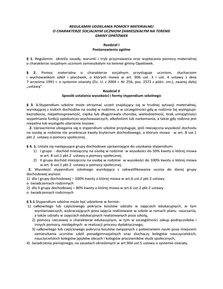 REGULAMIN UDZIELANIA POMOCY MATERIALNEJ O CHARAKTERZE SOCJALNYM UCZNIOM ZAMIESZKAŁYM NA TERENIE GMINY OPATÓWEK Rozdział I Postanowienia ogólne § 1. Regulamin określa zasady, warunki i tryb przyznawania oraz wypłacania pomocy materialnej o charakterze socjalnym uczniom zamieszkałym na terenie gminy Opatówek. § 2. Pomoc materialna o charakterze socjalnym przysługuje uczniom, słuchaczom i wychowankom szkół i placówek, o których mowa w art. 90b ust. 3 i ust. 4 ustawy z dnia 7 września 1991 r. o systemie oświaty (Dz. U. z 2004 r. Nr 256, poz. 2572 z późn. zm.), zwanej dalej „ustawą”. Rozdział II Sposób ustalania wysokości i formy stypendium szkolnego § 3. 1.Stypendium szkolne może otrzymać uczeń znajdujący się w trudnej sytuacji materialnej, wynikającej z niskich dochodów na osobę w rodzinie, a w szczególności gdy w rodzinie tej występuje: bezrobocie, niepełnosprawność, ciężka lub długotrwała choroba, wielodzietność, brak umiejętności wypełniania funkcji opiekuńczo-wychowawczych, alkoholizm lub narkomania, a także gdy rodzina jest niepełna lub wystąpiło zdarzenie losowe. 2. Uprawnienie ubiegania się o stypendium szkolne przysługuje, jeśli miesięczna wysokość dochodu na osobę w rodzinie nie przekracza kwoty kryterium dochodowego, o którym mowa w art. 8 ust.1 pkt.2 ustawy o pomocy społecznej. § 4. 1. Ustala się następujące grupy dochodowe uprawniające do uzyskania stypendium: 1) I grupa - dochód miesięczny na osobę w rodzinie w wysokości do 50% kwoty o której mowa w art. 8 ust.1 pkt.2 ustawy o pomocy społecznej. 2) II grupa dochód miesięczny na osobę w rodzinie w wysokości do 100% kwoty o której mowa w art. 8 ust.1 pkt.2 ustawy o pomocy społecznej. 2. Wysokość stypendium szkolnego wynikająca z zakwalifikowania ucznia do danej grupy dochodowej wynosi: 1) dla I grupy dochodowej – 100% kwoty o której mowa w art.6 ust.2 pkt.2 ustawy o świadczeniach rodzinnych 2) dla II grupy dochodowej – 80% kwoty o której mowa w art.6 ust.2 pkt.2 ustawy o świadczeniach rodzinnych § 5.1.Stypendium szkolne może być udzielone w formie: 1) całkowitego lub częściowego pokrycia kosztów udziału w zajęciach edukacyjnych, w tym wyrównawczych, wykraczających poza zajęcia realizowane w szkole w ramach planu nauczania, a także udziału w zajęciach edukacyjnych realizowanych poza szkolą, 2) pomocy rzeczowej o charakterze edukacyjnym, w tym w szczególności zakup podręczników i innych pomocy, niezbędnych w realizacji procesu dydaktycznego, 3) całkowitego lub częściowego pokrycia kosztów związanych z pobieraniem nauki poza miejscem zamieszkania uczniów szkół ponadgimnazjalnych oraz słuchaczy kolegiów nauczycielskich, nauczycielskich kolegiów języków obcych i kolegiów pracowników służb społecznych, 4) świadczenia pieniężnego, na zasadach określonych w art.90d ust.5 ustawy o systemie oświaty. Rozdział III Tryb i sposób udzielania stypendium szkolnego § 6. 1. Warunkiem ubiegania się stypendium szkolne jest złożenie wniosku w Gminnym Ośrodku Pomocy Społecznej w Opatówku, zgodnie z wzorem stanowiącym załącznik nr 1 do niniejszego Regulaminu w terminie do dnia: a. 15 września danego roku szkolnego, b. 15 października danego roku szkolnego w przypadku słuchaczy kolegiów nauczycielskich, nauczycielskich kolegów języków obcych i kolegiów pracowników służb społecznych. 2.Do wniosku należy dołączyć: a. zaświadczenia dokumentujące wysokość dochodu rodziny wnioskodawcy, b. zaświadczenie o uczęszczaniu ucznia do danej szkoły. § 7.1. Stypendium szkolne udzielone w formie o której mowa w §5 ust.1 pkt. 1 i 3 regulaminu będzie przekazywane rodzicom, opiekunom prawnym lub pełnoletniemu uczniowi jako częściowa lub całkowita refundacja kosztów poniesionych i udokumentowanych rachunkami lub fakturami, dotyczącymi dofinansowanych kosztów zakupu bądź opłat. 2. Stypendium szkolne udzielone w formie o której mowa w §5 ust.1 pkt. 2 regulaminu będzie realizowane poprzez zakup i przekazanie za potwierdzeniem pomocy rzeczowej. 3. Stypendium szkolne udzielone w formie świadczeniapieniężnego wypłaca się w Kasie Banku Spółdzielczego Ziemi Kaliskiej Oddział w Opatówku lub przelewem na rachunek oszczędnościoworozliczeniowy rodziców, opiekuna prawnego ucznia lub pełnoletniego ucznia, bez uprzedniego dostarczenia przez stronę rachunków lub faktur potwierdzających dokonanie zakupów. Rozdział IV Tryb i sposób udzielania zasiłku szkolnego § 8. 1.Zasiłek szkolny przyznaje się w formie świadczenia pieniężnego na pokrycie wydatków związanych z procesem edukacyjnym lub w formie rzeczowej o charakterze edukacyjnym raz lub kilka razy w roku, niezależnie od otrzymywanego stypendium szkolnego. 2. O zasiłek szkolny może ubiegać się uczeń znajdujący się przejściowo w trudnej sytuacji materialnej z powodu zdarzenia losowego, w tym w szczególności z powodu: a. śmierci lub nagłej choroby jednego lub obojga rodziców, b. utraty lub zniszczenia lokalu mieszkalnego rodziny ucznia, c. ciężkiego wypadku lub nagłej choroby ucznia, d. innych zdarzeń losowych. 3. Warunkiem ubiegania się o zasiłek szkolny jest złożenie wniosku w Gminnym Ośrodku Pomocy Społecznej w Opatówek w terminie nie dłuższym niż dwa miesiące od wystąpienia zdarzenia losowego uzasadniającego przyznanie tego zasiłku, według wzoru stanowiącego załącznik nr 2. 4. Do wniosku należy dołączyć dokumenty i wyjaśnienia potwierdzające wystąpienie zdarzenia uzasadniającego przyznanie tego zasiłku. 5. Zasiłek szkolny przyznaje się oceniając indywidualną sytuację materialną i życiową ucznia. Rozdział V Postanowienia końcowe § 9. 1. Regulamin wchodzi w życie z dniem określonym w uchwale Rady Gminy Opatówek. 2. Zmiana Regulaminu może nastąpić w trybie przewidzianym dla jego przyjęcia.