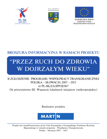 BROSZURA INFORMACYJNA W RAMACH PROJEKTU “PRZEZ RUCH DO ZDROWIA W DOJRZAŁYM WIEKU“ II ZGŁOSZENIE PROGRAMU WSPÓŁPRACY TRANSGRANICZNEJ POLSKA – SŁOWACJA 2007 – 2013 nr PL-SK/ZA/IPP/II/067 Oś priorytetowa III. Wsparcie lokalnych inicjatyw (mikroprojekty) Realizator projektu Projekt jest współfinansowany przez Unie Europejską z Europejskiego Funduszu Rozwoju Regionalnego w ramach programu Współpracy Transgranicznej Polska – Słowacja 2007 – 2013 INFORMACJE O PROJEKCIE: Miasto Martin pod względem ilości mieszkańców jest drugim co do wielkości miastem w województwie żilińskim. Struktura demograficzna pokazuje, że duży odsetek mieszkańców to osoby, które osiągnęły wiek ponad 55 lat. Podczas organizowanych imprez oraz w ciągu tzw. Tygodnia Seniorów okazało się, że w Martinie brak jest obiektów sportowych przeznaczonych dla osób z wyższej kategorii wiekowej oraz innych grup wiekowych. Regularne ćwiczenie i zdrowy tryb życie jest niezbędnym warunkiem przedłużenia aktywnego życia seniorów. To właśnie aktywność fizyczna pomaga uniknąć wielu chorób i problemów zdrowotnych. W celu polepszenia aktywności osób starszych miasto Martin wraz z polskim partnerem Towarzystwem Przyjaciół z Bielska-Białej złożyło podanie o projekt w ramach drugiego zgłoszenia Programu Współpracy Transgranicznej Polska – Słowacja 2007 – 2013: „Przez ruch do zdrowia w dojrzałym wieku“ W 2011 roku projekt został zatwierdzony pod numerem PL-SK/ZA/IPP/II/067). Miasto Martin rozpoczęło jego realizacje w czerwcu 2011 roku. Koszty projektu zostaną pokryte przez Europejski Fundusz Rozwoju Regionalnego (85 %), budżet państwa (10 %) i budżet miasta Martin (5 %). Projekt ma na celu ukazanie ludziom w starszym wieku jak prawidłowo powinno się zdrowo żyć, korzyści wynikające z odpowiedniej aktywności fizycznej, a tym samym przyczynić się do wzrostu aktywności fizycznej. Projekt obejmuje również budowę „Ścieżki zdrowia”. Proponowana trasa o długości 500 m znajduje się na obrzeżach miasta Martin, która będzie częścią sportowego boiska szkoły podstawowej przy ulicy Východniej. Scieżka zdrowia będzie publicznie dostępna, przeznaczona do chodzenia, biegania i realizacjii rekreacyjnych ćwiczeń fizycznych na wyznaczonych do tego odcinkach. Ścieżka tworzy zamknięty obwód, starannie wyznaczony na pochyłym terenie, tak aby wyeliminować wycinkę stojących tam drzew i krzewów. Planuje się zarówno dopełnienie ścieżki poprzez zasadzenie lokalnych gatunków drzew i krzewów, które ustabilizują zbocza i dopełnią środowisko naturalne terenu. Konstrukcja całej ścieżki zdrowia wykonana będzie z naturalnych materiałow. Ponadto oprócz ścieżki zdrowia w ramach projektu zostaną opublikowane informacje w postaci elektronicznej na internete, a także informacyjnej broszurki na temat zdrowego stylu życia oraz potrzeby aktywności fizycznej w dojrzałym wieku. Planowane jest również zorganizowanie dwóch wykładów na powyższe tematy. Uczestnicy będą mieli możliwość w ramach wykładów wykonać niektóre badania zdrowotne. SŁOWO WSTĘPNE LEKARZA REHABILITACJI: Zapytano się raz ludzi, którzy osiągnęli wiek 100 lat, o ich styl życiowy i po przeanalizowaniu wszytkich odpowiedzi stwierdzono jeden wspólny czynnik: wszyscy zaznaczali, że podczas całego życia dużo chodzili. Tak samo nasi przodkowie wszędzie przemieszczali się zazwyczaj pieszo, nie mieli tylu środków transportu, co miało bardzo dobry wpływ na ich zdrowie. Intersujące jest to, że pozytywne czynniki w style życia prostych ludzi potwierdzają także dzisiejsze badania. Nowoczesna medycyna zaleca ruch jako środek zapobiegawczy, jak równiej jako element leczenia różnych chorób. Dlatego zdrowy styl życia mielibyśmy propagować w każdym wieku, ruch miałby stać się naszym nawykiem i mielibyśmy uczyć nasze dzieci od najmłodszych lat jak aktywnie i zdrowo żyć. Regularny i odpowiednio dobrany ruch fizyczny, niezależnie od naszego wieku, jest bardzo ważny. Nasz system ruchowy - mięśnie, ścięgna, kości i stawy – potrzebują go, aby sprawnie funkcjonować. Regularne i odpowiednie ćwiczenia obciążające sprawiąją że nas systemsię wzmacnia, ćwiczenia naciągające mają wpływ na poleprzenie koordynacjii. „Koncert“ dobrze zakomponowanych i wzajemnie dopełniających się aktywności fizycznych pomaga utrzymać nasz kręgosłup i kości w dobrym, bezpolesnym stanie, zapobiega powstawaniu osteoporozy (kruchość kości), starnięciu i artrozie stawów, chroni nas przed niepotrzebnymi urazami i upadkami, które są najczęstrzą przyczyną złamań w starszym wieku, mogących prowadzić do dalszych moplikacji zdrowotnych. Korzystne efekty mogą zostać osiągnięte przez proste, znane ćwiczenia fizyczne. Niektóre metody treningu kładą nacisk również na świadomość ruchu (świadomy monitoring) oraz na prawidłowe oddychanie, co ma relaksacyjny i regenerujący wpływ na ciało. Do takich ćwiczeń należą na przykład: joga, tai-chi i tym podobne. Nasza dobra kondycja ma też związek z tym, czy efektywnie wykorzystujemy tlen w naszych tkankach. W celu poprawy wydajności układu krążenia, oprócz tych czynności, zaleca się regularne spacery (pół godziny, trzy razy w tygodniu), jogging, jazde na rowerze, pływanie i tak dalej. W ciele osoby prowadzącej taki aktywny styl życia zwiększa się metabolizm w tkankach, co przejawia się także w optymalizacji (zwykle zmniejszenia) wagi ciała. Nadwaga jest współczesną epidemią, która idzie w parze z wysokim ciśnieniem krwi, cukrzycą, chorobami serca i centralnego układu nerwowego. Regularna aktywność fizyczna może zapobiegać lub wspierać leczenia wielu z tych poważnych chorób, które obecnie objawiają się nie tylko u osób w starszym wieku, ale także u mlodszych grup wiekowych. Dla każdego z nas zdrowie jest bardzo ważne. Bez niego tru