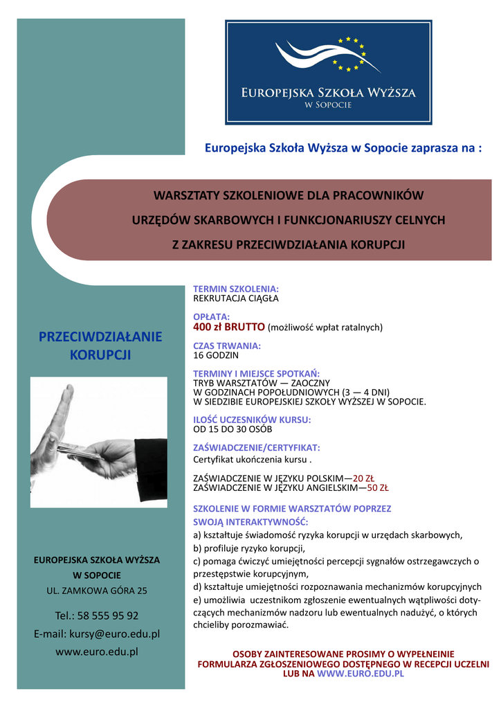Europejska Szkoła Wyższa w Sopocie zaprasza na : WARSZTATY SZKOLENIOWE DLA PRACOWNIKÓW URZĘDÓW SKARBOWYCH I FUNKCJONARIUSZY CELNYCH Z ZAKRESU PRZECIWDZIAŁANIA KORUPCJI TERMIN SZKOLENIA: REKRUTACJA CIĄGŁA OPŁATA: PRZECIWDZIAŁANIE KORUPCJI 400 zł BRUTTO (możliwość wpłat ratalnych) CZAS TRWANIA: 16 GODZIN TERMINY I MIEJSCE SPOTKAŃ: TRYB WARSZTATÓW — ZAOCZNY W GODZINACH POPOŁUDNIOWYCH (3 — 4 DNI) W SIEDZIBIE EUROPEJSKIEJ SZKOŁY WYŻSZEJ W SOPOCIE. ILOŚĆ UCZESNIKÓW KURSU: OD 15 DO 30 OSÓB ZAŚWIADCZENIE/CERTYFIKAT: Certyfikat ukończenia kursu . ZAŚWIADCZENIE W JĘZYKU POLSKIM—20 ZŁ ZAŚWIADCZENIE W JĘZYKU ANGIELSKIM—50 ZŁ EUROPEJSKA SZKOŁA WYŻSZA W SOPOCIE UL. ZAMKOWA GÓRA 25 Tel.: 58 555 95 92 E-mail: [email protected] www.euro.edu.pl SZKOLENIE W FORMIE WARSZTATÓW POPRZEZ SWOJĄ INTERAKTYWNOŚĆ: a) kształtuje świadomość ryzyka korupcji w urzędach skarbowych, b) profiluje ryzyko korupcji, c) pomaga ćwiczyć umiejętności percepcji sygnałów ostrzegawczych o przestępstwie korupcyjnym, d) kształtuje umiejętności rozpoznawania mechanizmów korupcyjnych e) umożliwia uczestnikom zgłoszenie ewentualnych wątpliwości dotyczących mechanizmów nadzoru lub ewentualnych nadużyć, o których chcieliby porozmawiać. OSOBY ZAINTERESOWANE PROSIMY O WYPEŁNEINIE FORMULARZA ZGŁOSZENIOWEGO DOSTĘPNEGO W RECEPCJI UCZELNI LUB NA WWW.EURO.EDU.PL